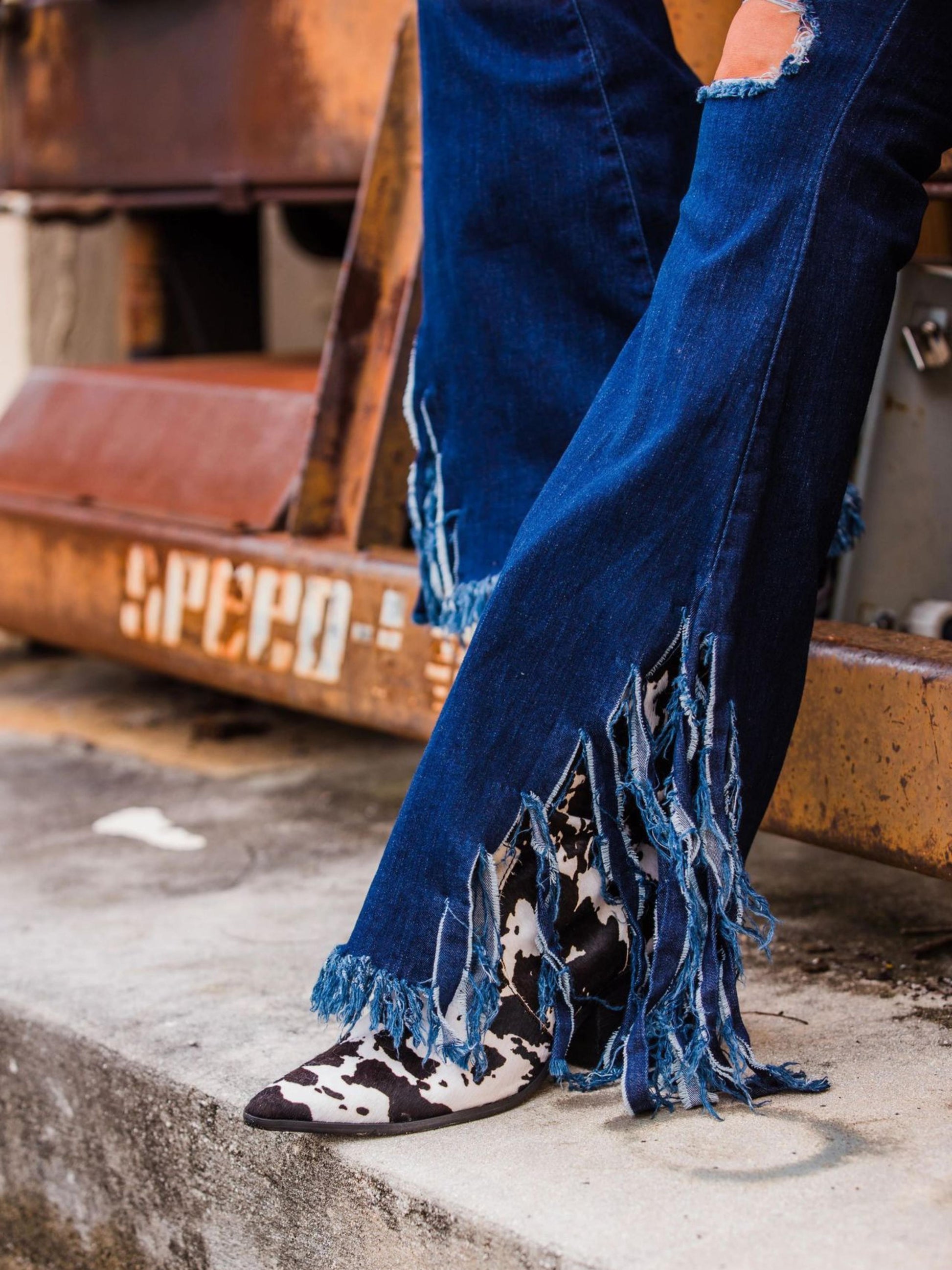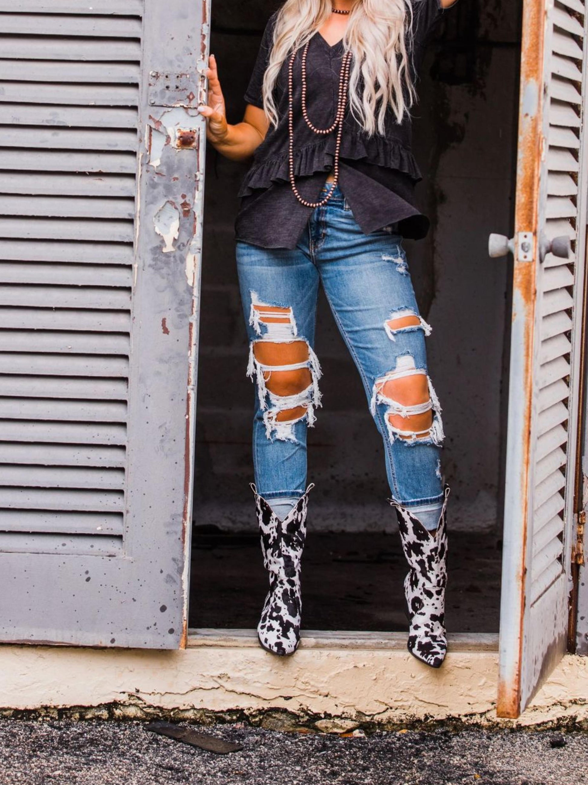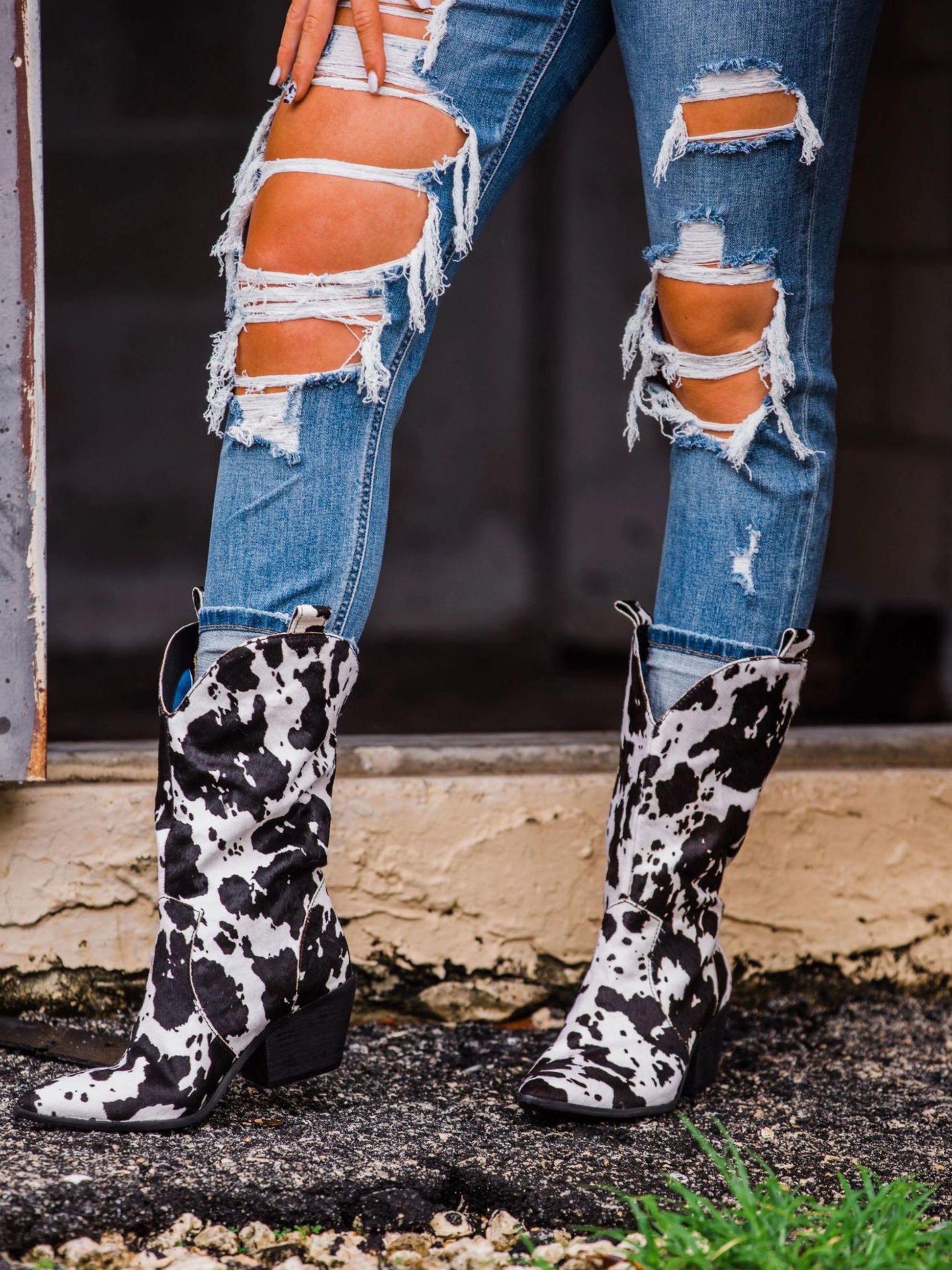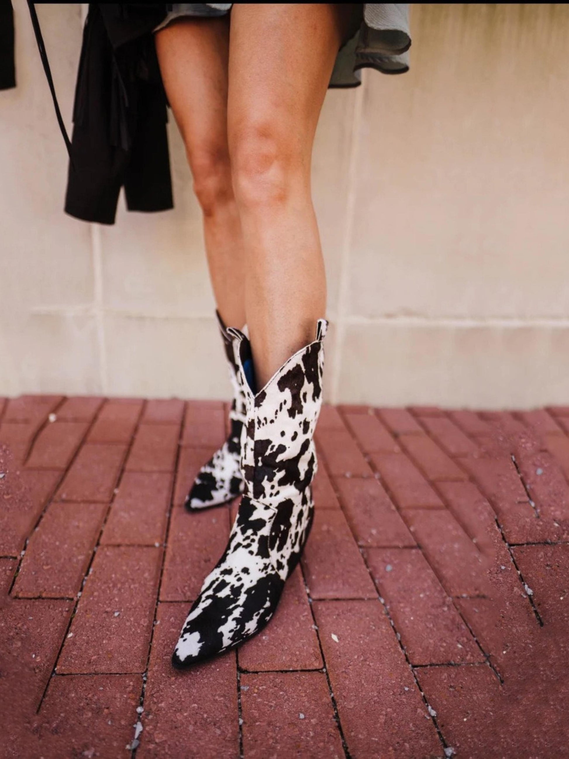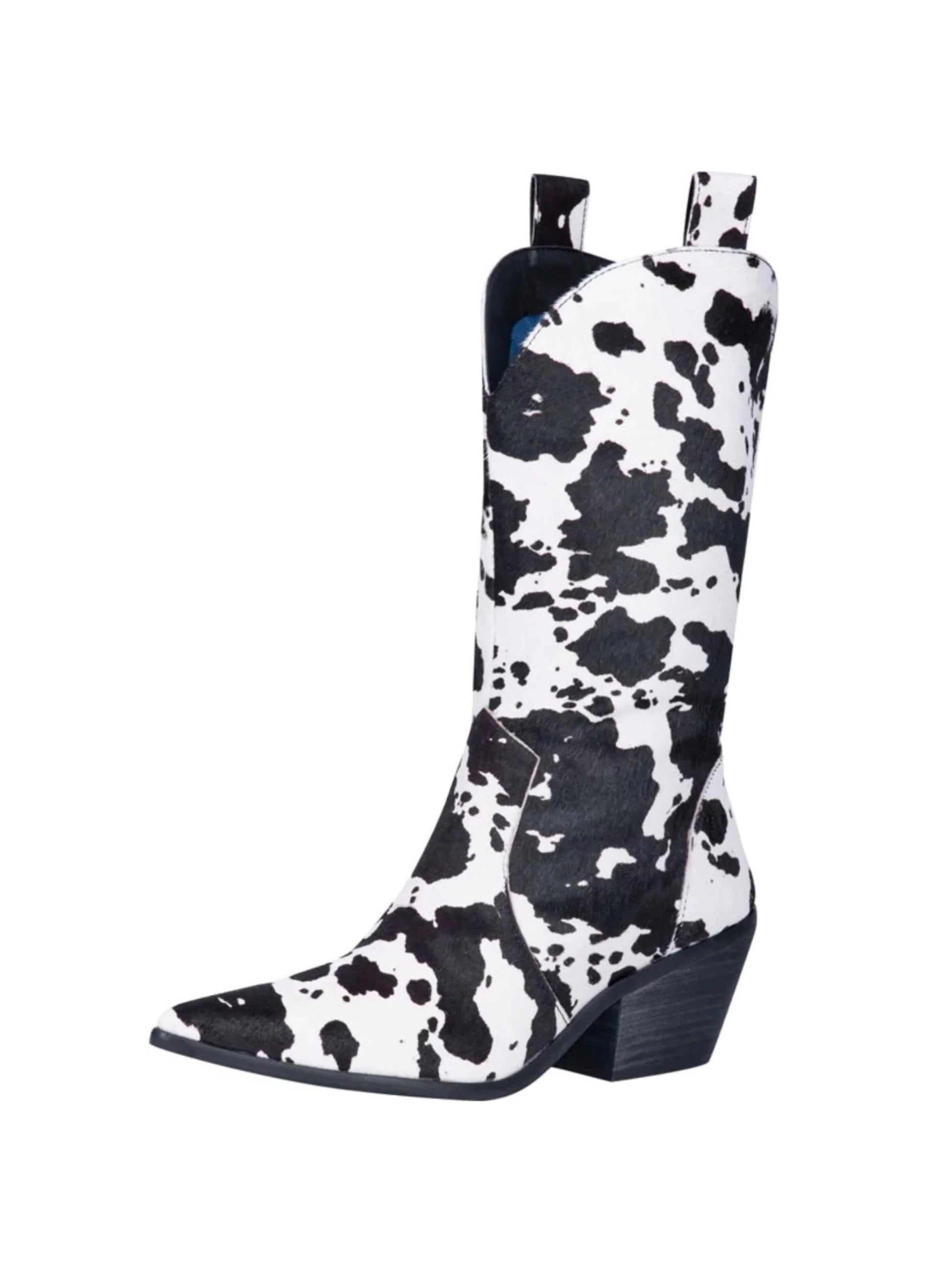 Striking black and white fur cowgirl boots featuring authentic cow pattern print with wide calf design for comfortable fit. Classic Western styling with natural texture appeal. Perfect for curvy legs and embracing bold ranch-inspired fashion.