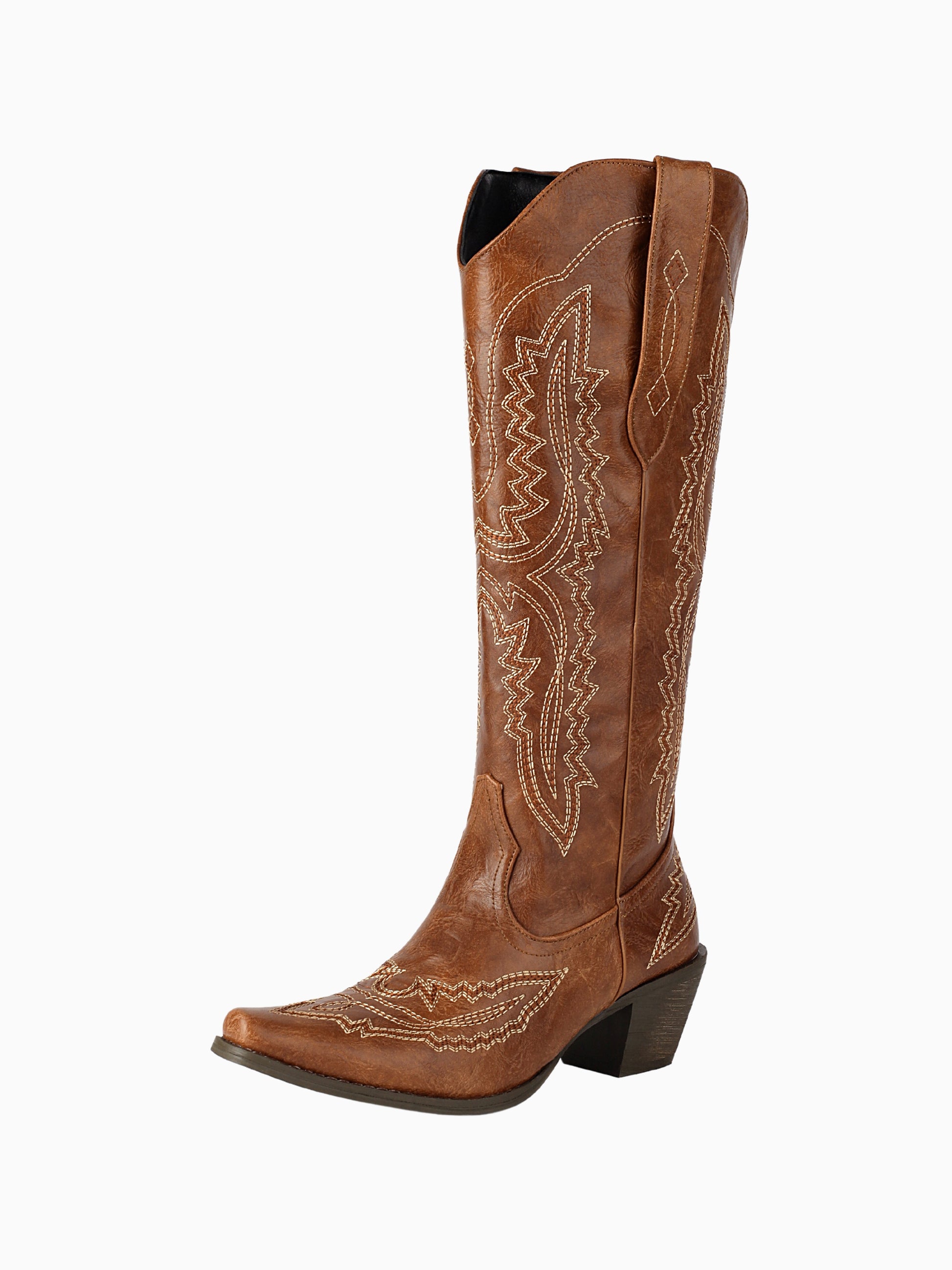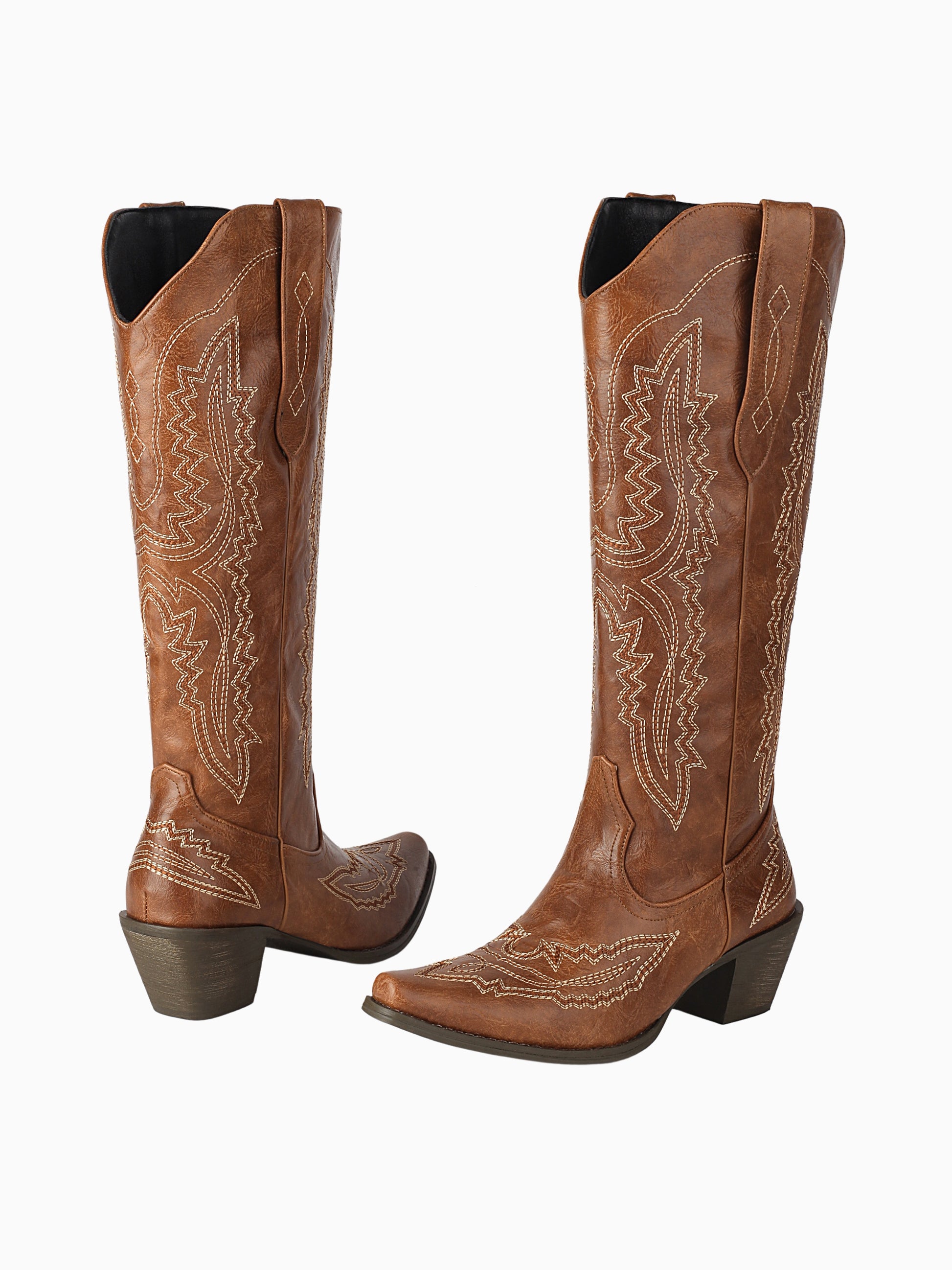 The elegant knee-high cowgirl boots in a rich dark brown showcase an intricate embroidered design, blending classic Western style with refined, southwestern-inspired sophistication.
