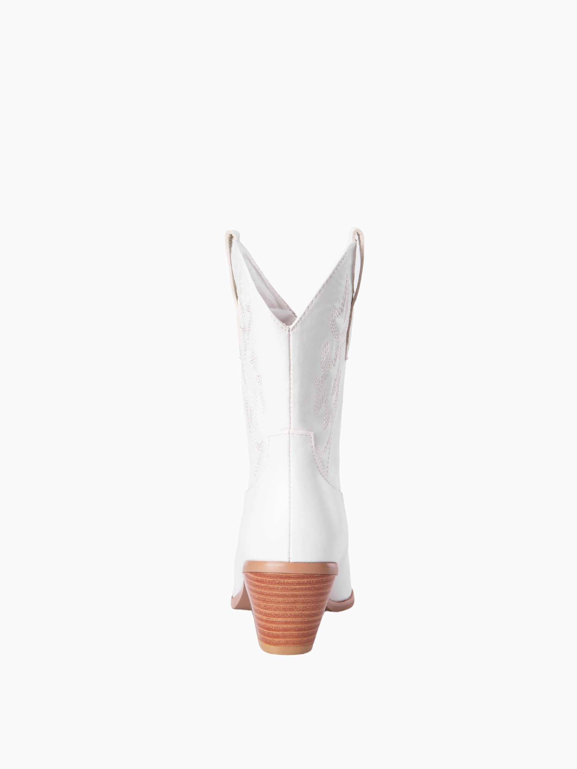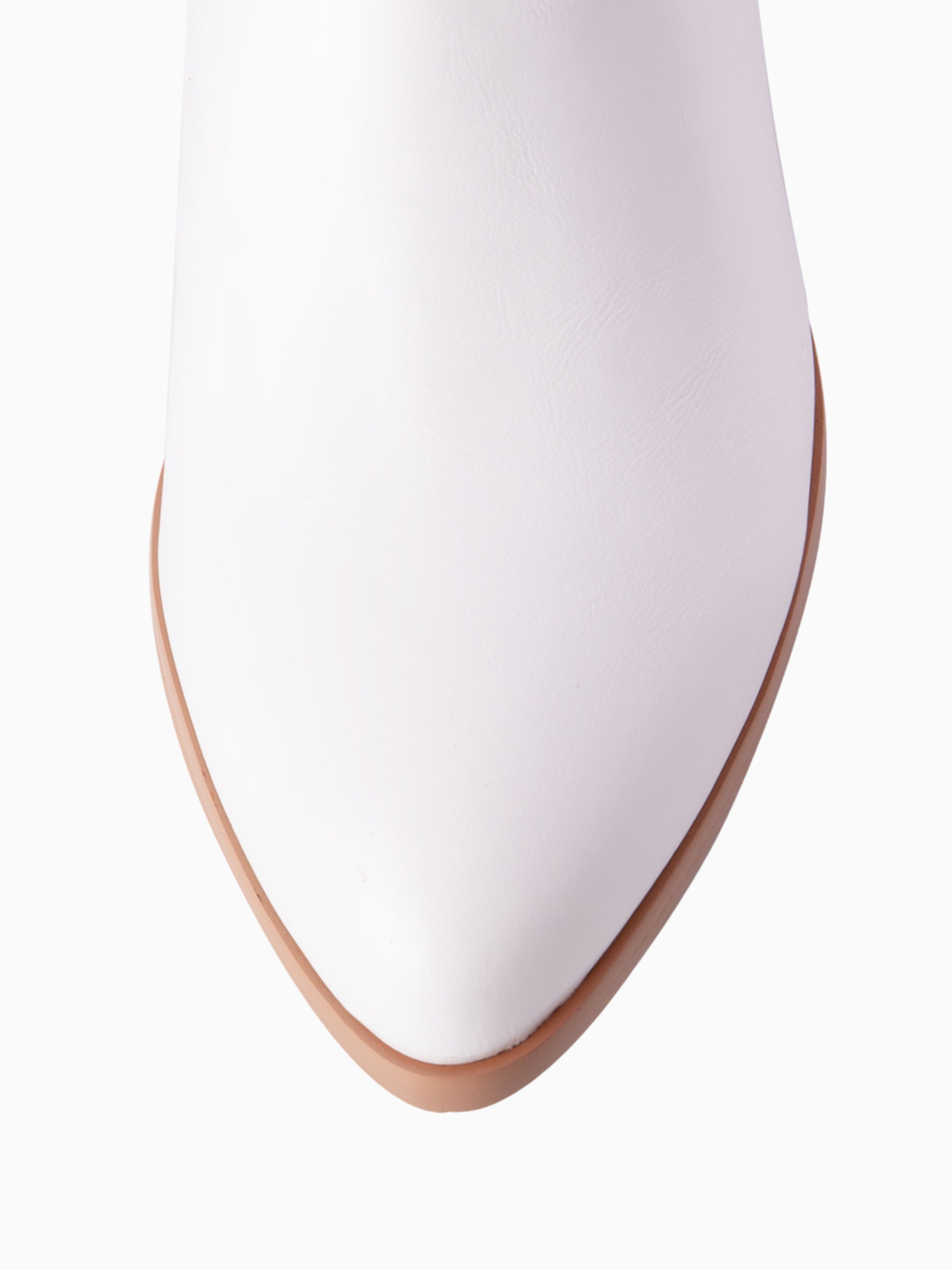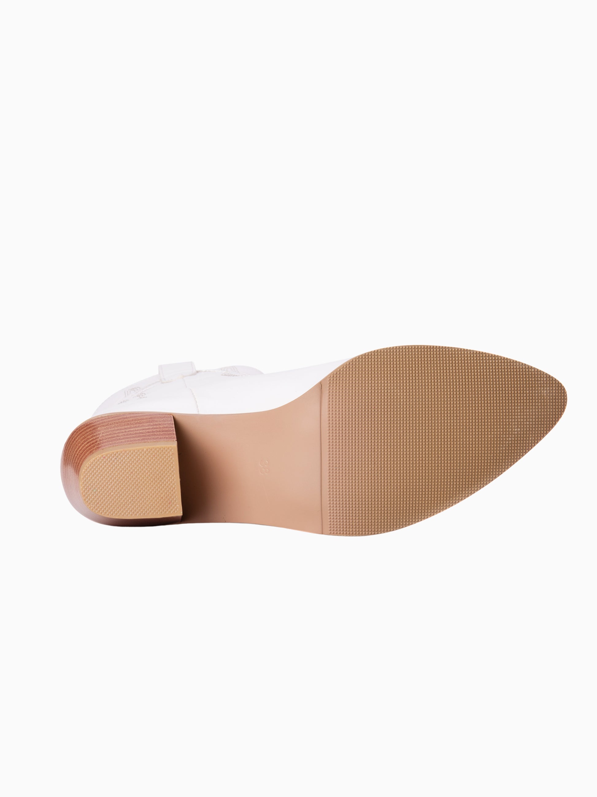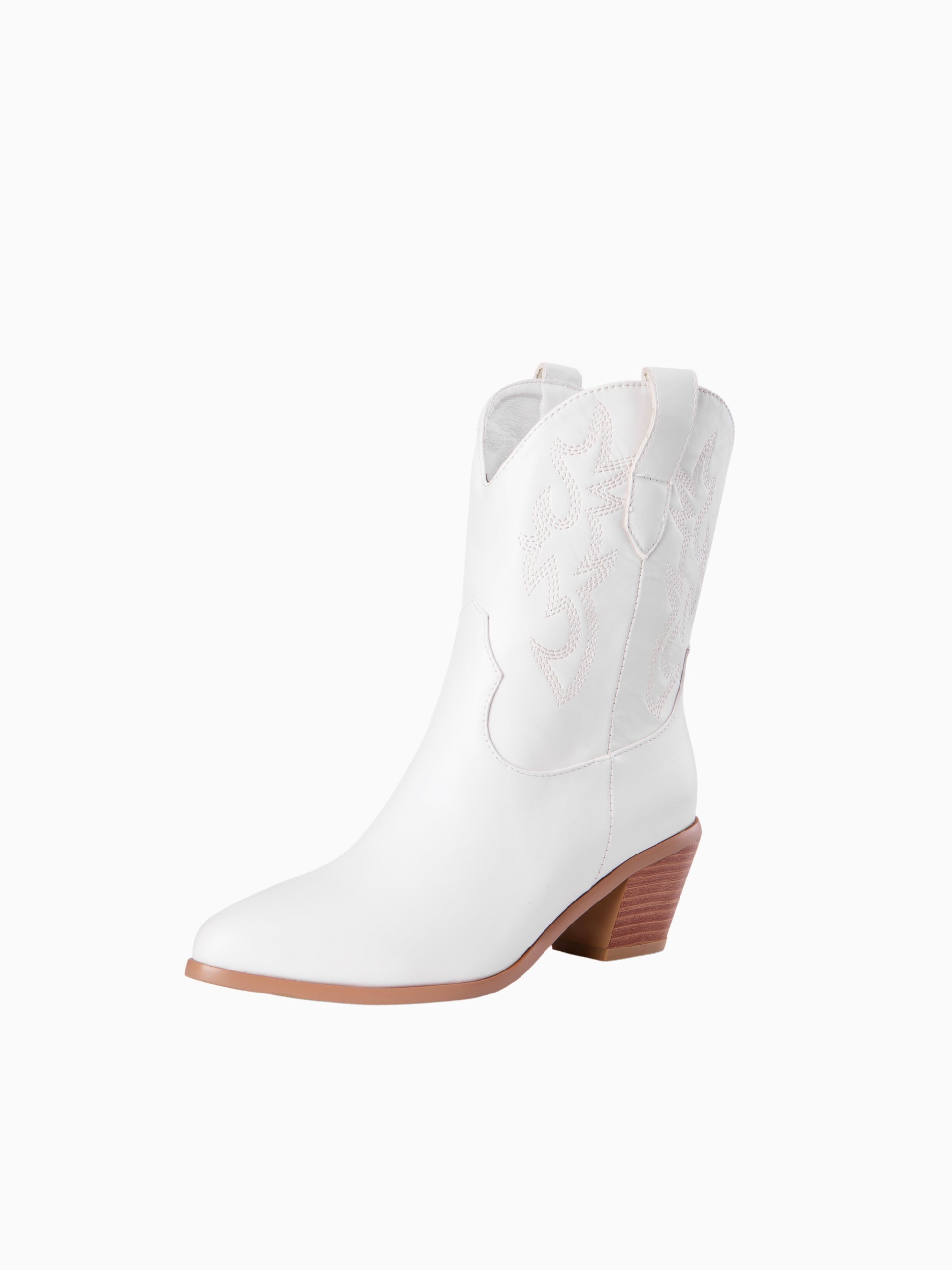 Modern white ankle cowgirl boots featuring subtle Western stitching and stacked heel, perfect for a contemporary urban-Western fusion style.