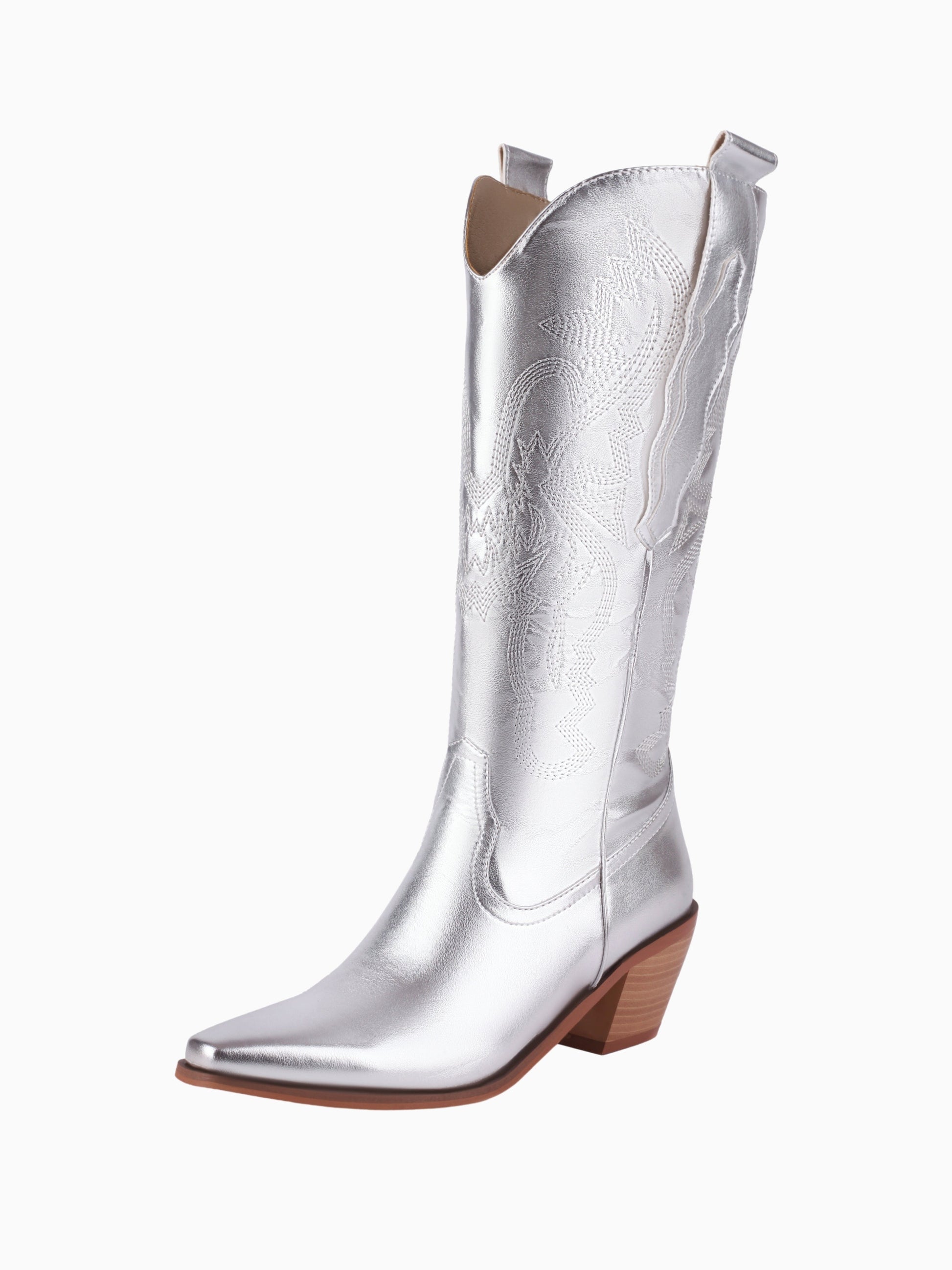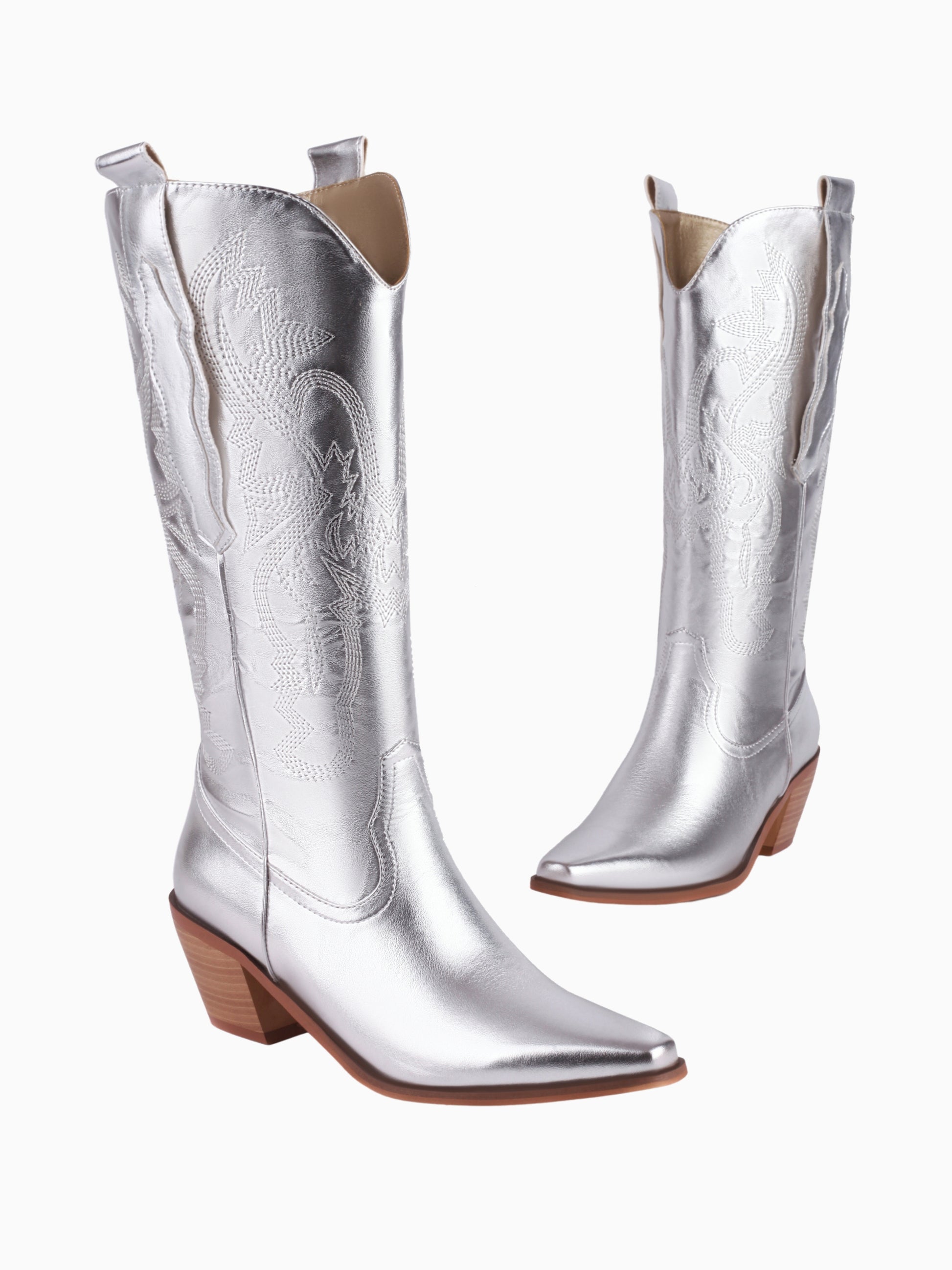 Sleek metallic silver Western boots with intricate embroidered patterns, snip toe, and stacked heel - a perfect blend of classic cowgirl and modern glamour.