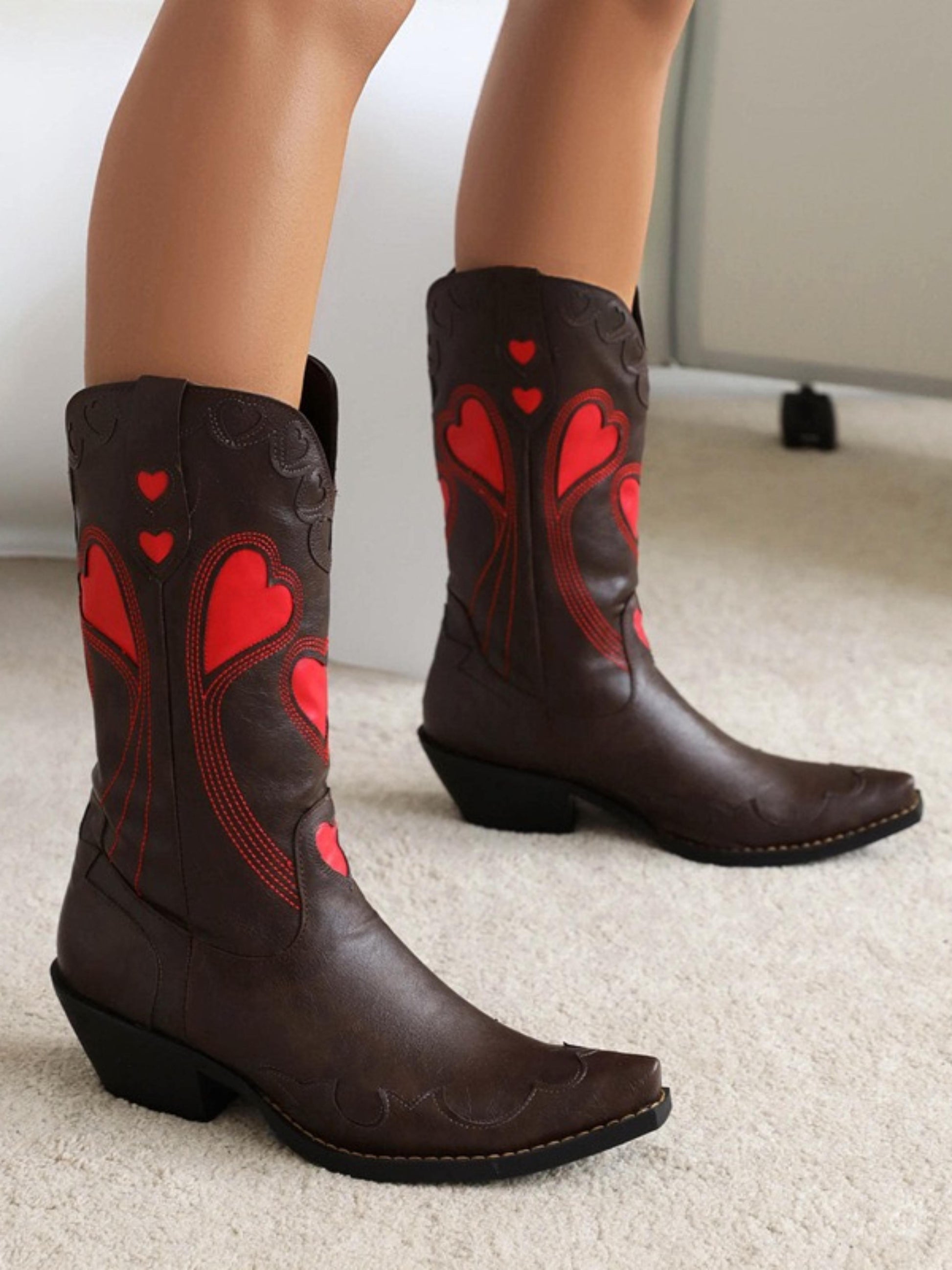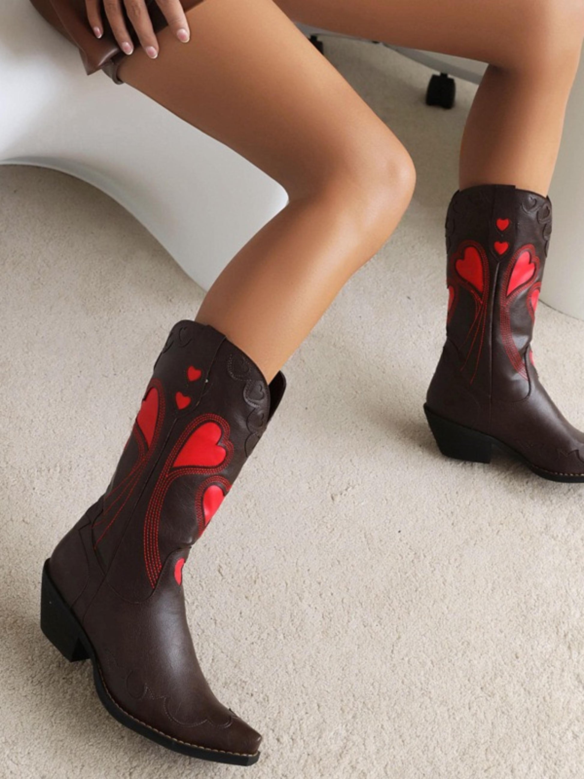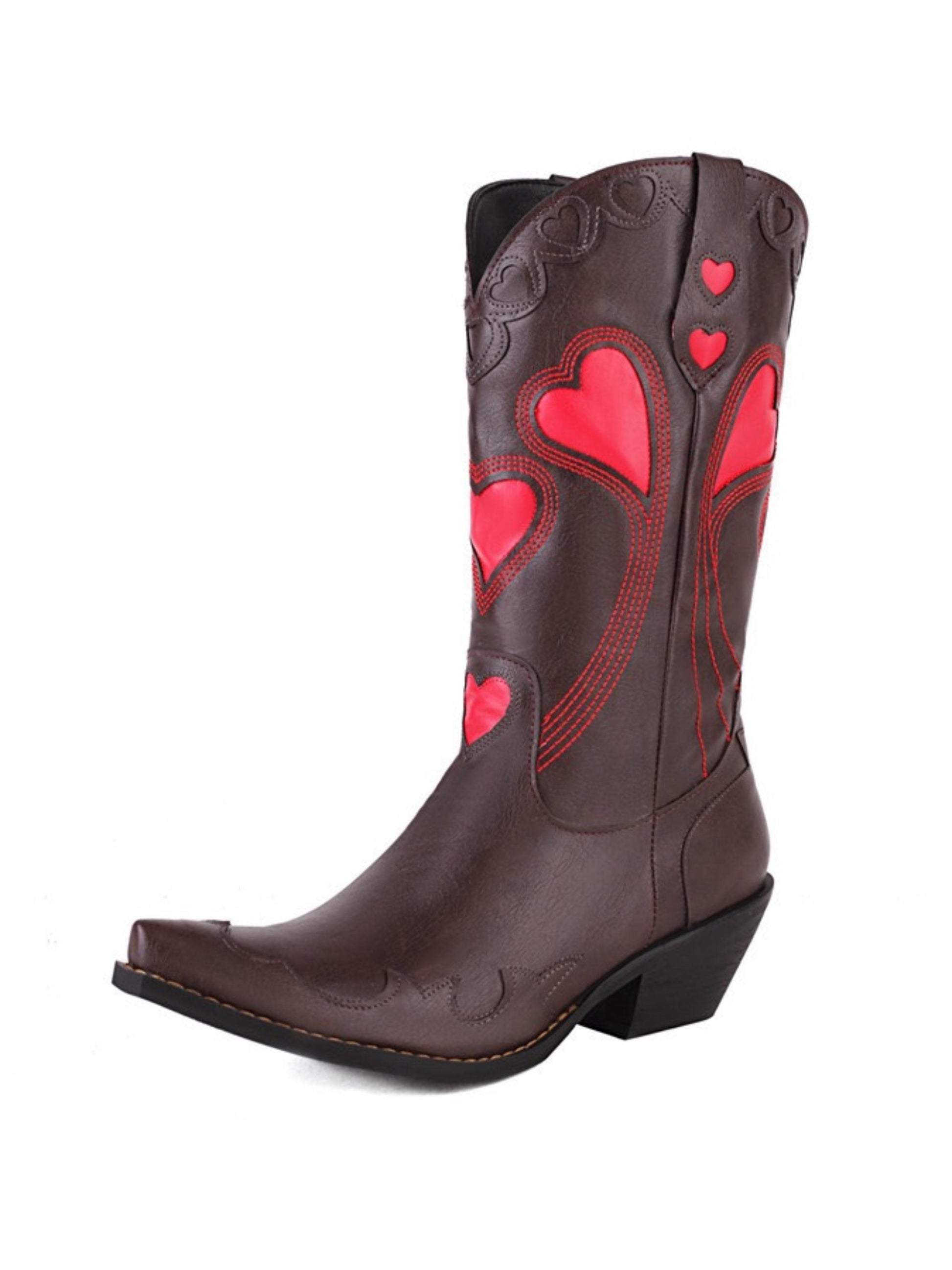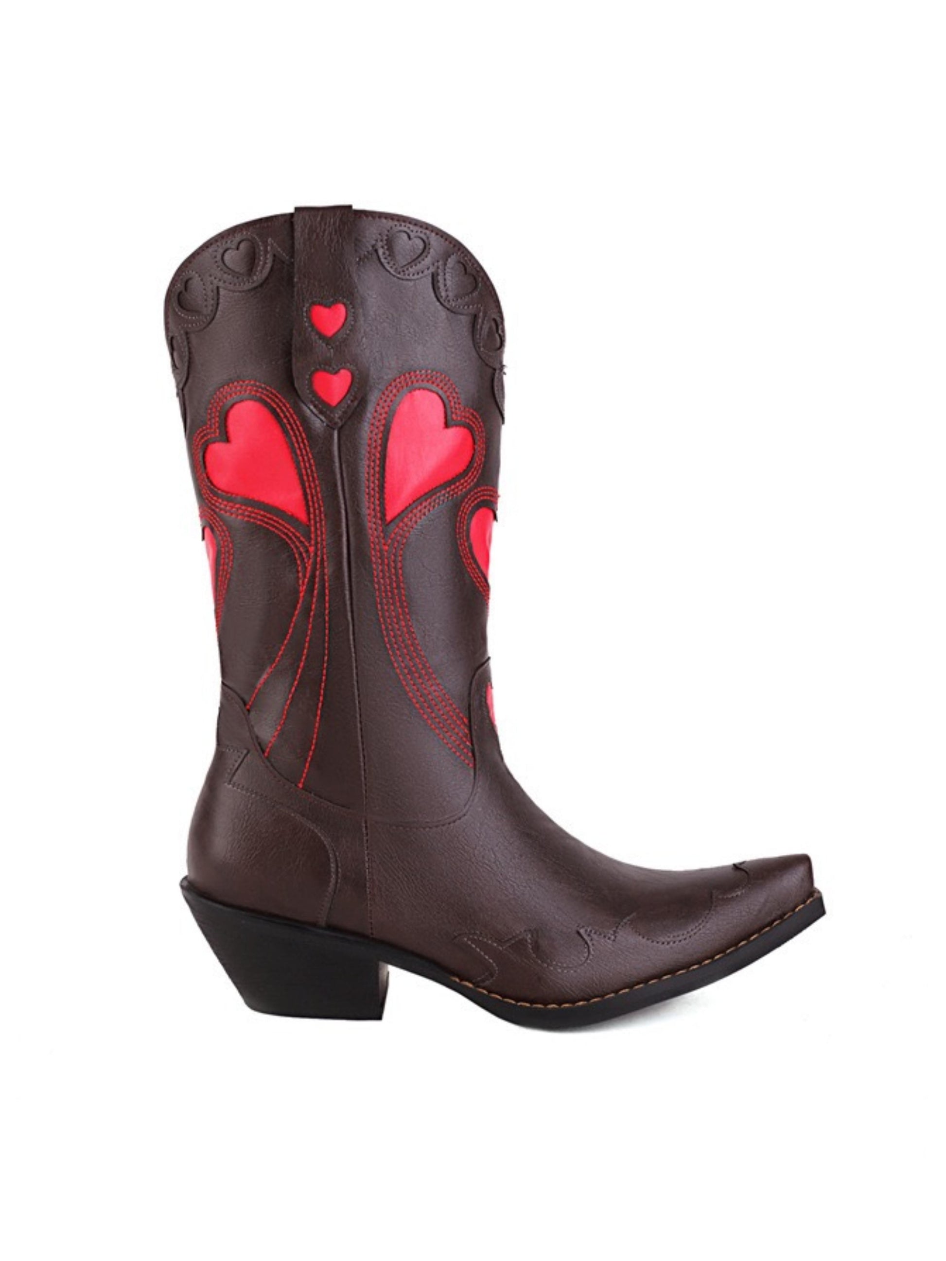 These captivating cowgirl boots feature a rich chocolate brown base adorned with striking red heart inlays that create an eye-catching contrast. The deep, warm brown tone is the perfect backdrop for the vibrant crimson hearts.