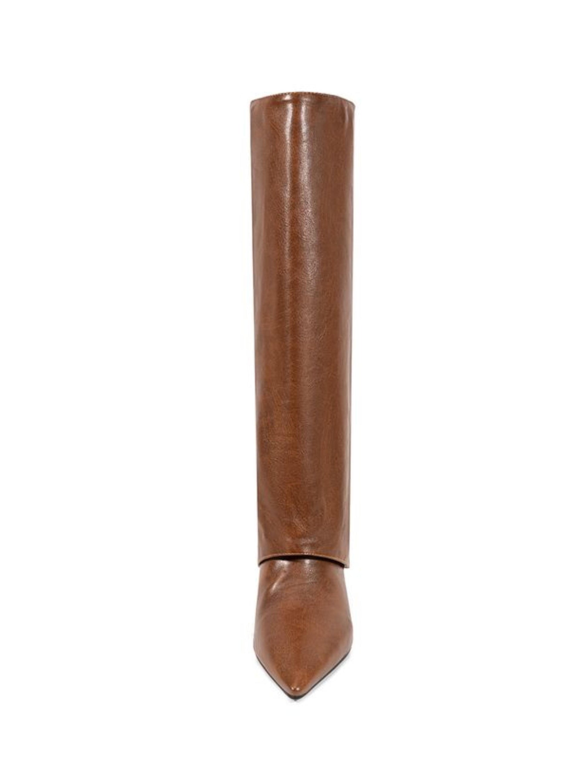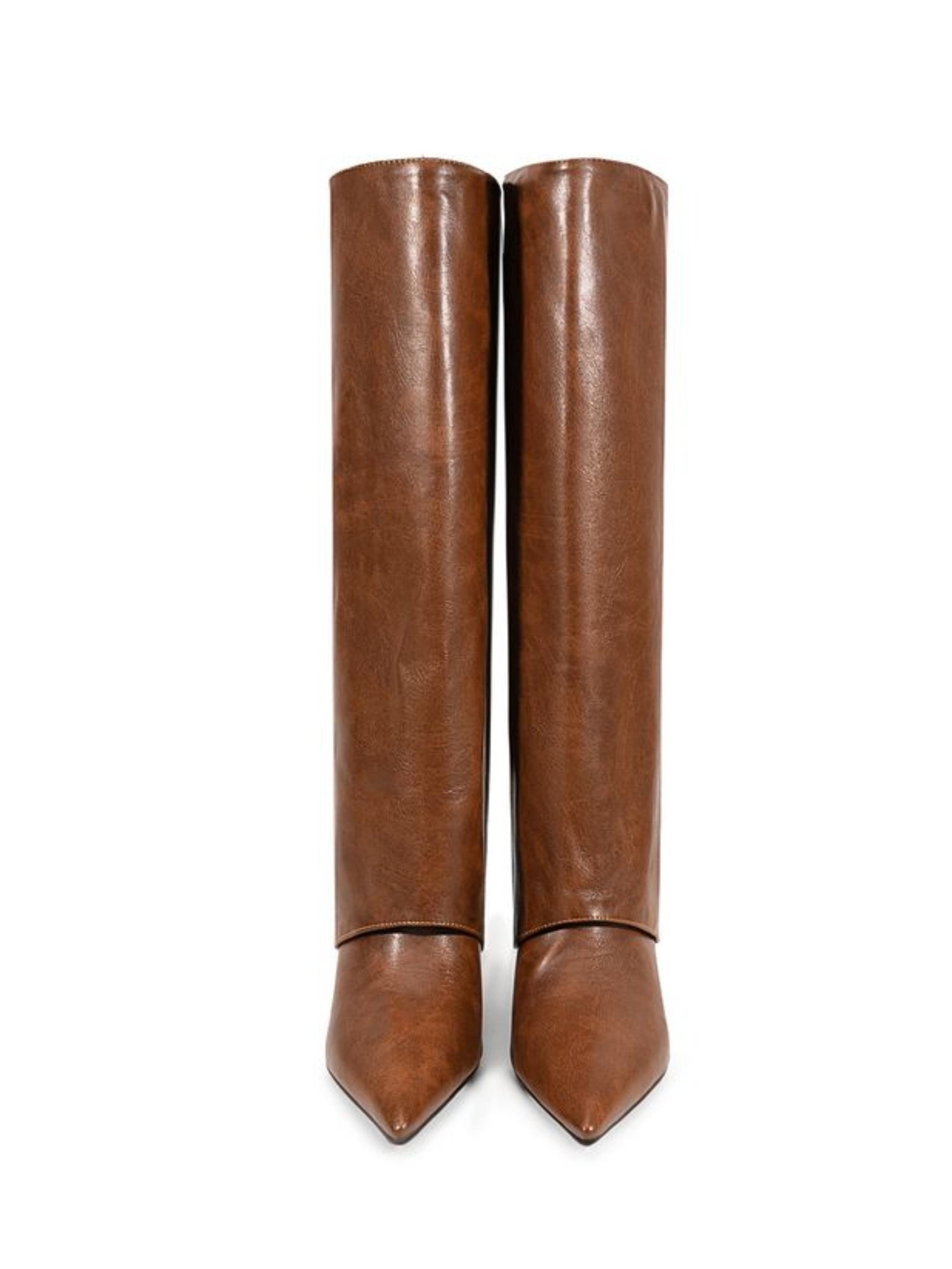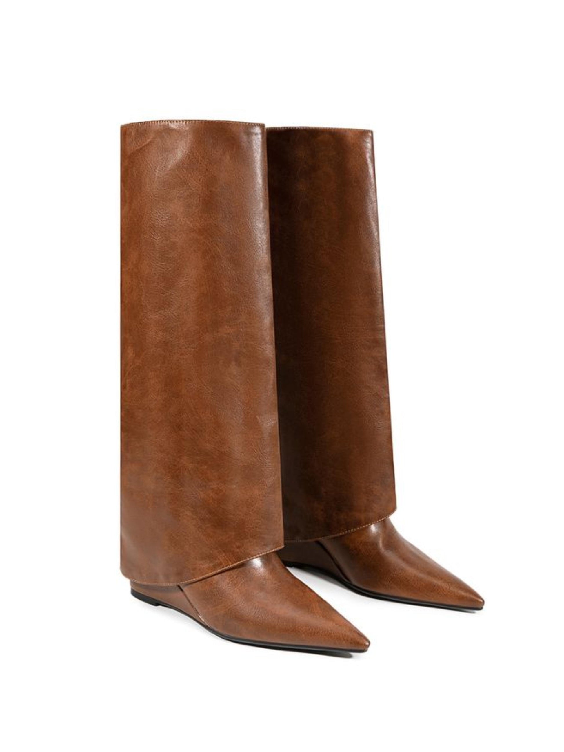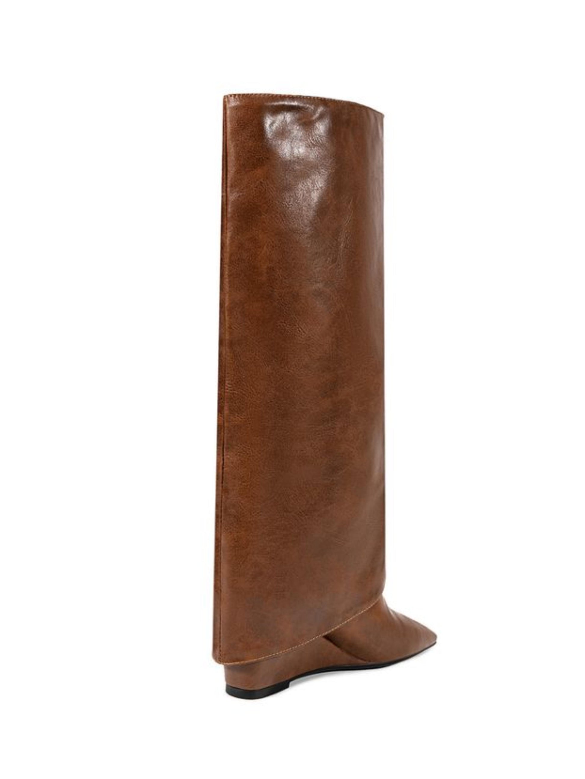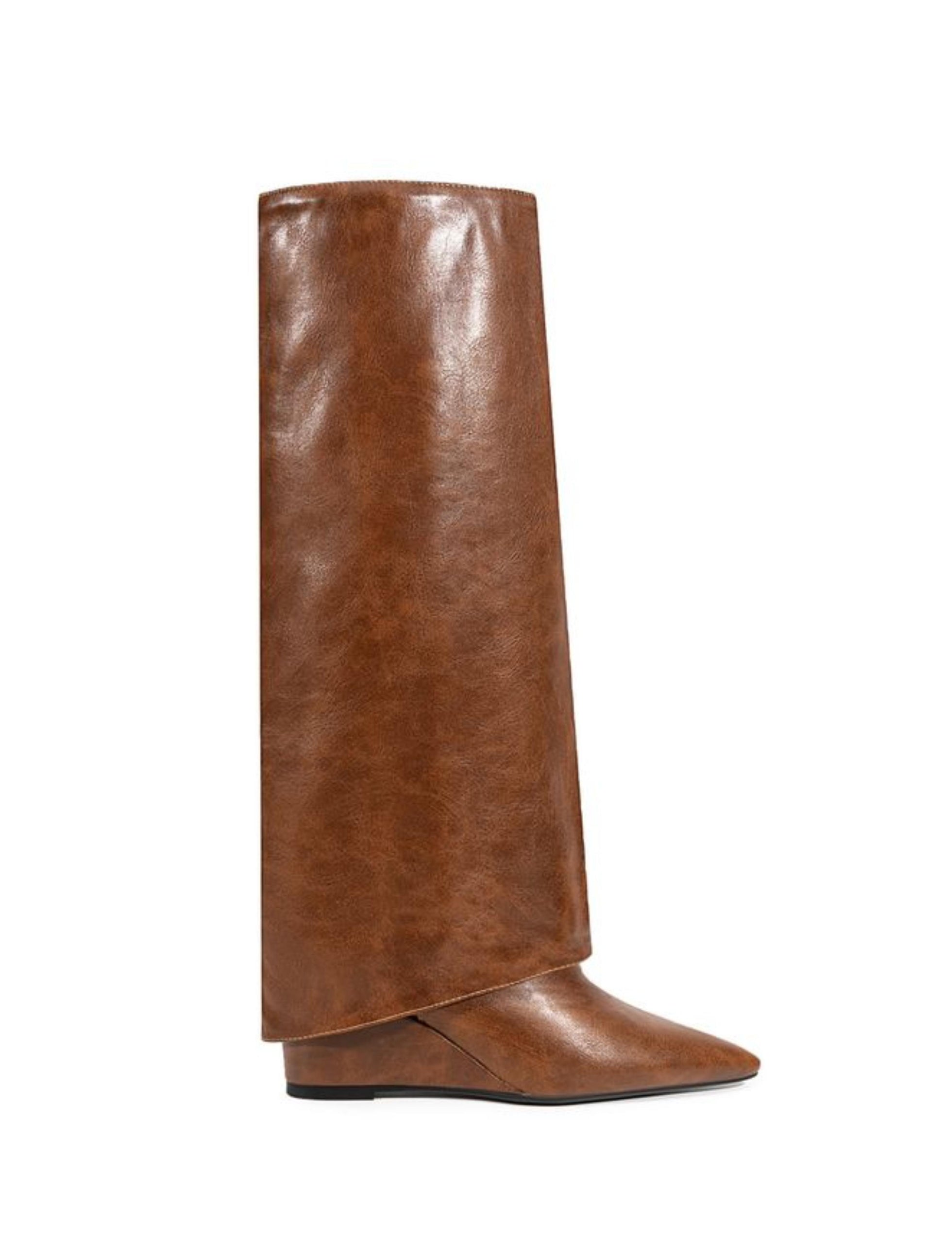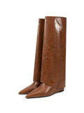 Classic Brown Fold Over Mid Calf Wedge Boots for Women