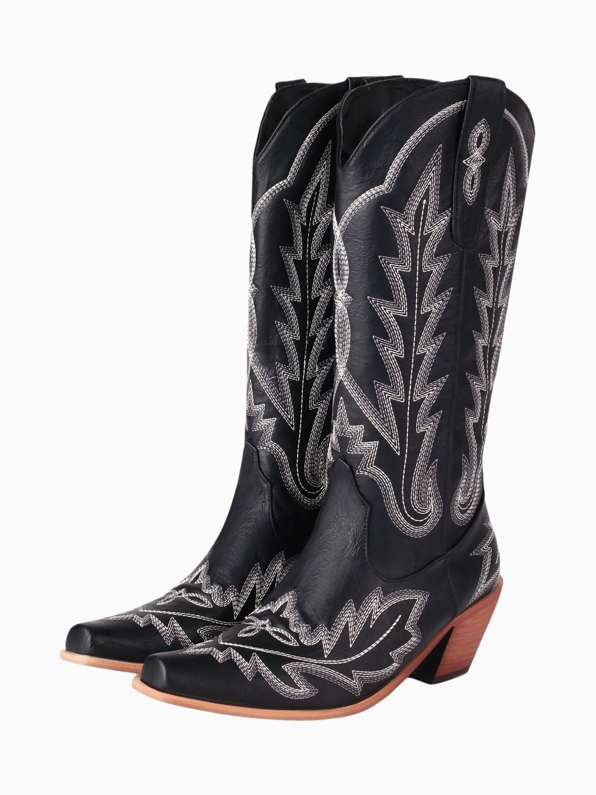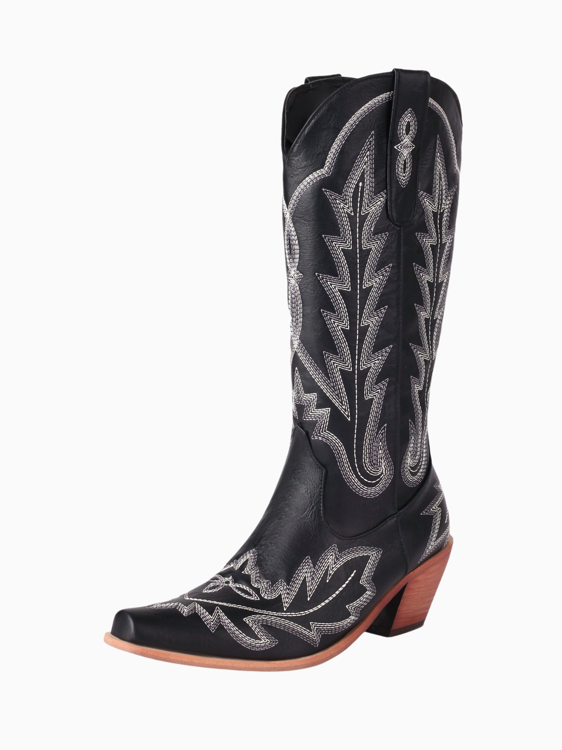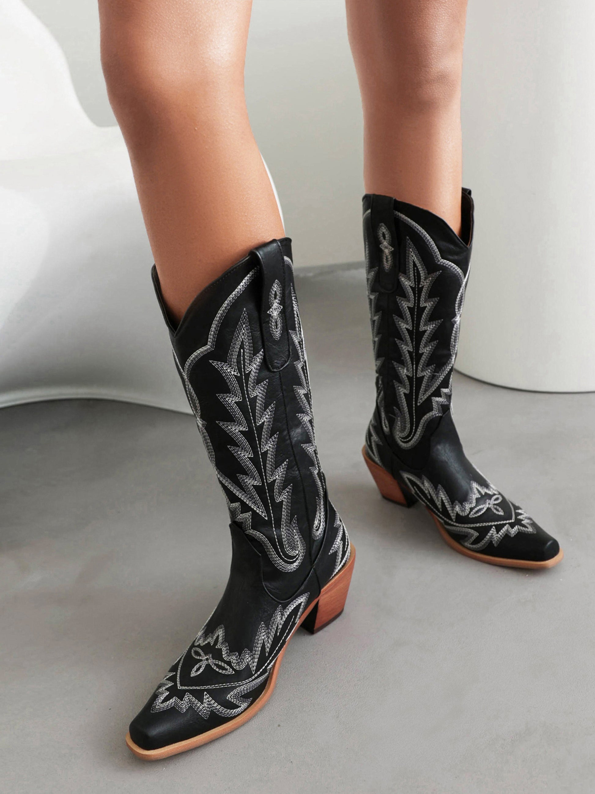 Bold silver embroidery traces classic Western patterns on black cowgirl boots. The traditional design features a slanted block heel and pointed toe for timeless mid-calf cowgirl style.