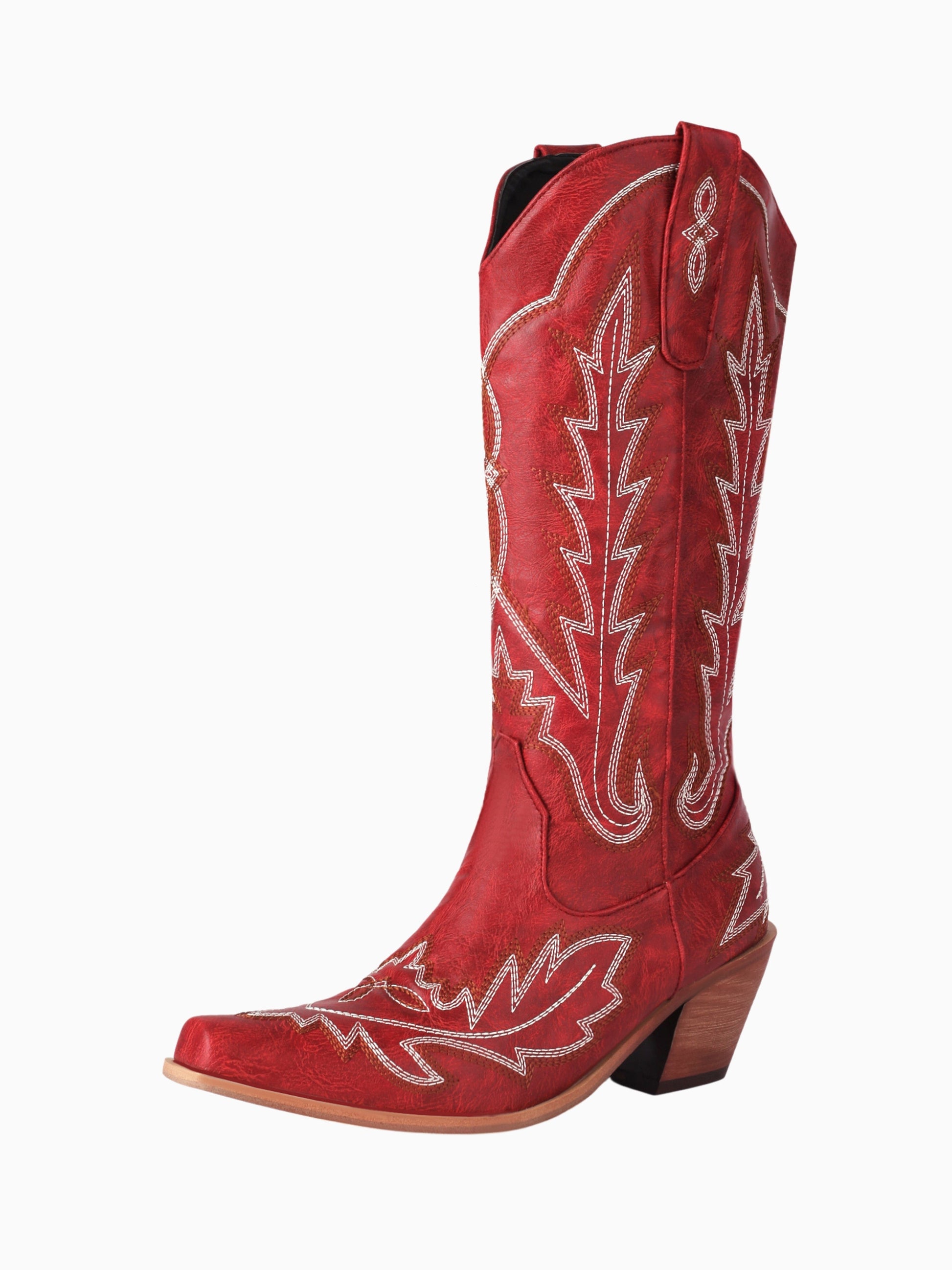 Stunning western cowgirl boots featuring bold white contrast stitching in a traditional arrow-like pattern. The rich maroon design showcases intricate detailing from toe to shaft, complemented by a stacked heel and snip toe, perfect for statement style and comfort.