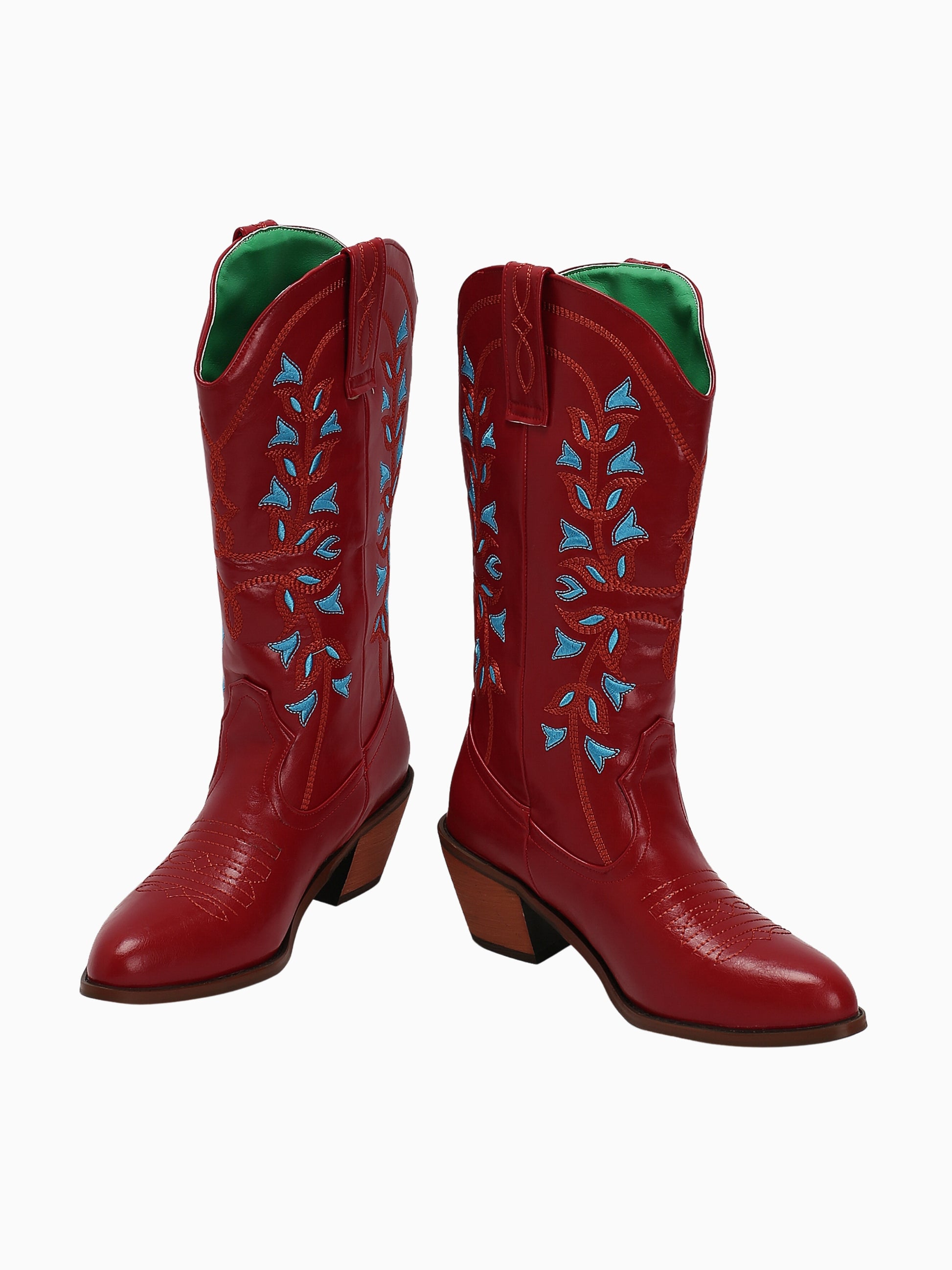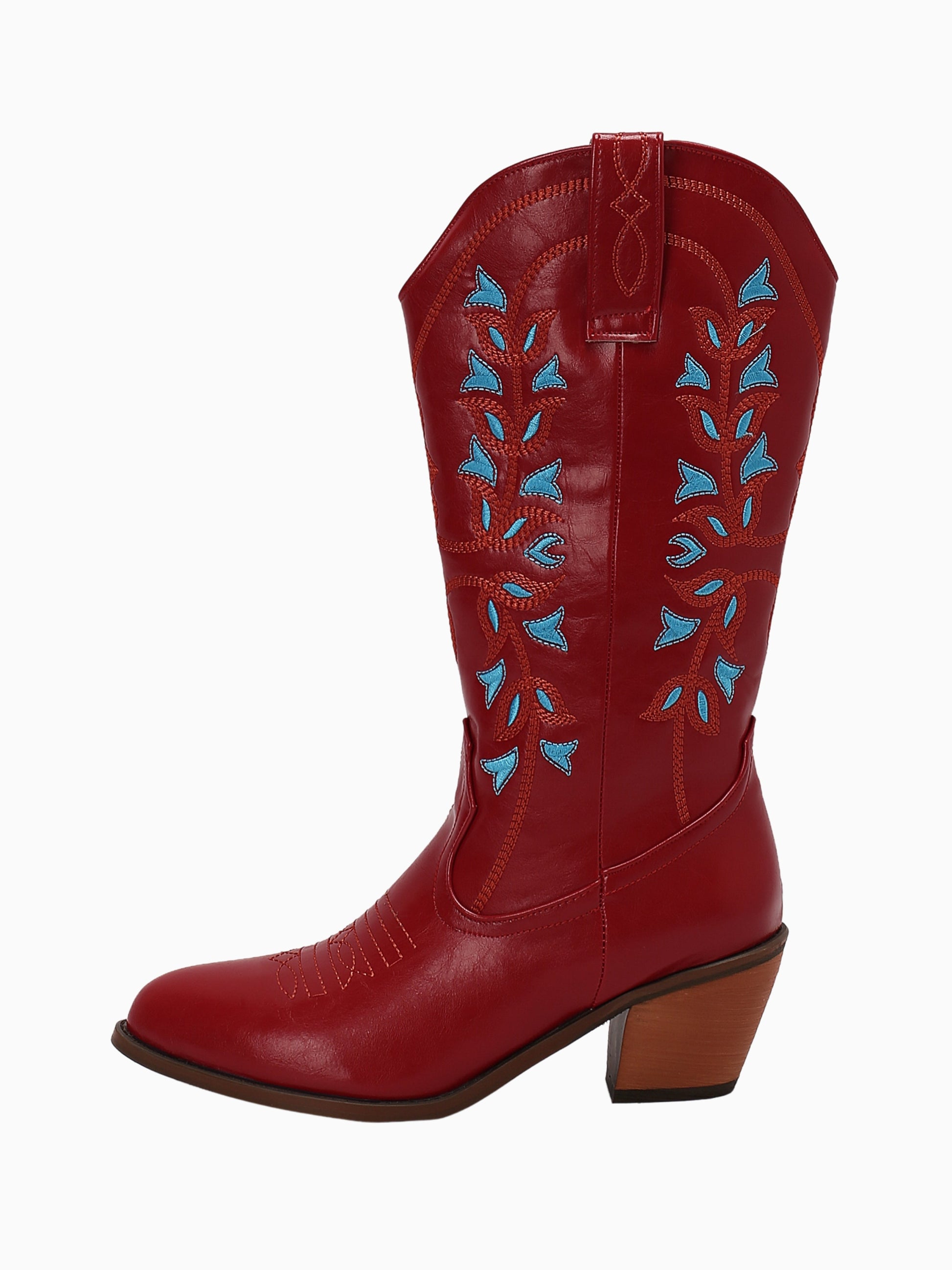 These Western boots feature elegant turquoise floral embroidery against a rich maroon backdrop. With their classic pointed toe, stacked heel, and mid-calf height, they blend traditional cowgirl style with contemporary flair.