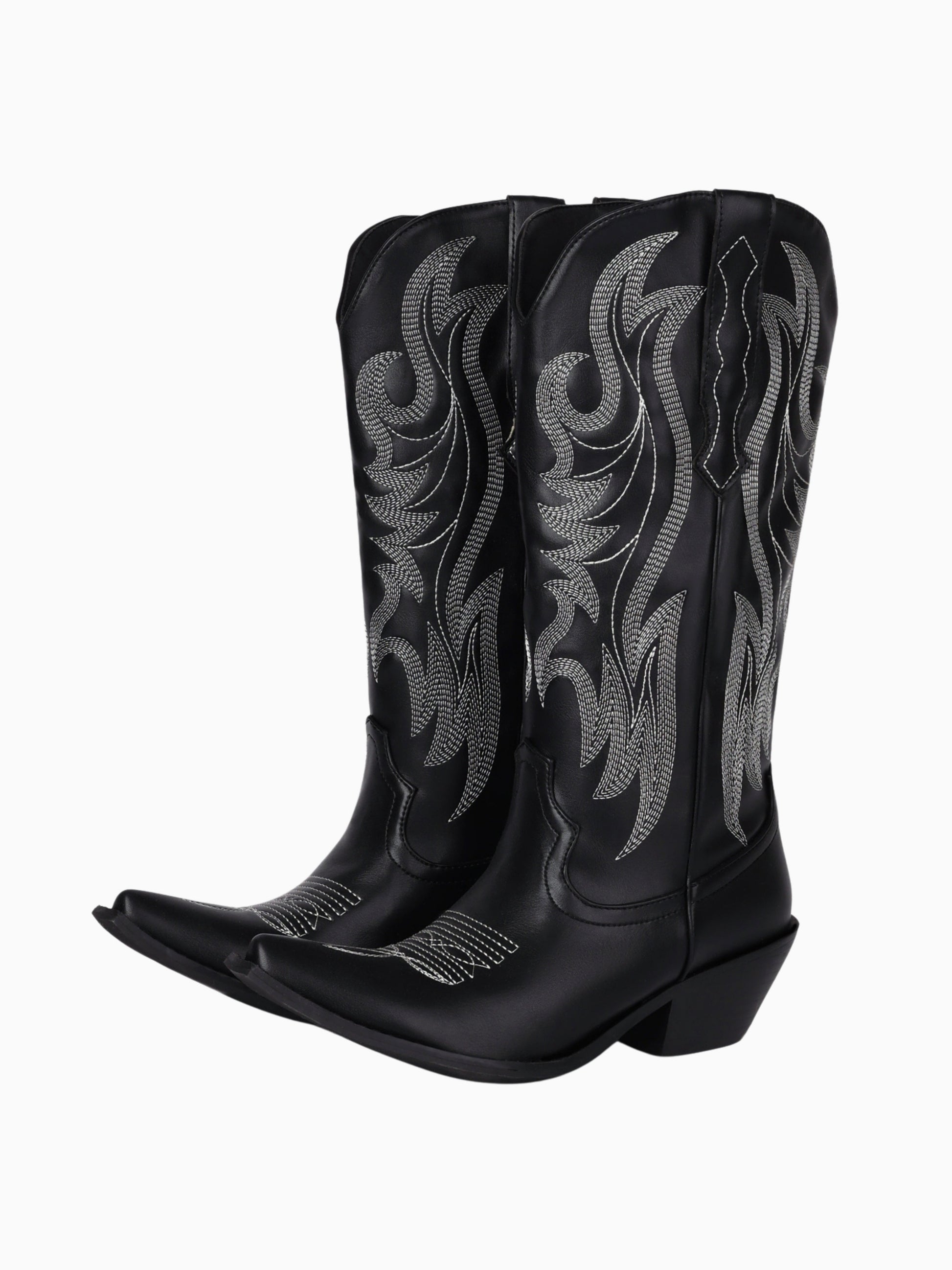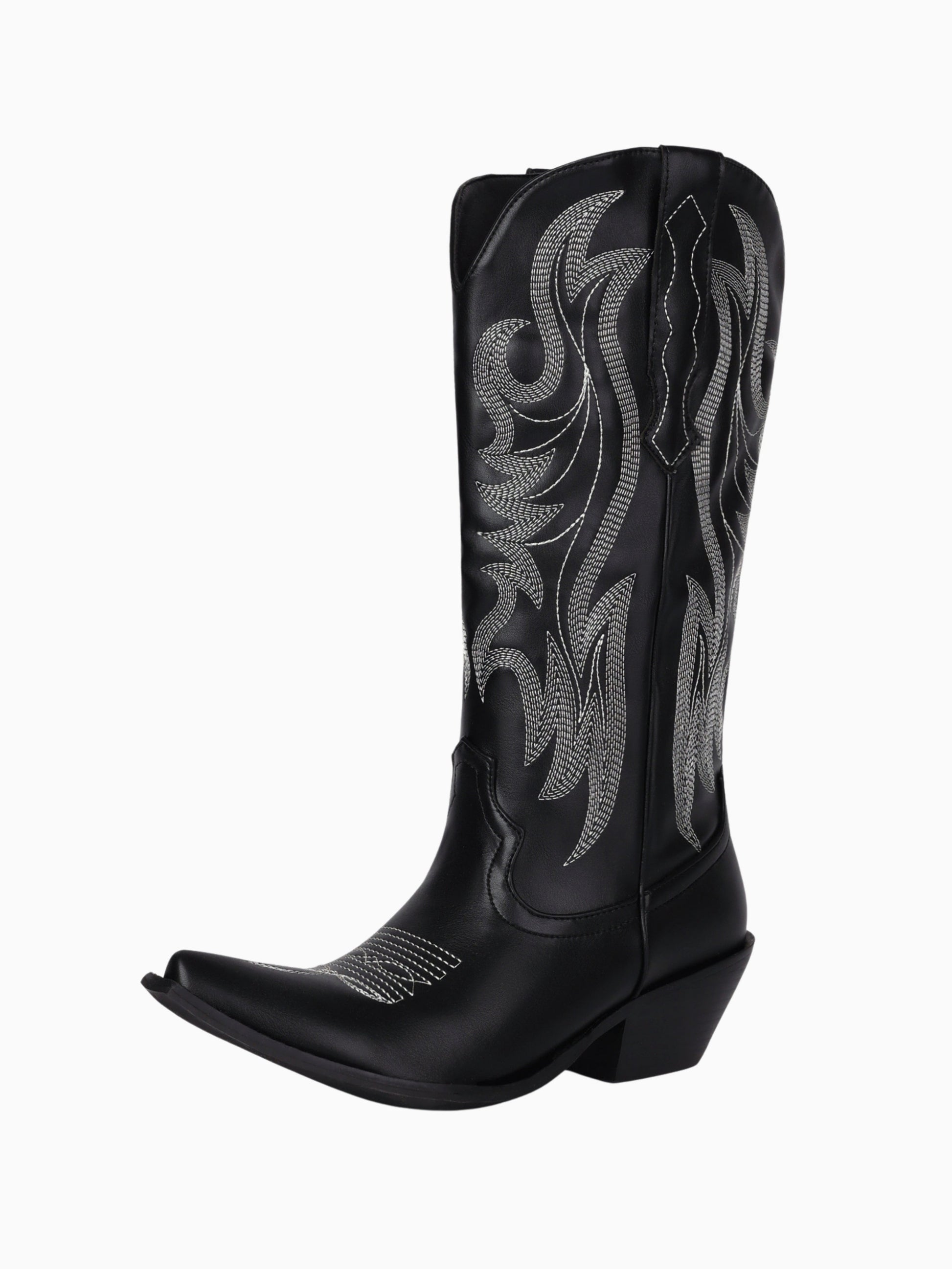 Classic black cowgirl boots featuring traditional silver embroidery and snip toe design, embodying authentic Western heritage with modern elegance.