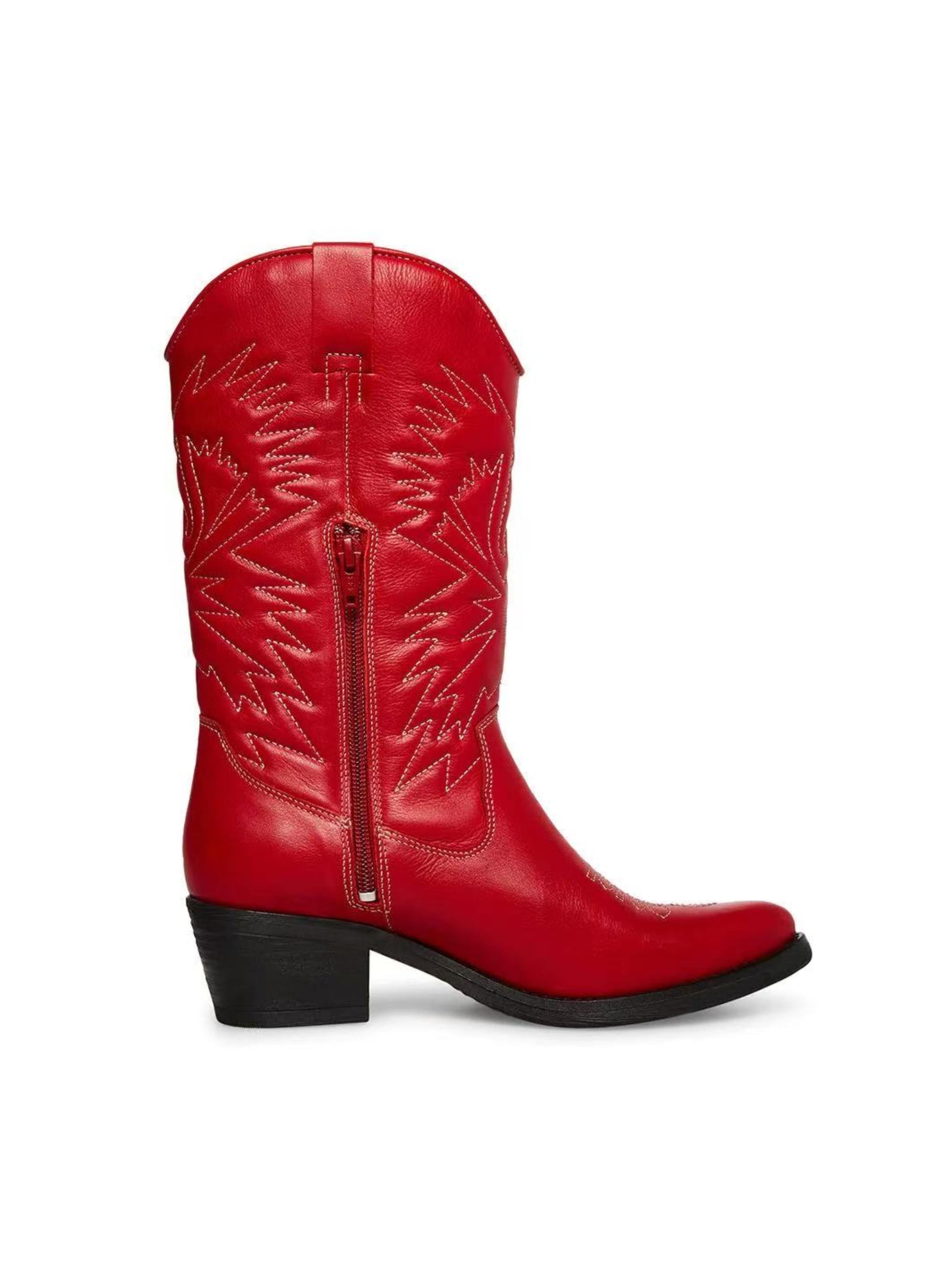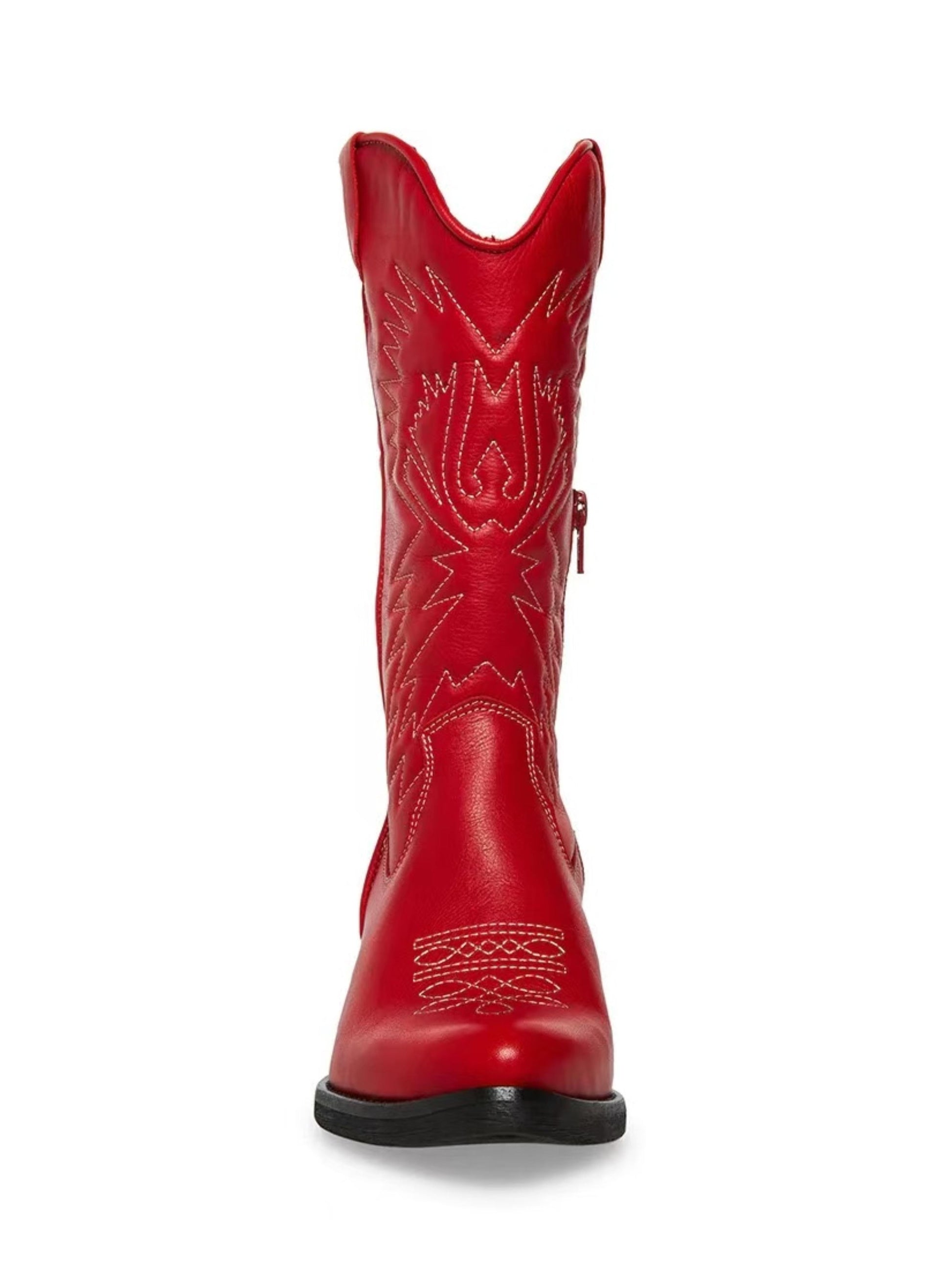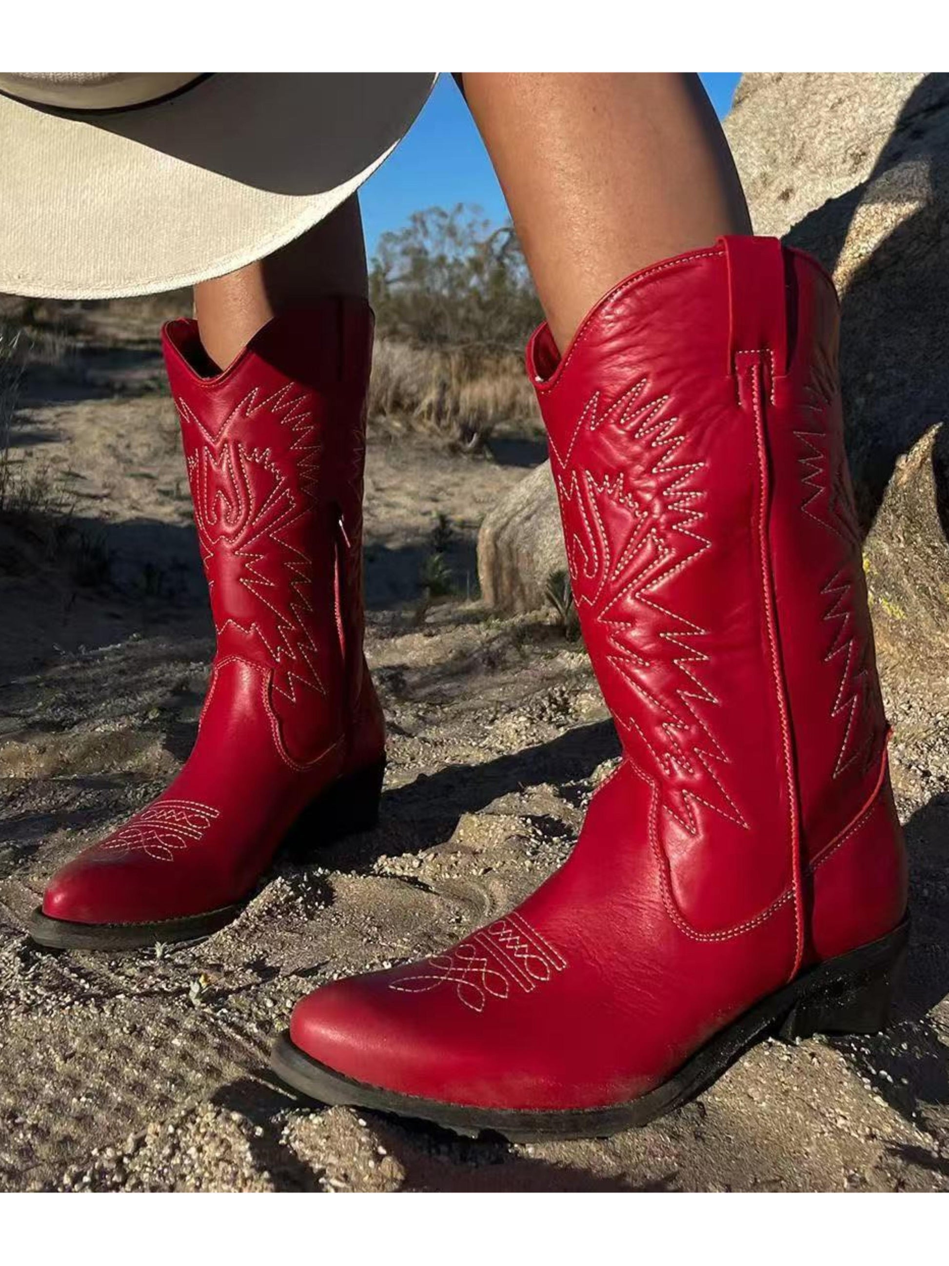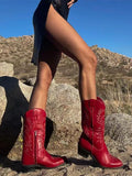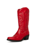 Classic Western cowgirl boots featuring bold red embroidery, snip toe design, and traditional stacked heel. Mid-calf height offers authentic ranch style with eye-catching detail. Perfect for rodeos, line dancing, or Western fashion statements.
