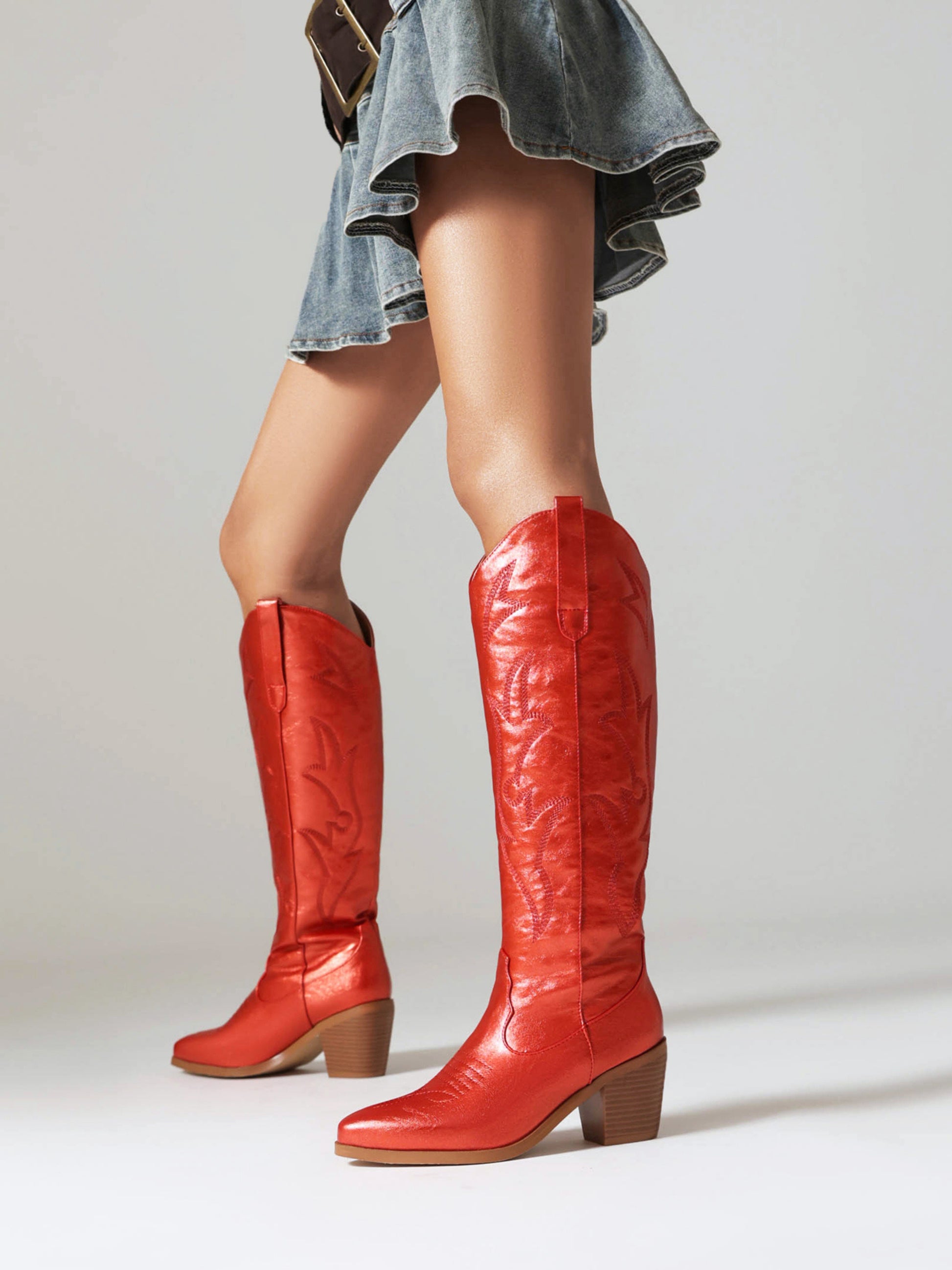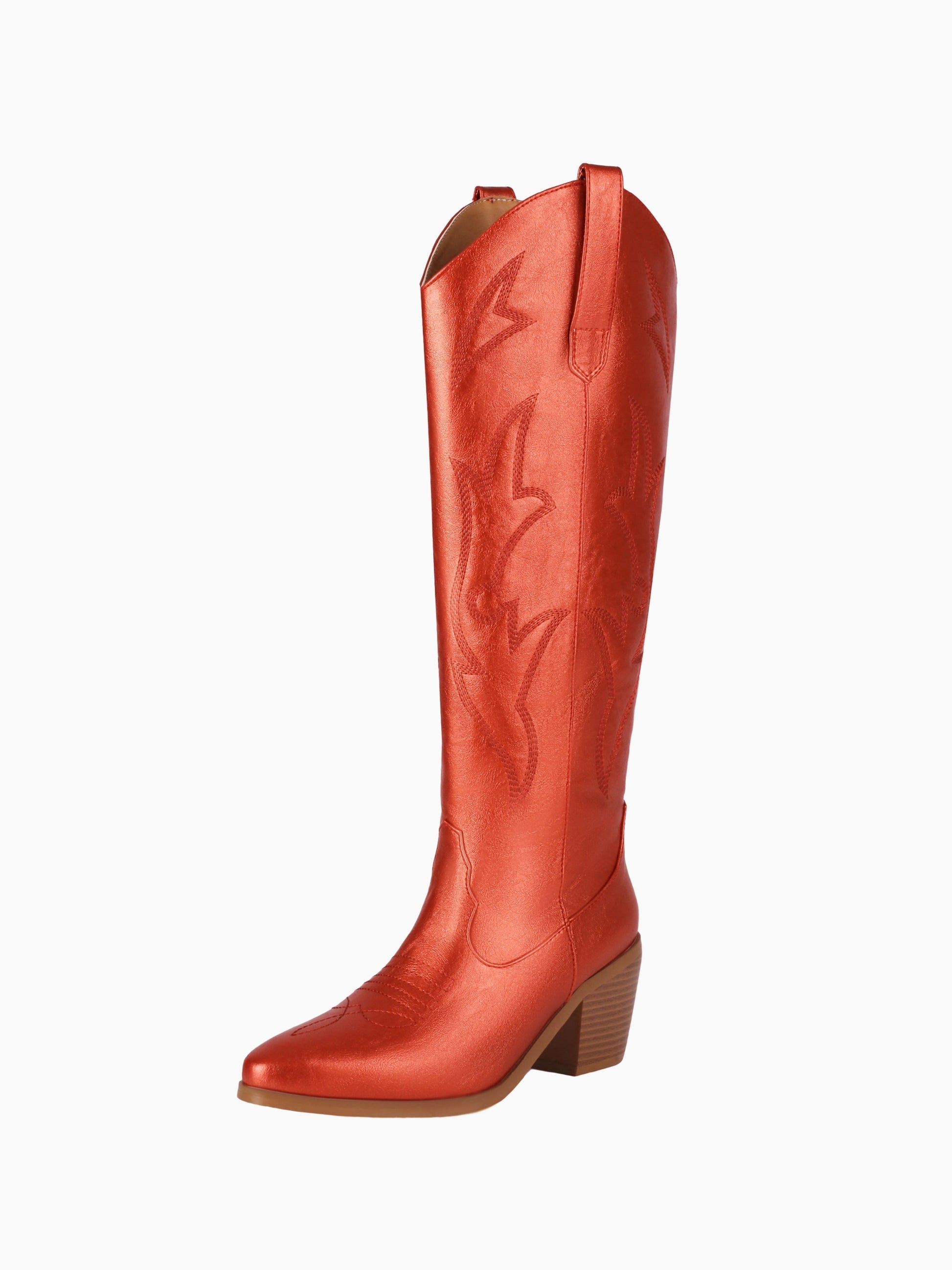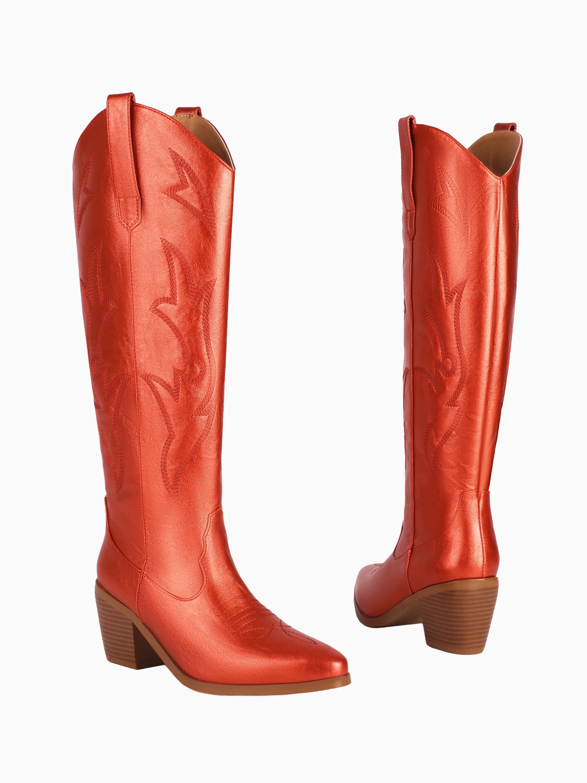 Metallic copper-red knee-high Western boots featuring classic stitched patterns, comfortable chunky heel, and timeless pointed toe design.