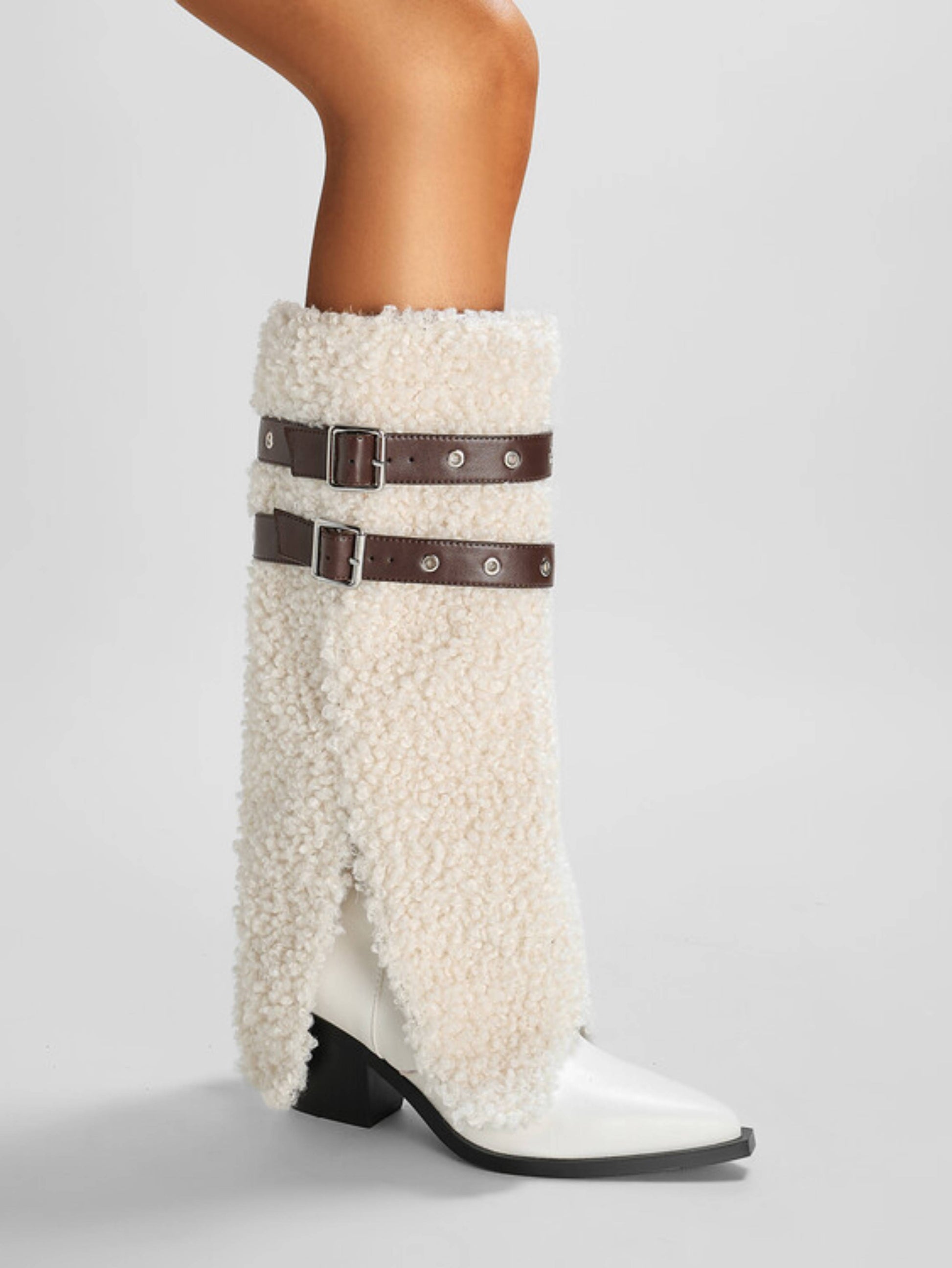 Trendy white cowgirl boots with luxurious furry fold-over design. Perfect winter footwear combining Western style and cozy warmth. Faux fur lined, fashionable long boots for cold weather comfort.