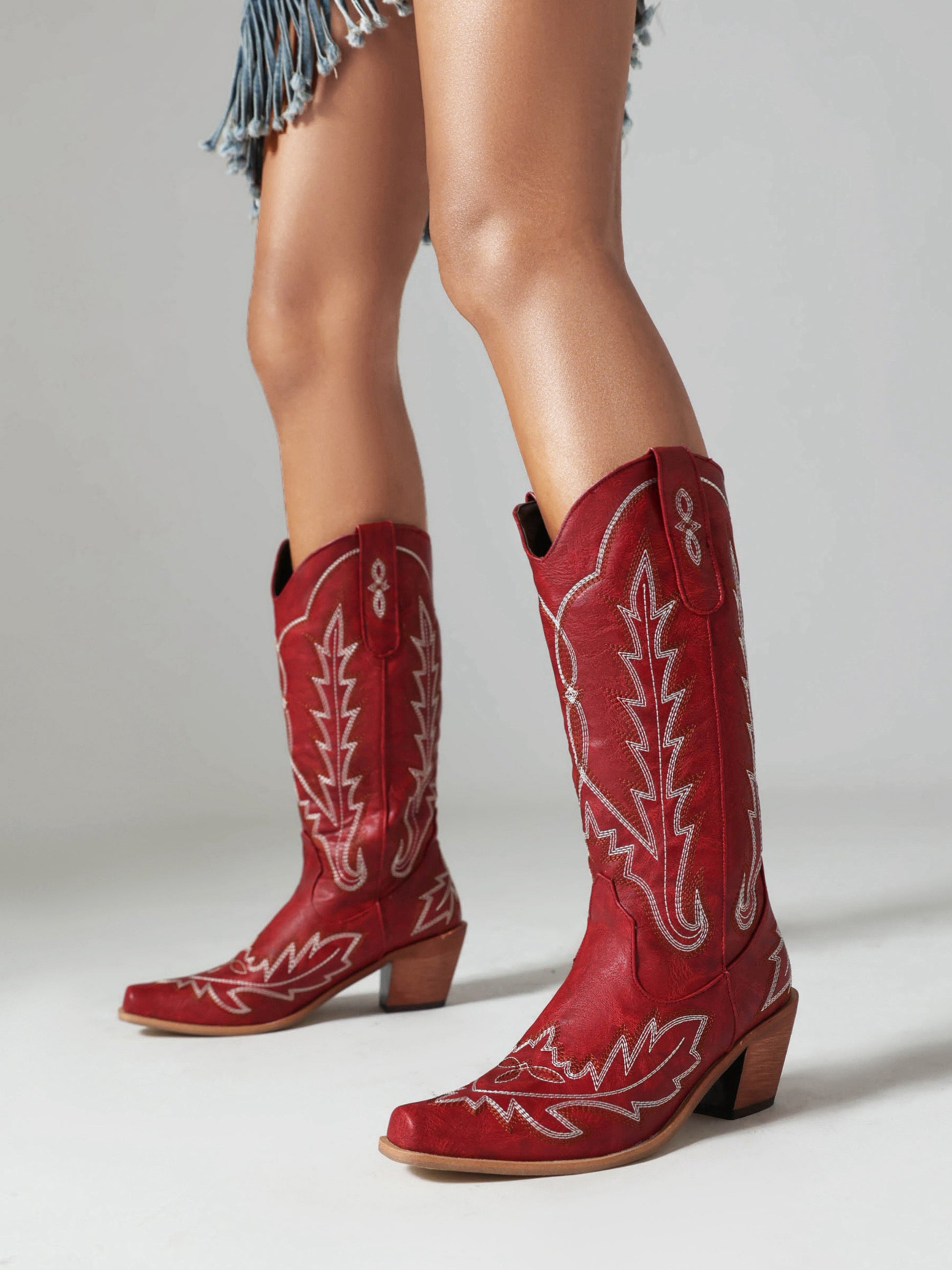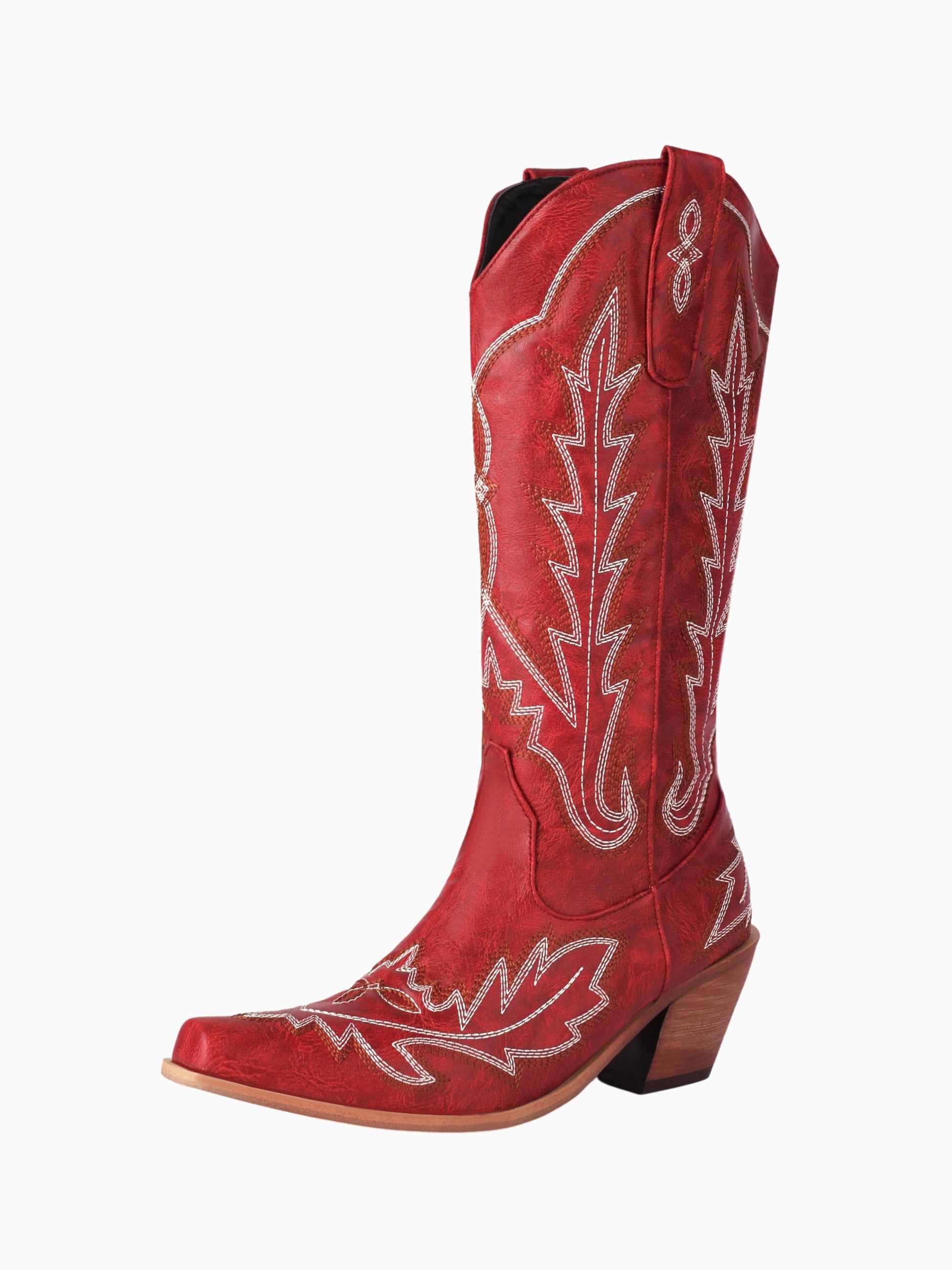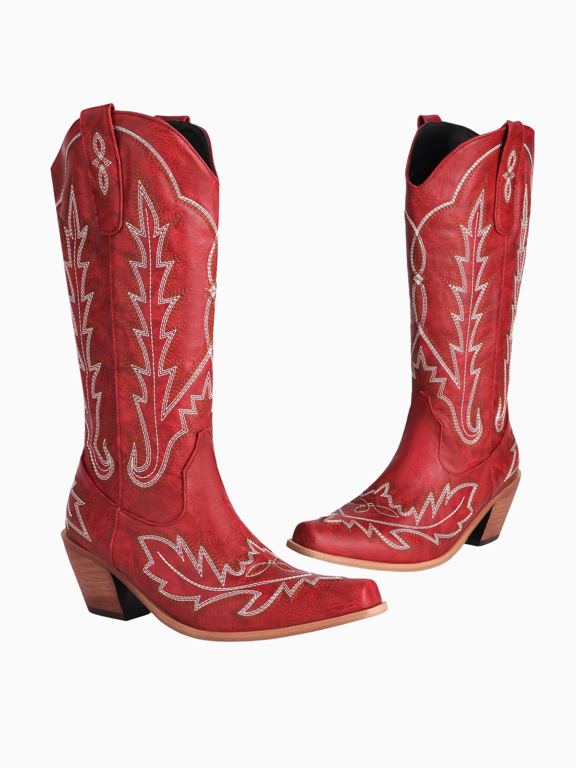 Bold red mid-calf cowgirl boots featuring striking zigzag embroidery in white contrast stitching, complete with pointed toe and classic Western heel design.