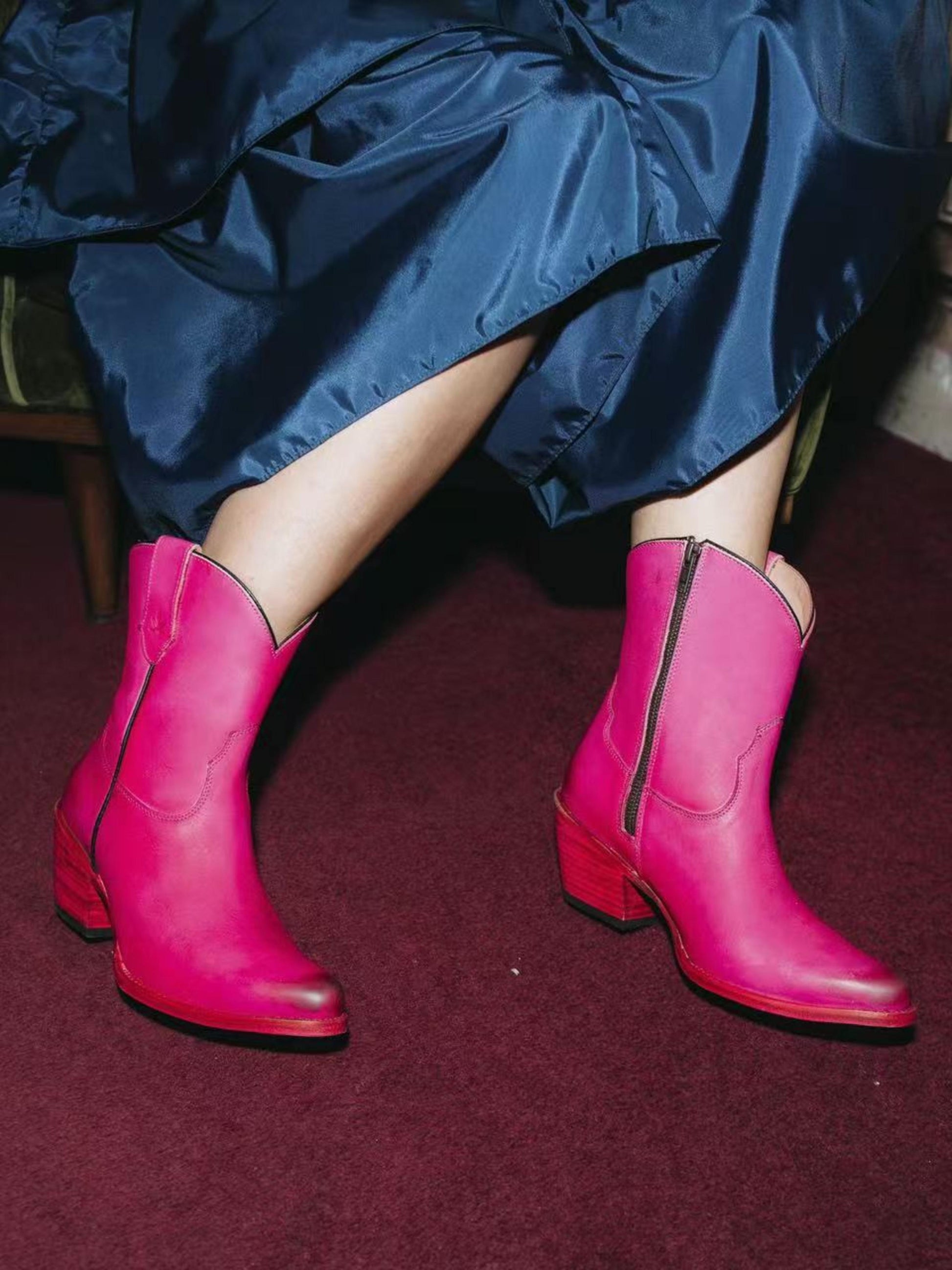 Cute Barbie pink cowgirl ankle boots with trendy snip toe design. Vibrant statement footwear perfect for festivals, concerts, and bold Western fashion lovers. Eye-catching color adds playful flair to any outfit with authentic cowboy styling.