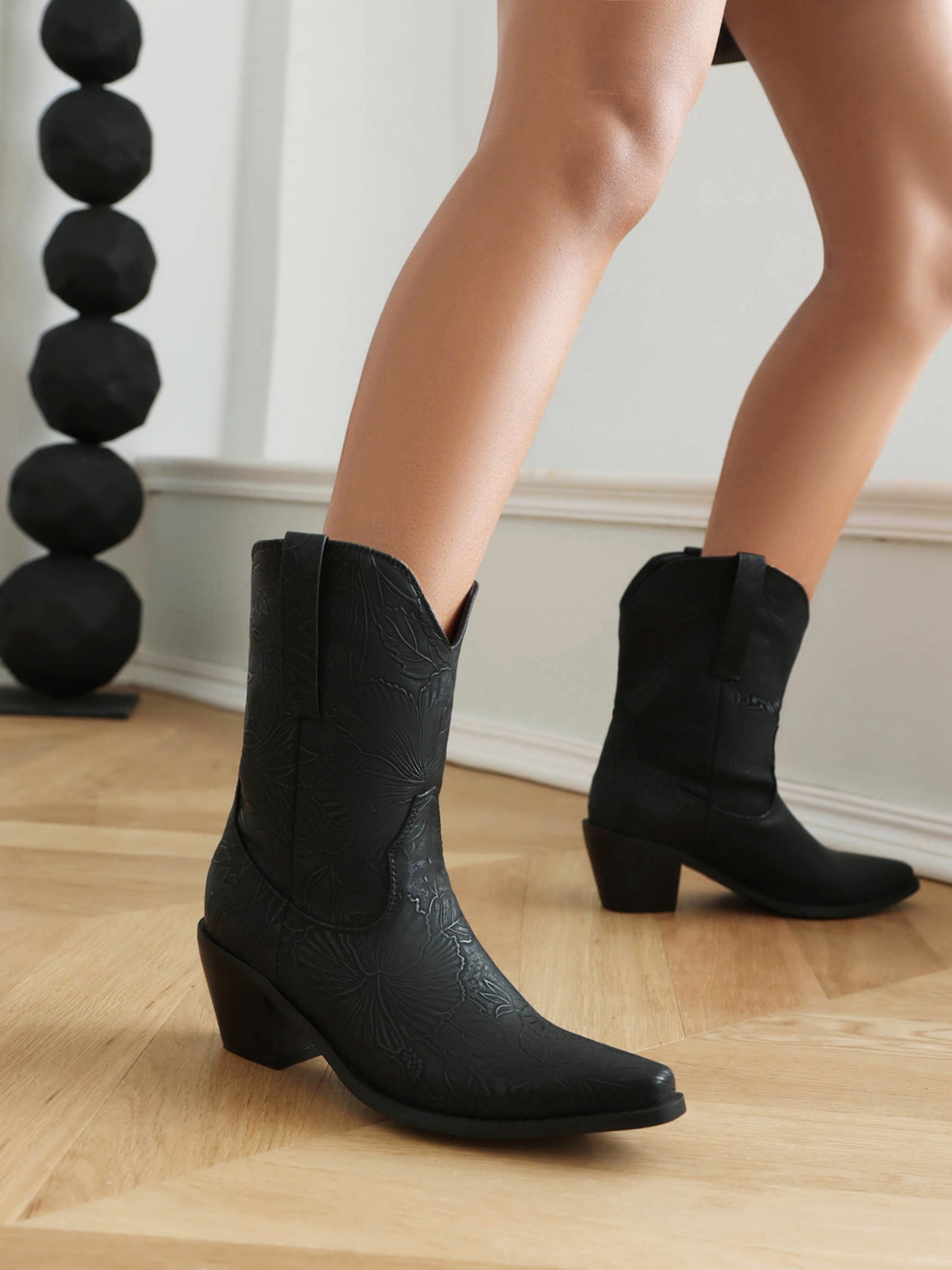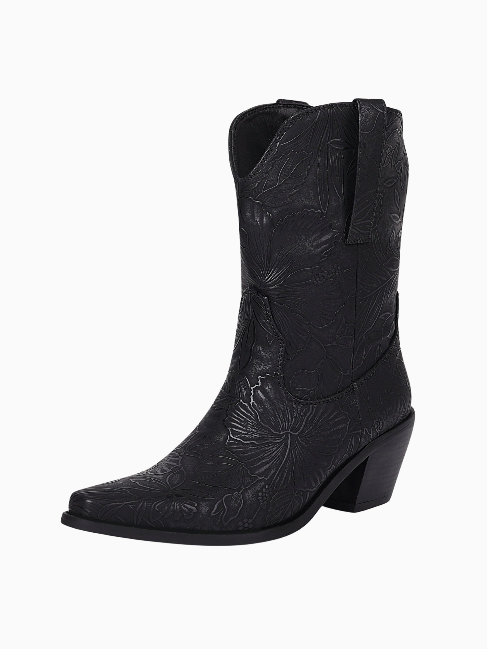 Sophisticated black ankle cowgirl boots featuring embossed floral patterns and tonal details, creating a subtle yet elegant Western statement.