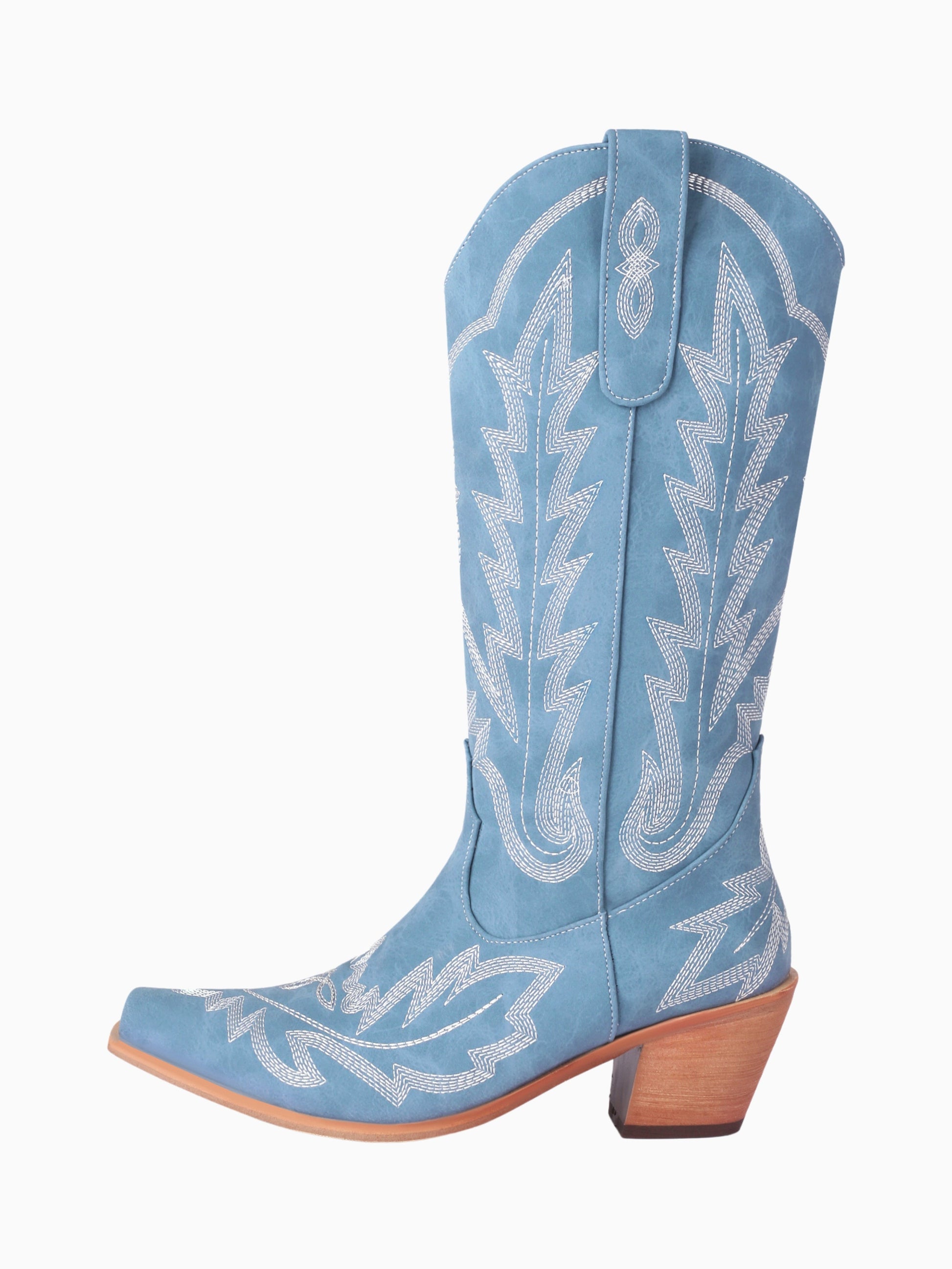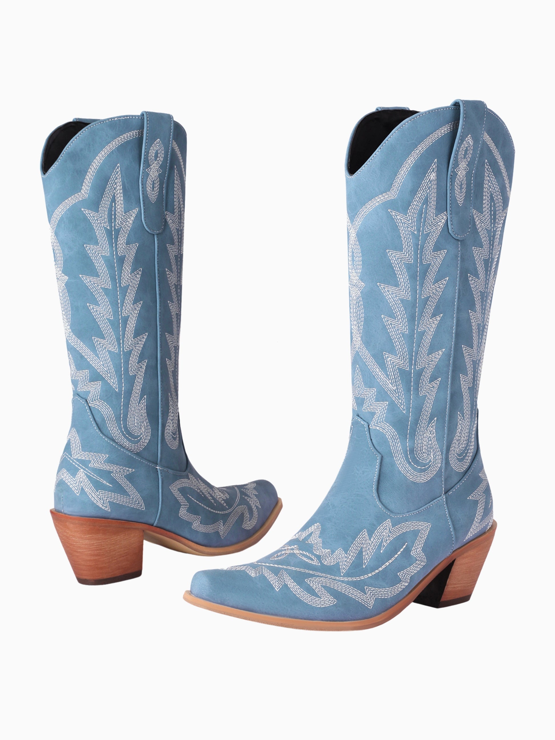 These elegant Classic Embroidered Light Blue Cowgirl Boots feature classic Western stitching in white contrast thread. The blue design with wooden heels offers vintage charm and modern style, perfect for fashion-forward cowgirl looks.