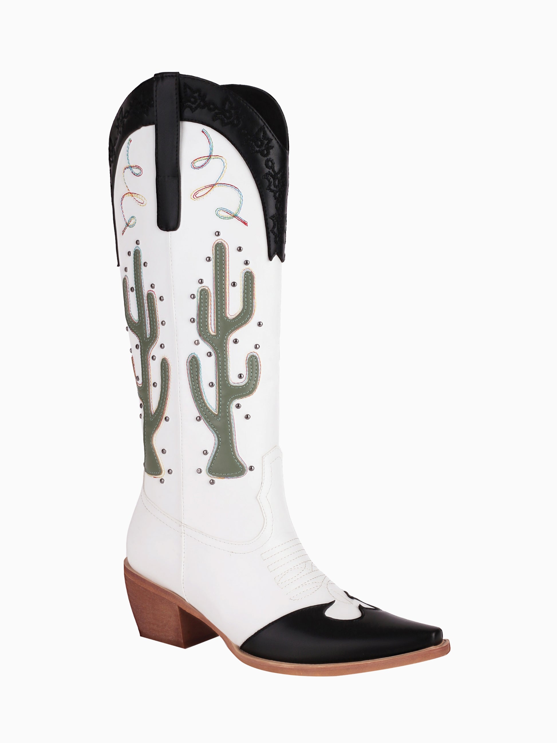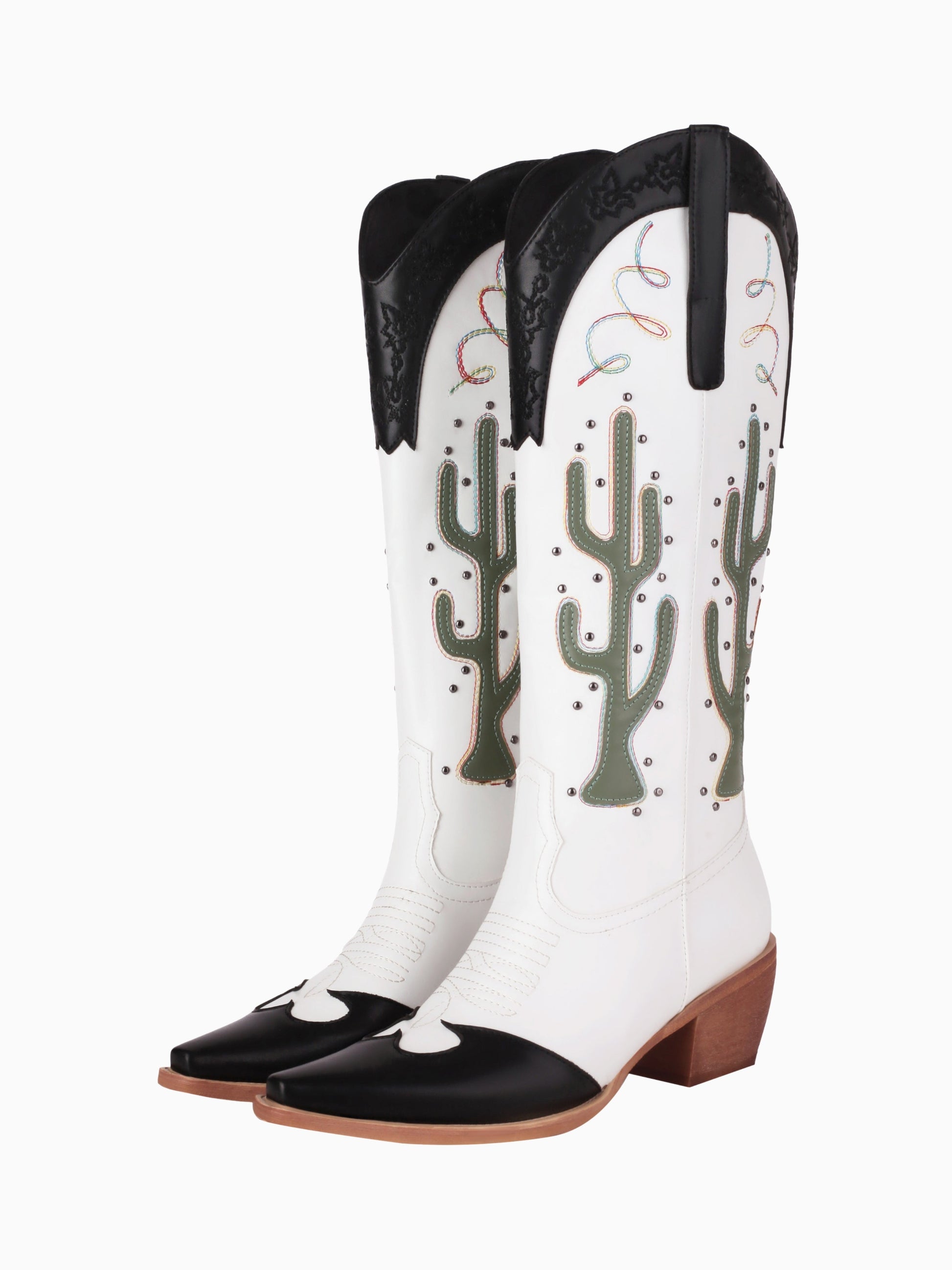 Desert Cactus Inlay Studded Knee-High Black & White Cowgirl Boots
