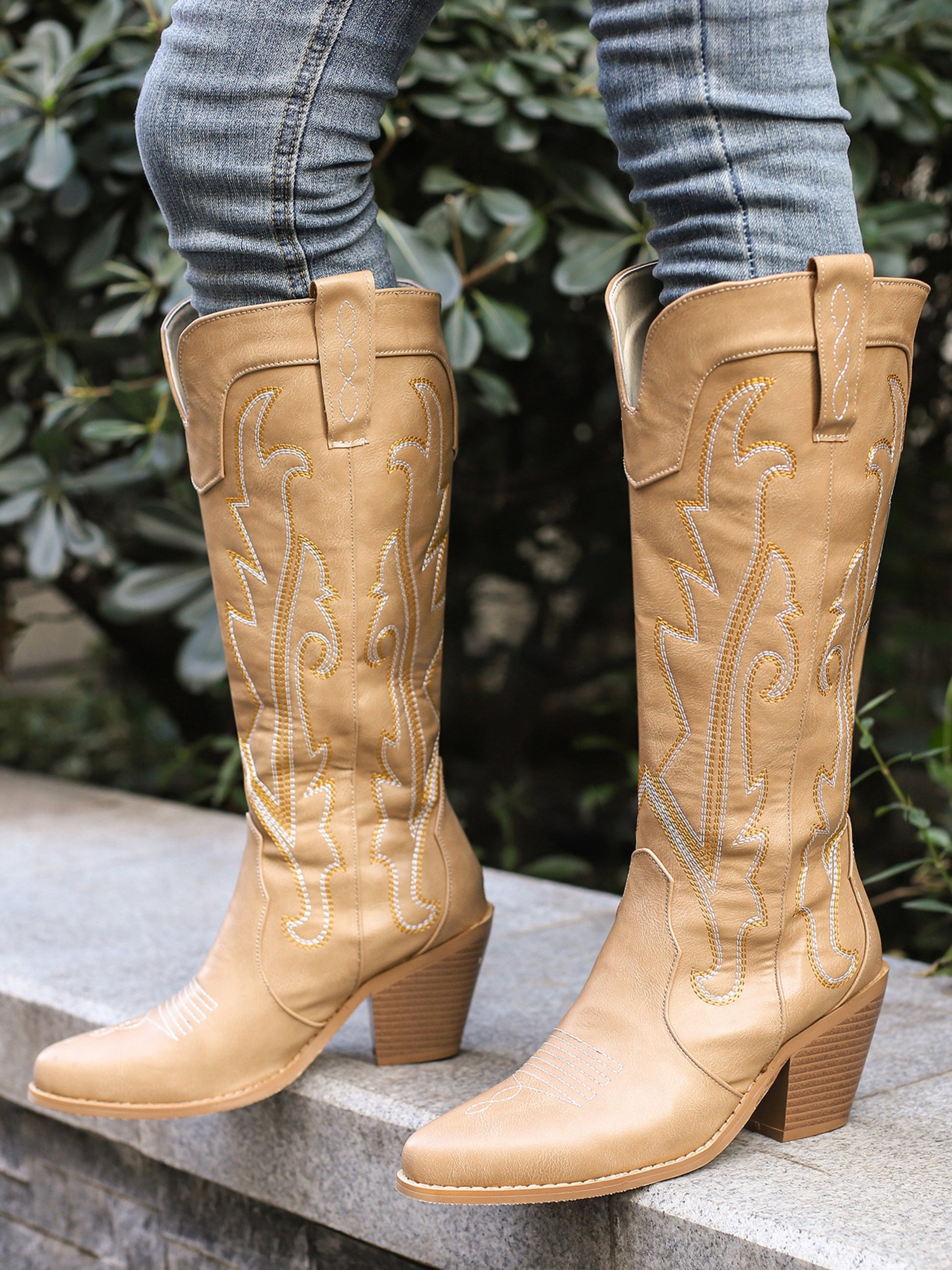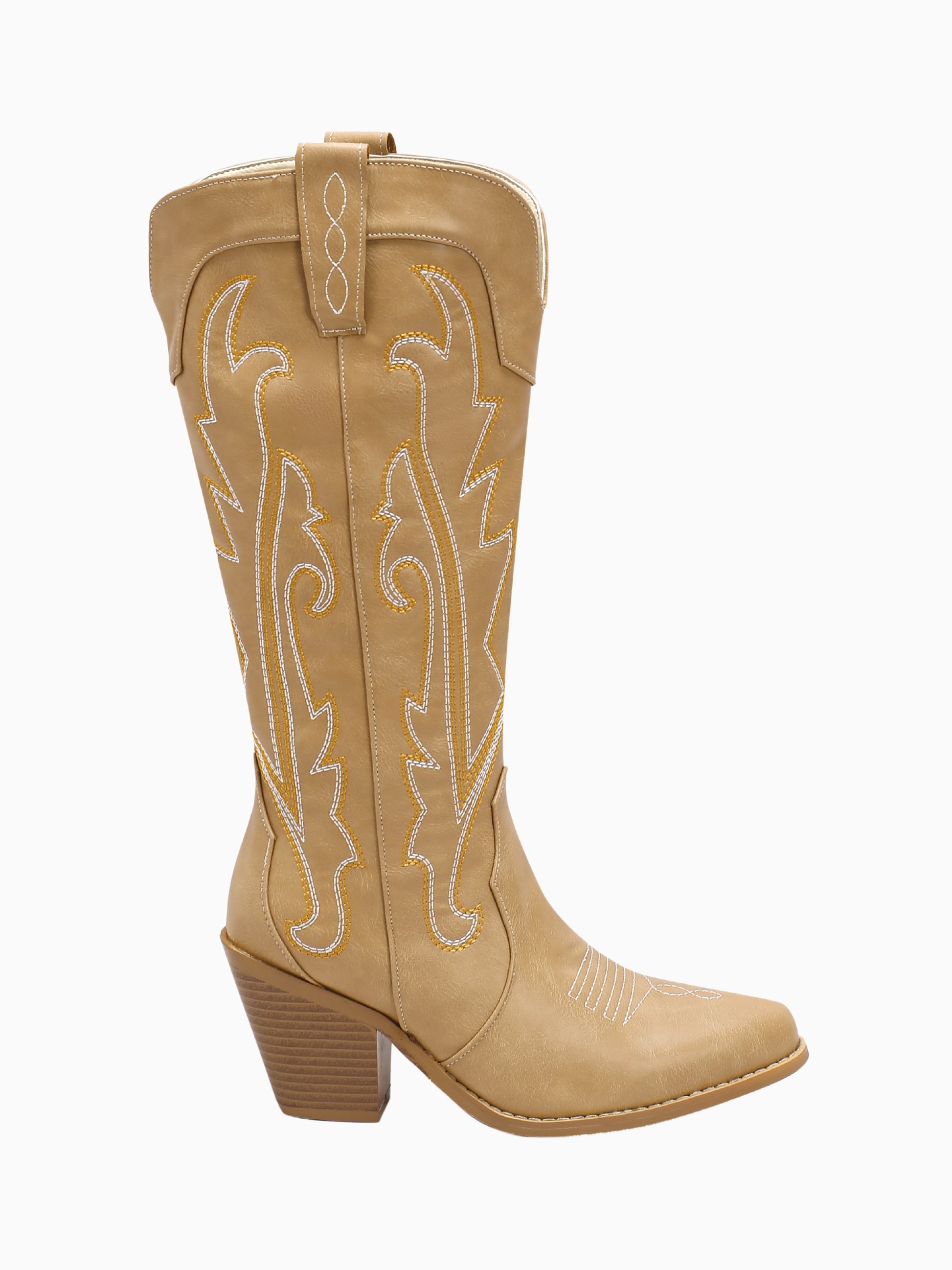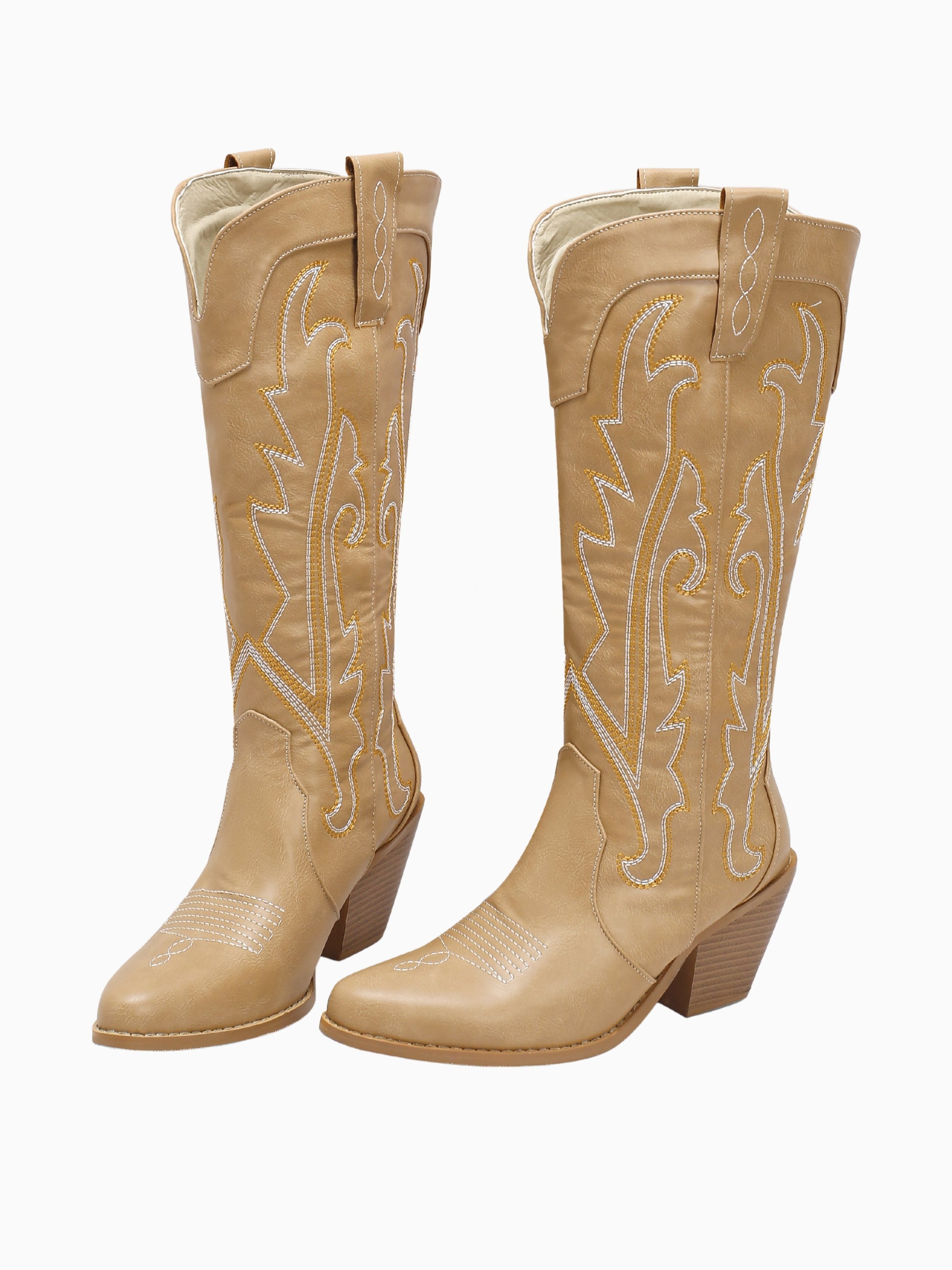 Desert-inspired tan leather meets intricate white embroidery in these classic Western boots. Featuring traditional cowgirl stitching patterns, stacked heels, and timeless silhouette, they embody authentic ranch style with everyday wearability.