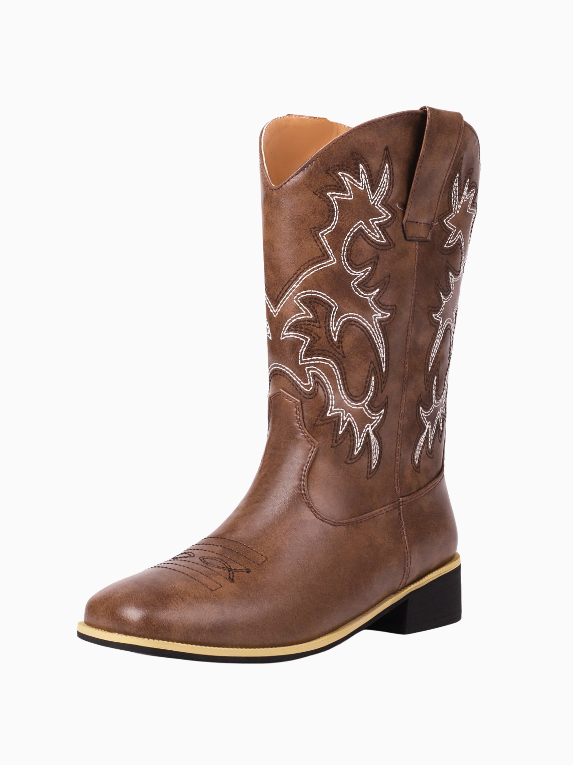 Classic dark brown western boots feature bold white contrast stitching and modern square toe design, offering everyday comfort with traditional style.