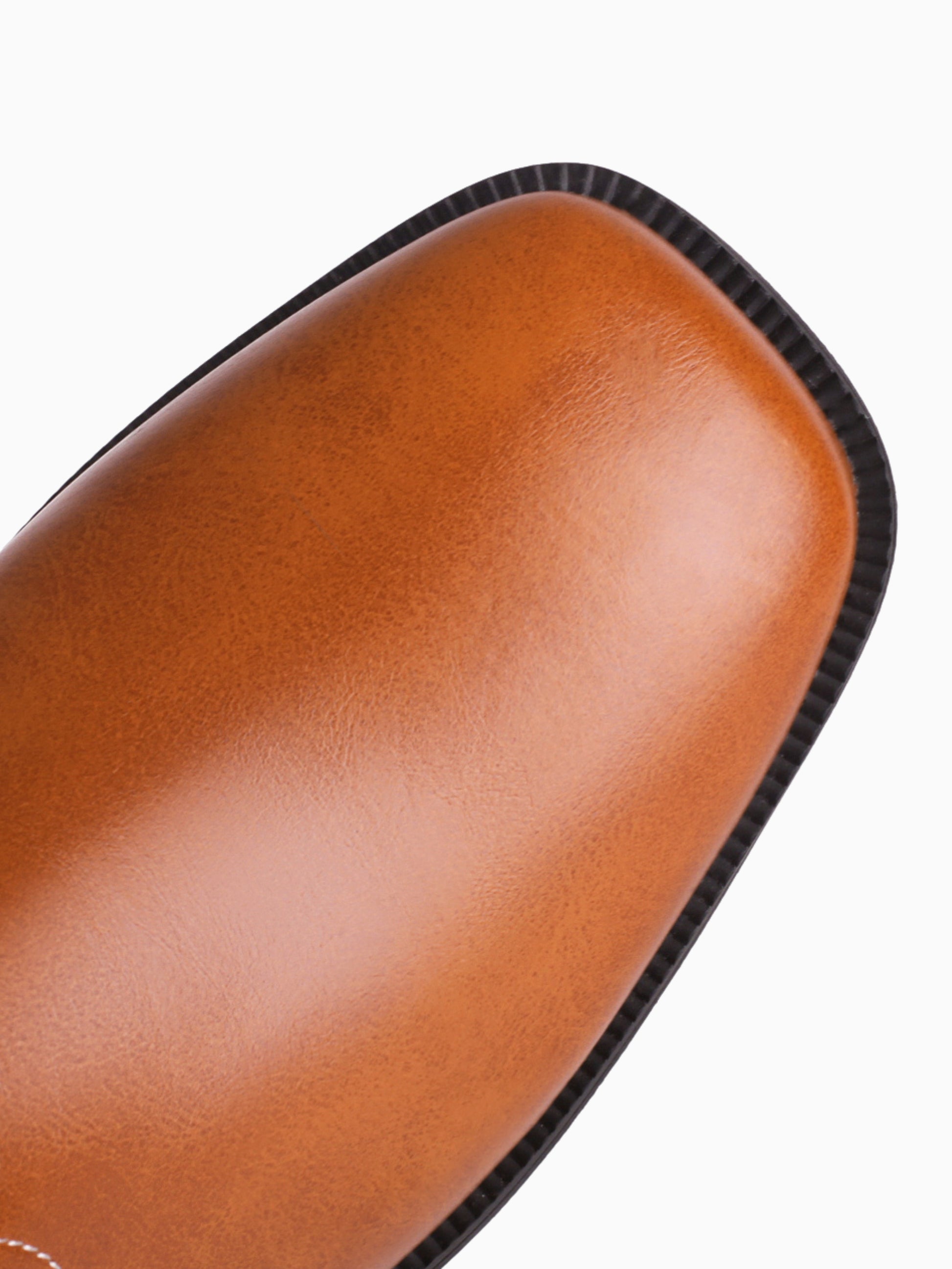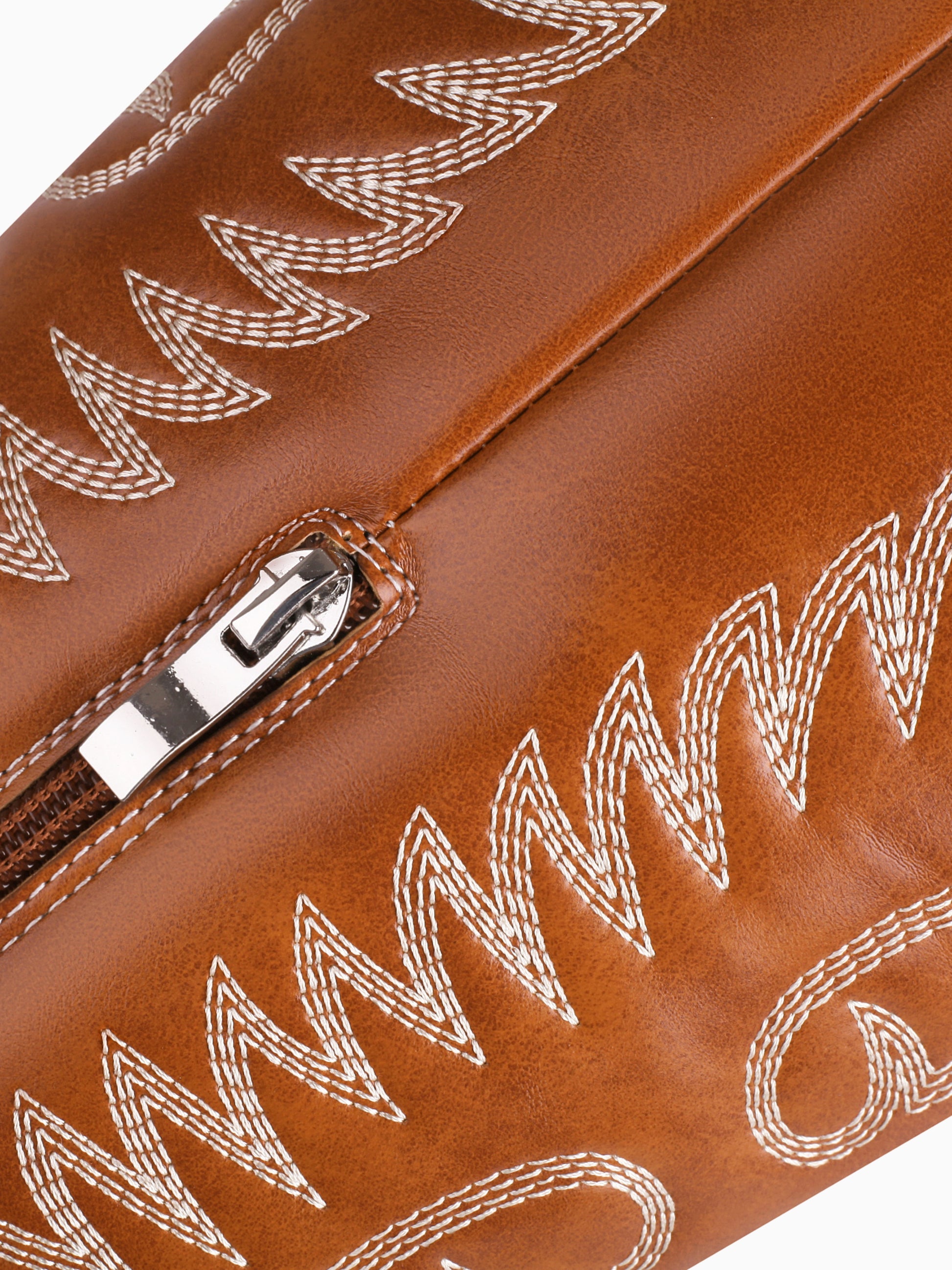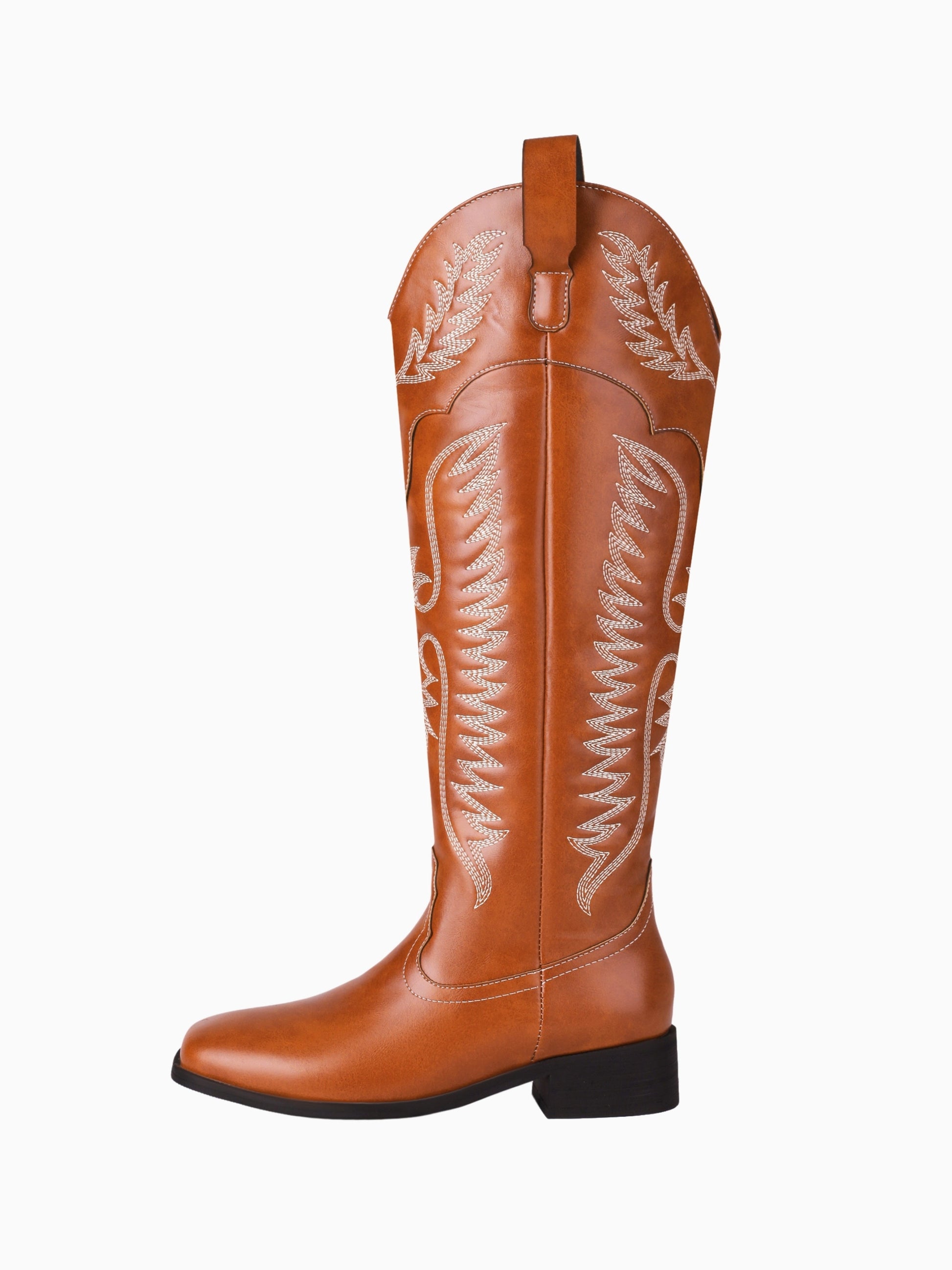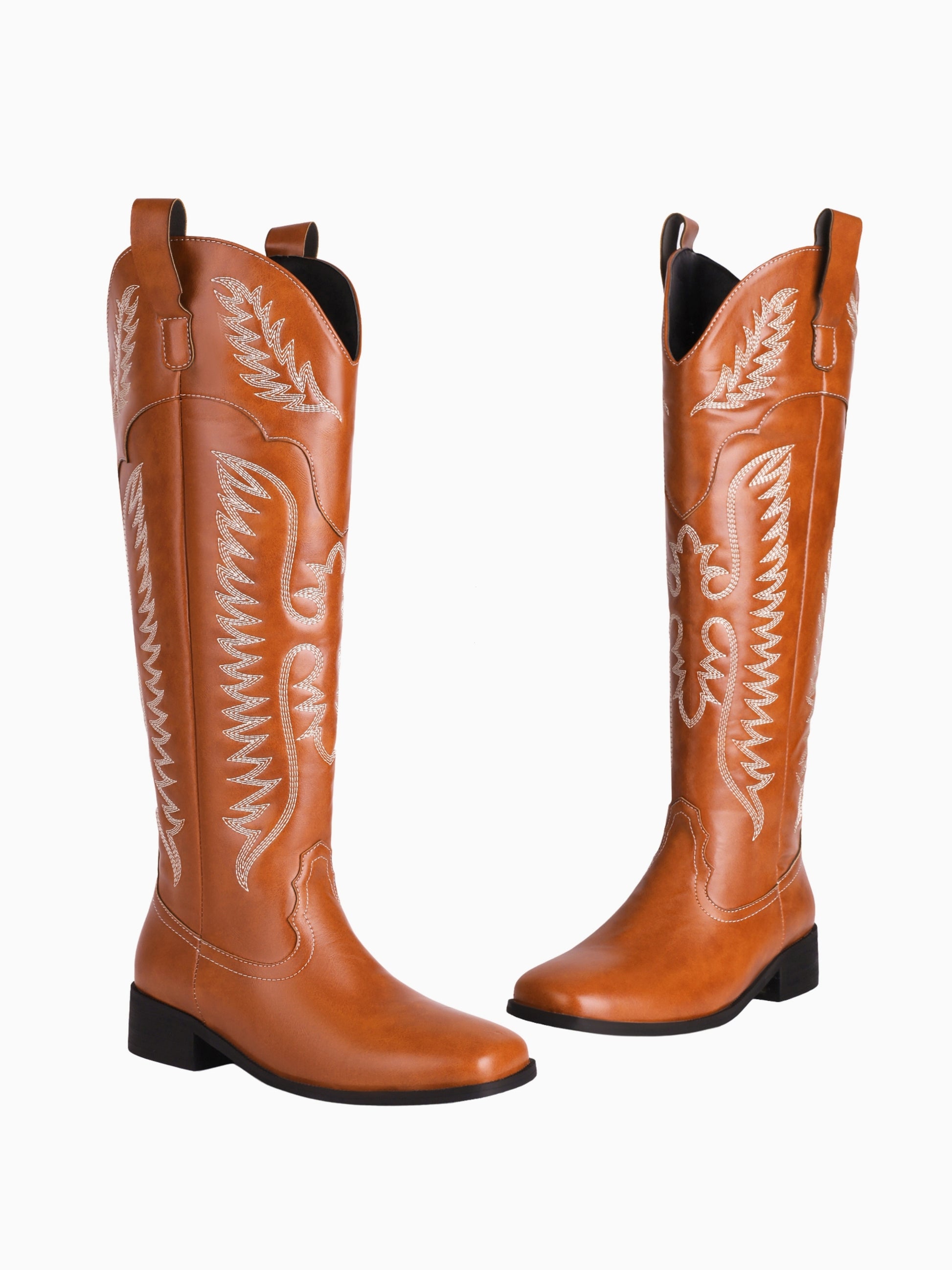 Eagle Wing Knee-High Low Heel Brown Cowgirl Boots Square Toe