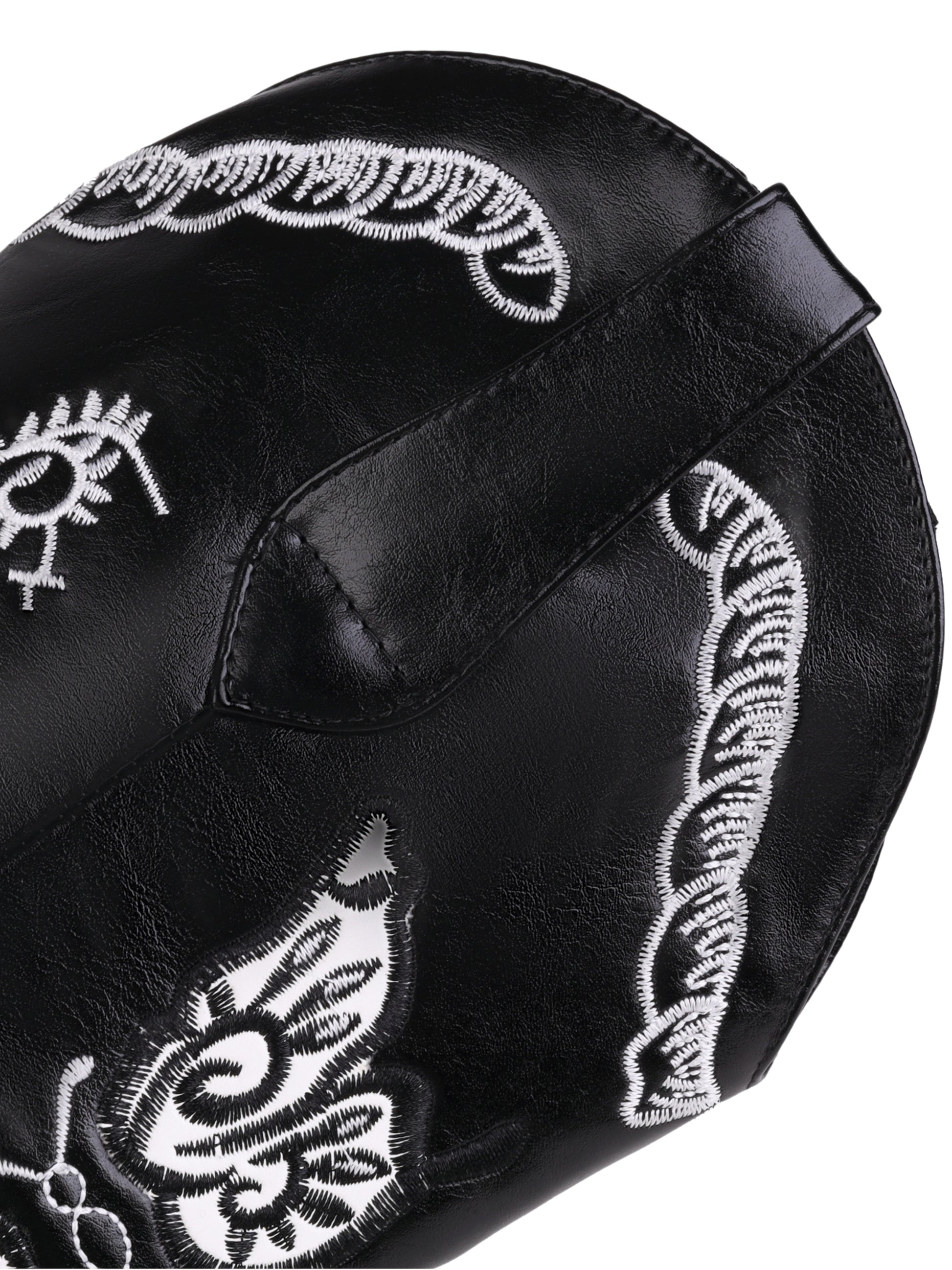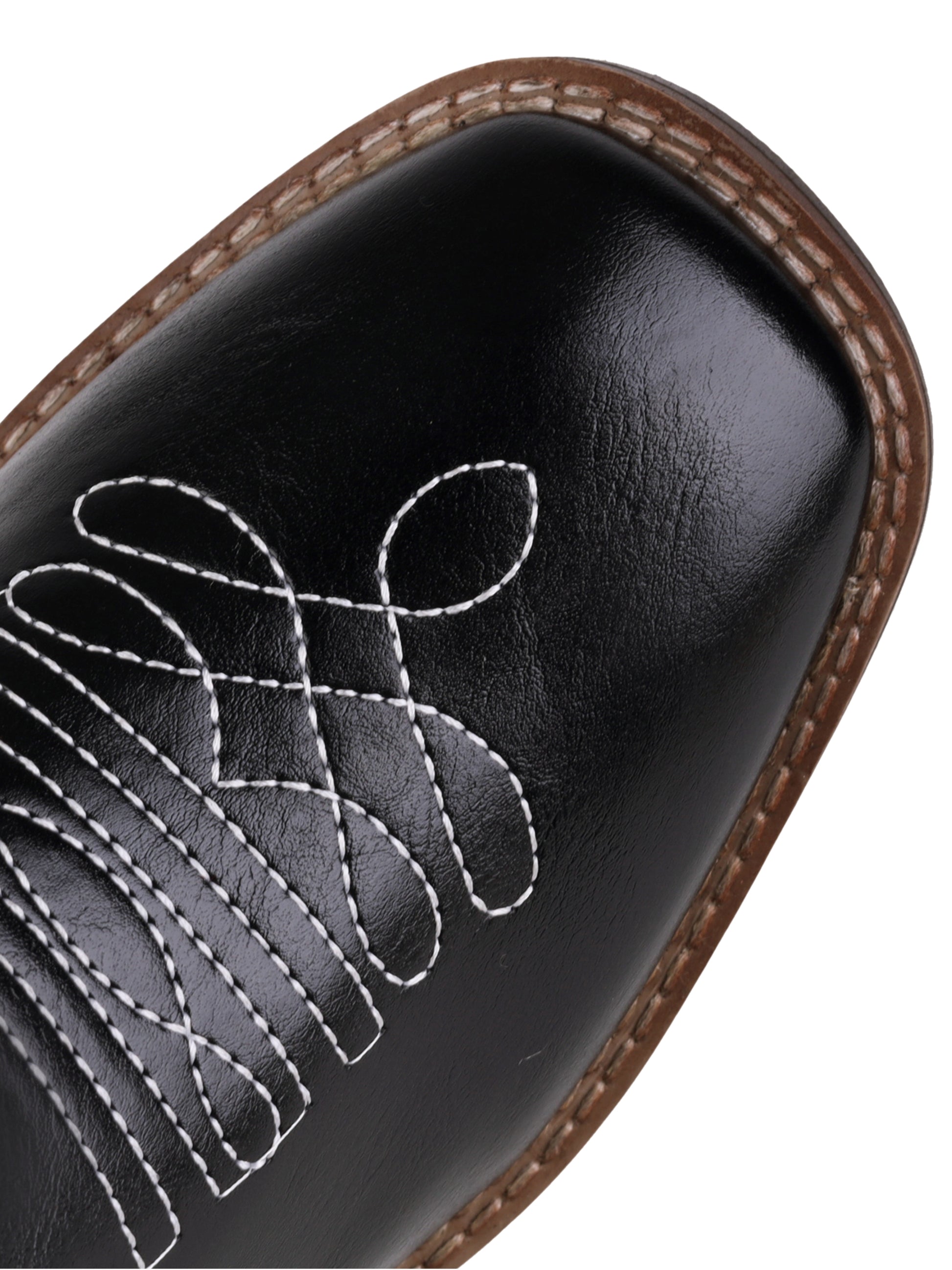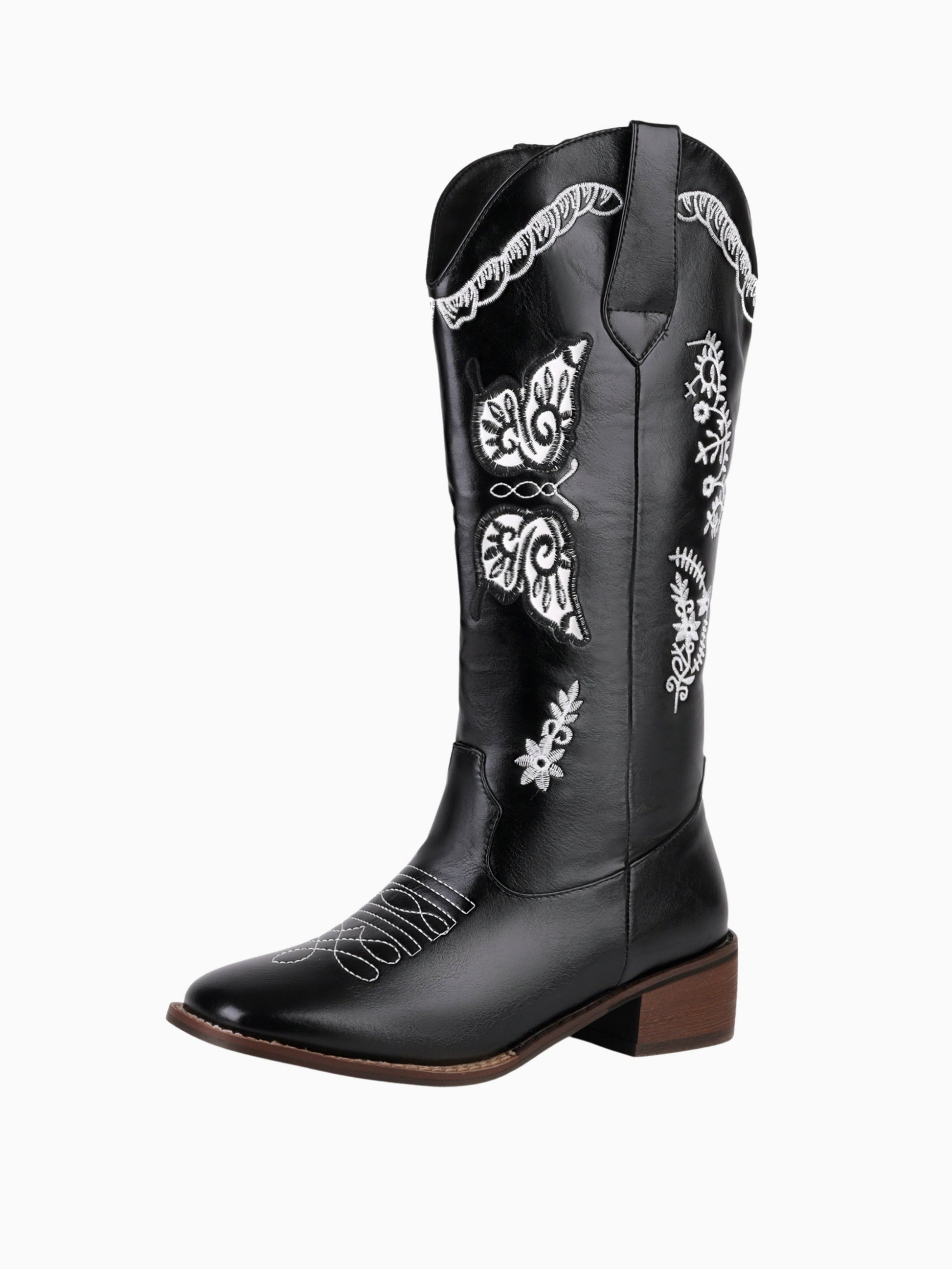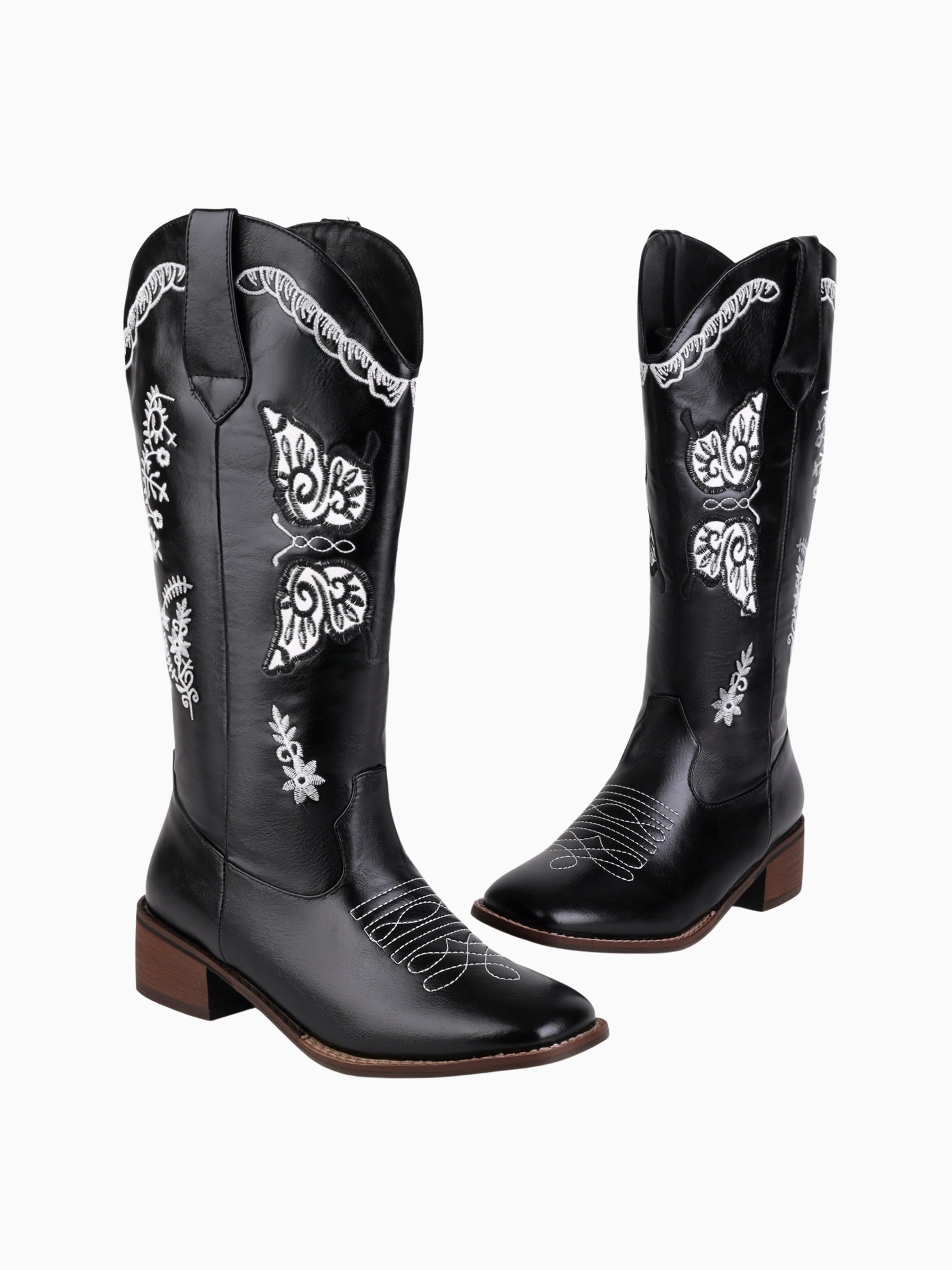 Classic square-toe cowgirl boots in black feature elegant white butterfly embroidery with delicate floral accents.