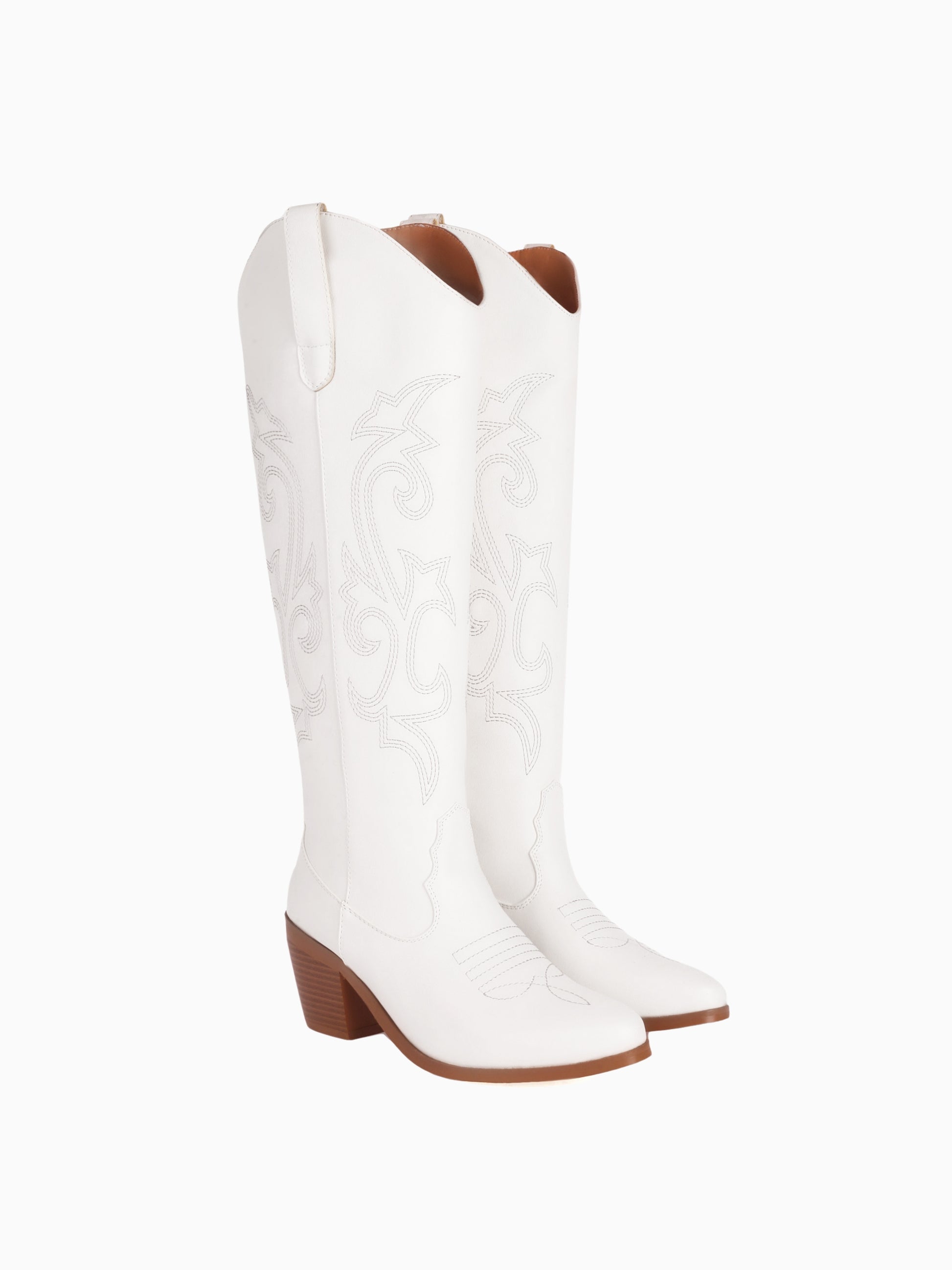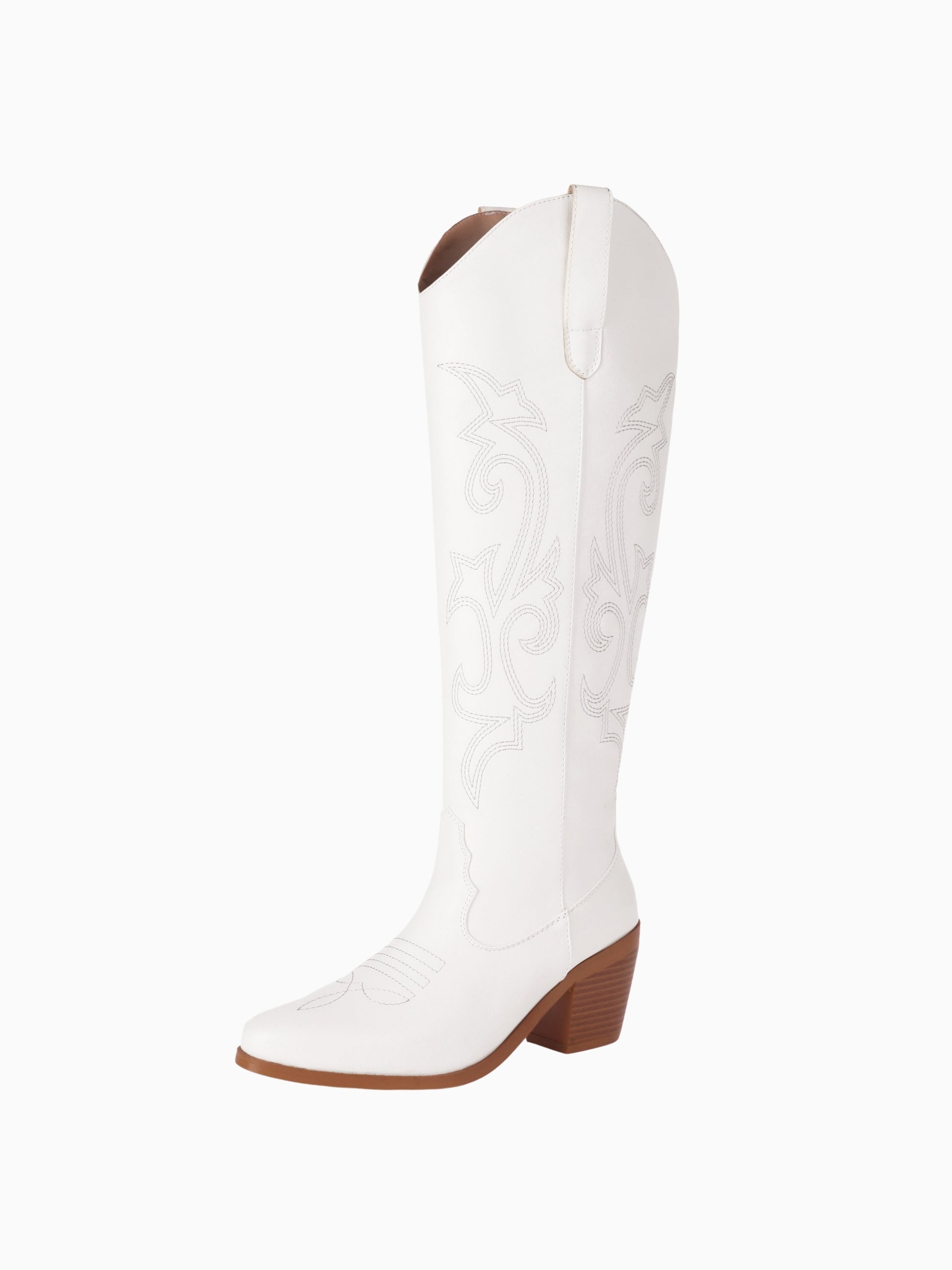 Sophisticated white cowgirl boots featuring delicate scroll stitching patterns and wooden heel, combining timeless Western elegance with modern style.