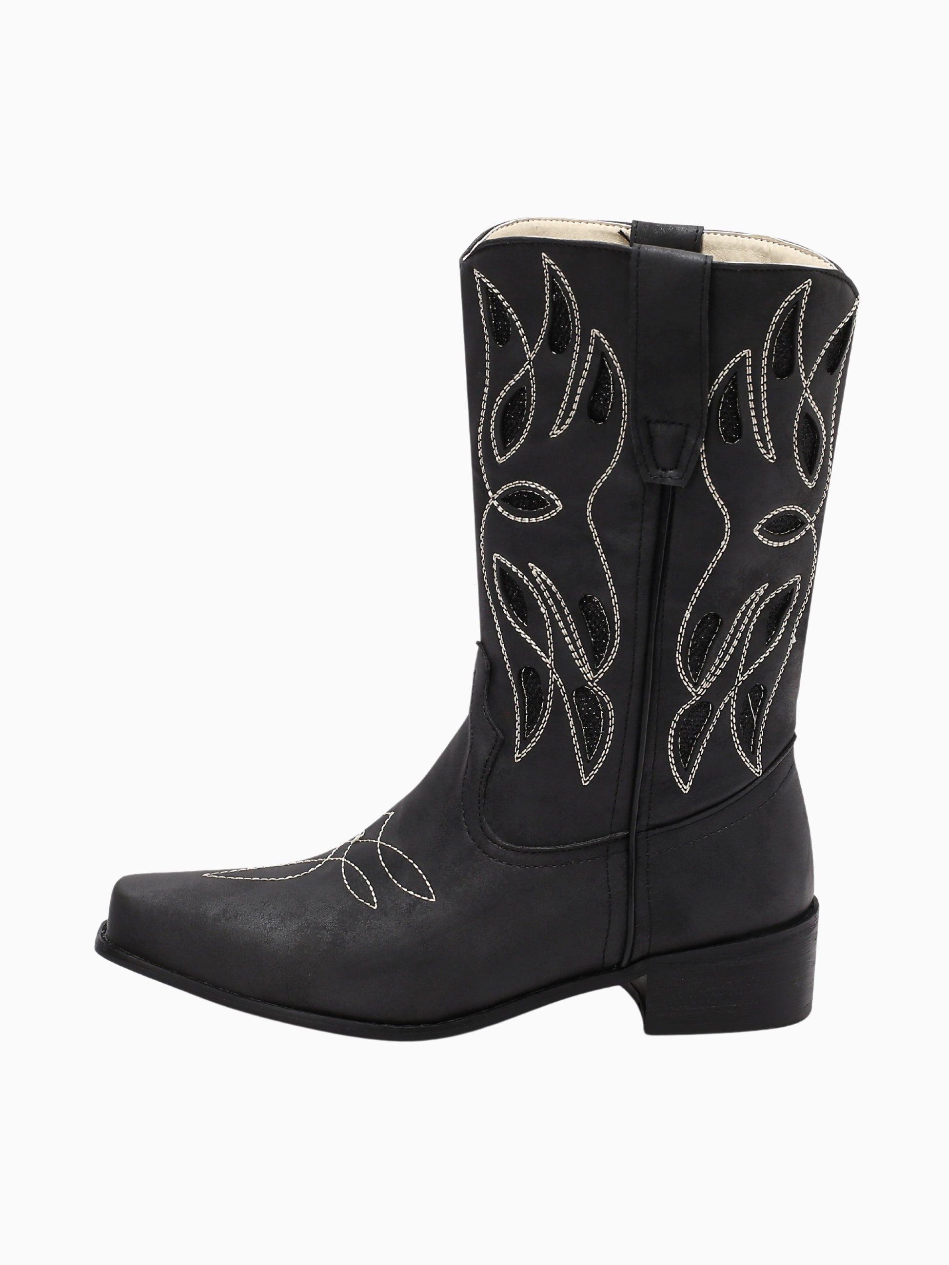 Classic black cowgirl boots featuring elegant white embroidered leaf patterns. Simple yet sophisticated design with pointed toe and low heel creates versatile western style perfect for everyday wear.