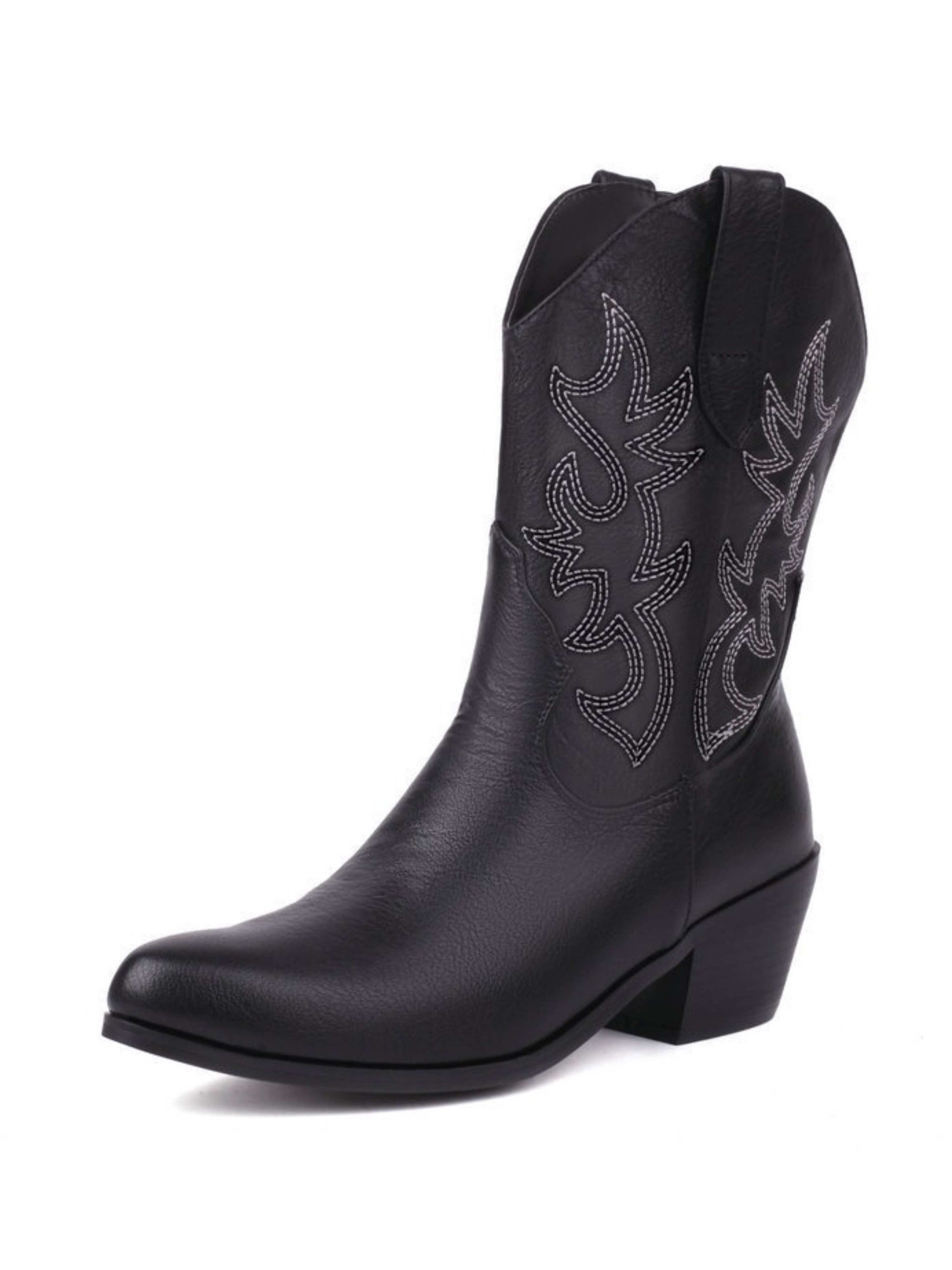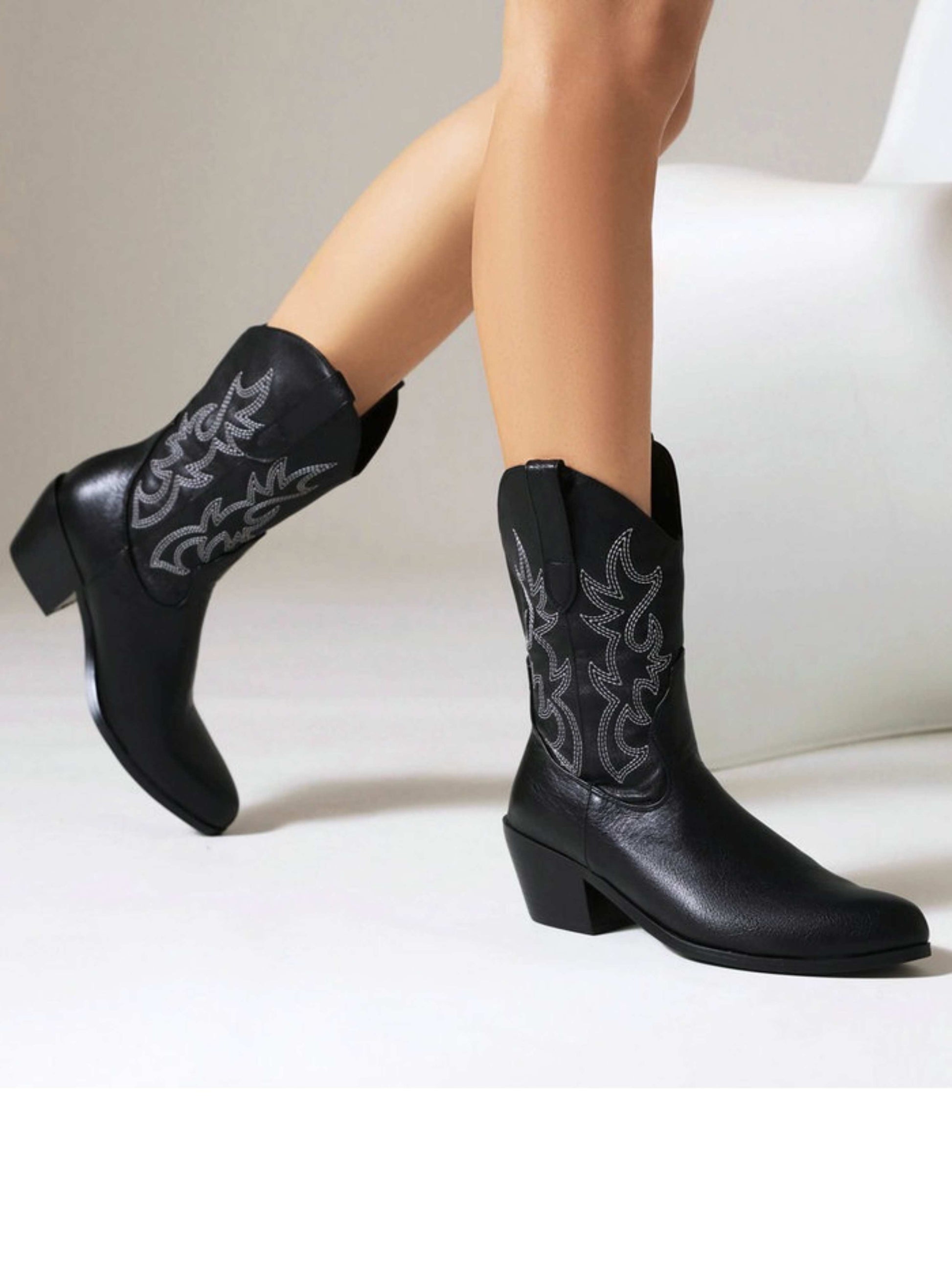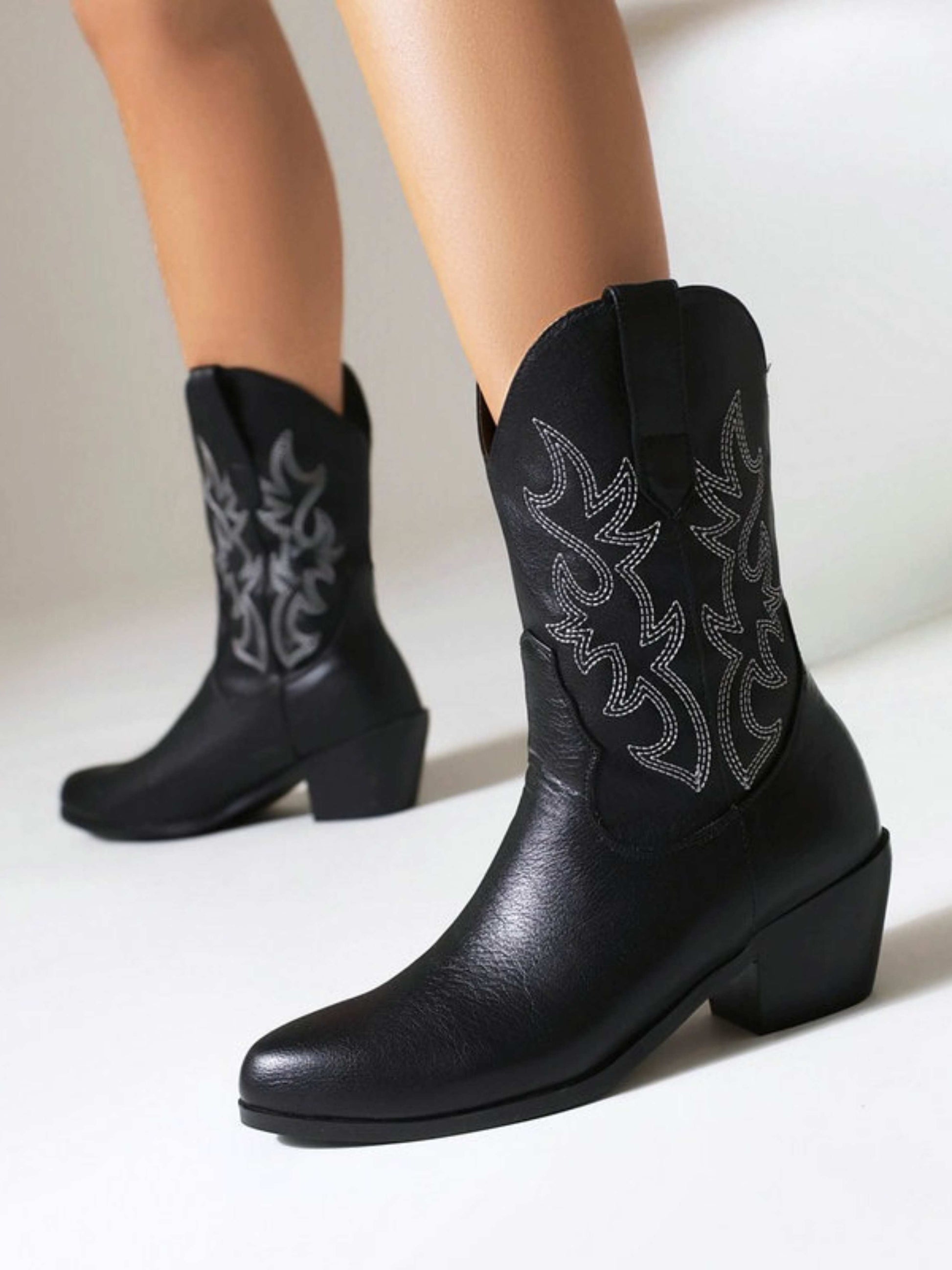 Embroidered Short Black Western Boots for Women features a cloud-embroidered, vintage-inspired finish with classic Western stitching.