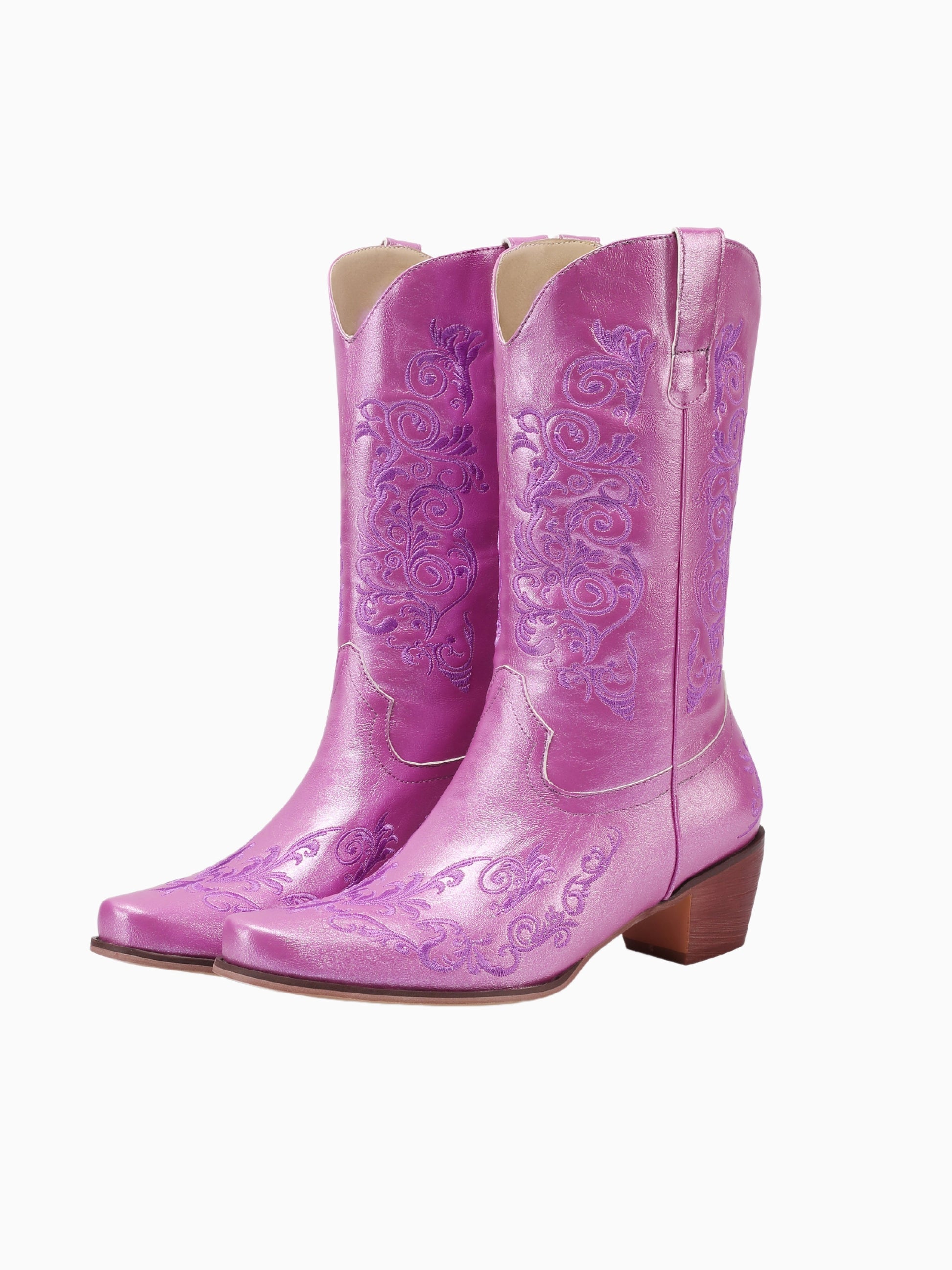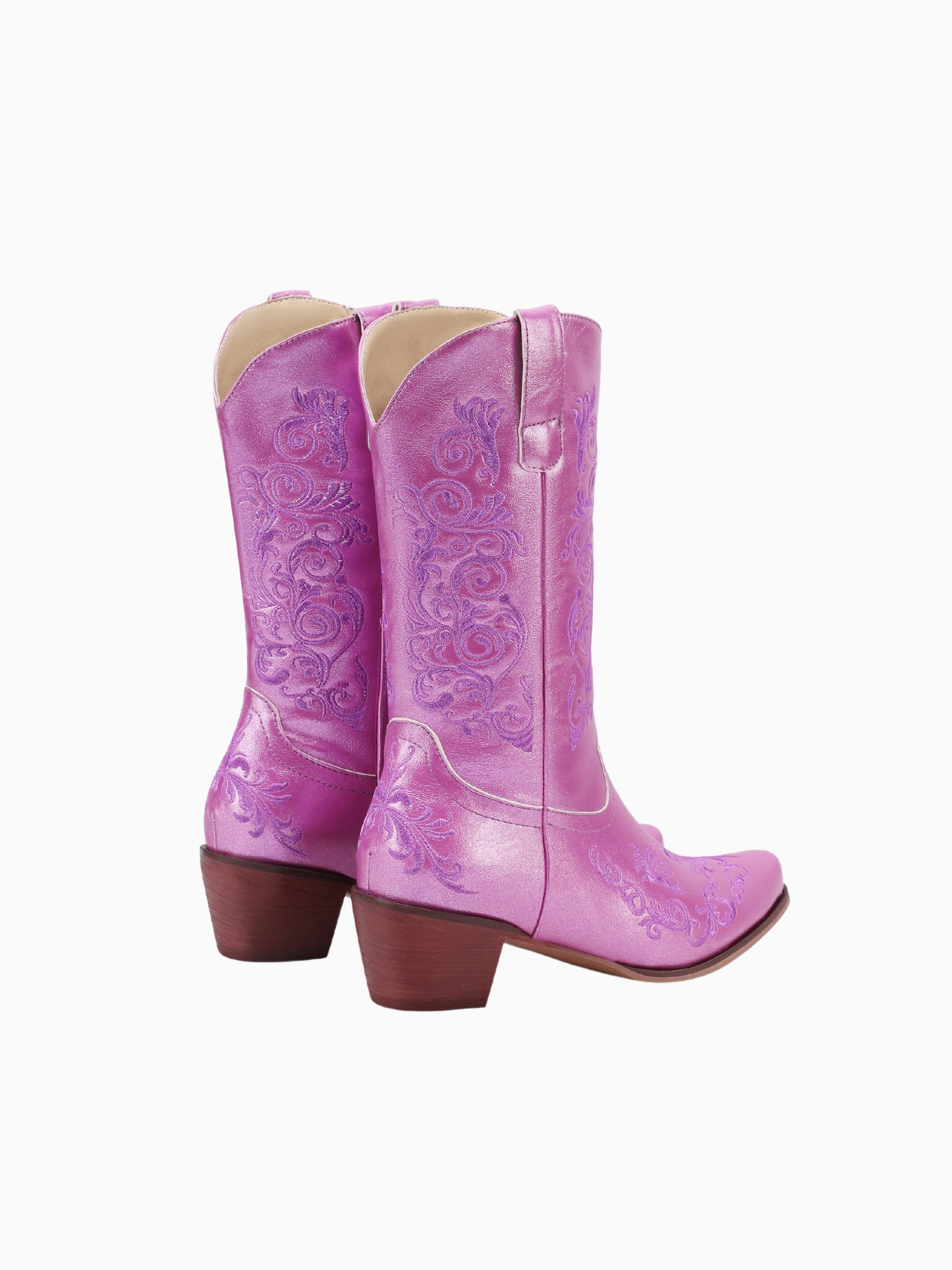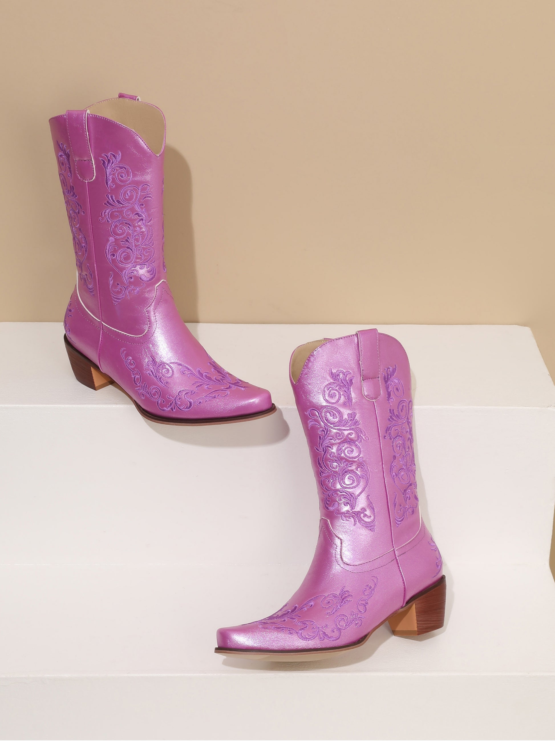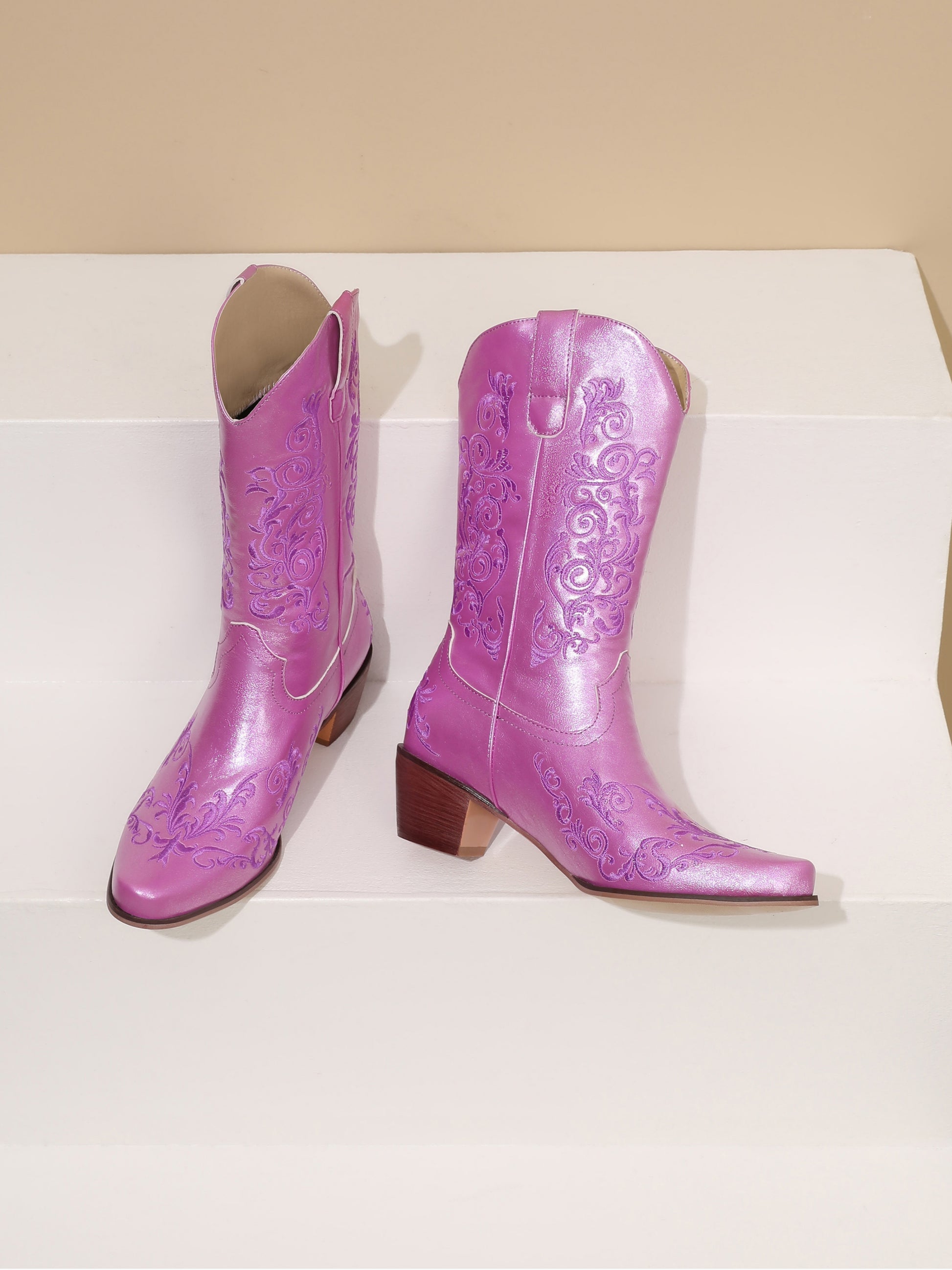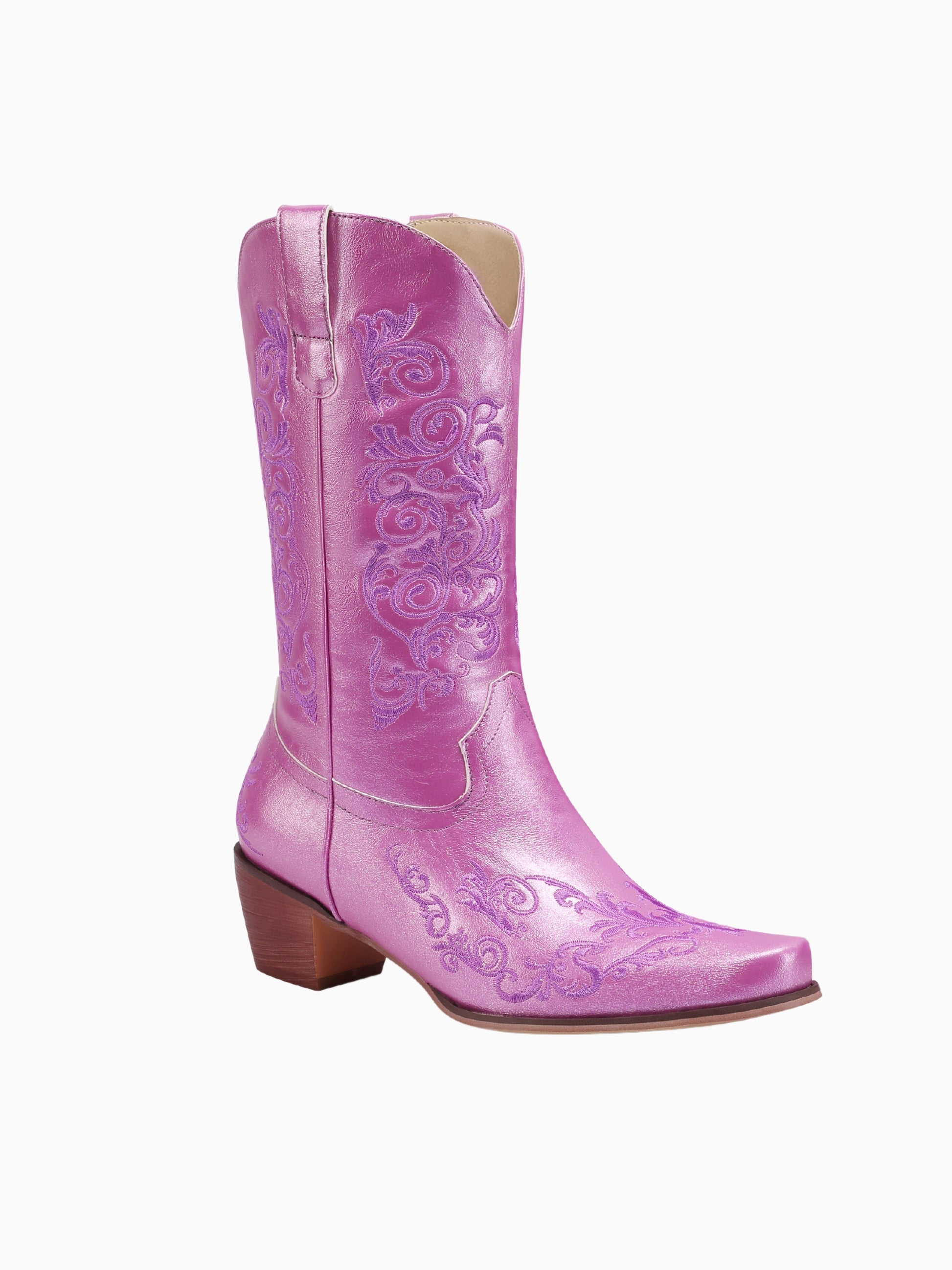 Metallic purple cowgirl boots featuring intricate swirling embroidery patterns, snip toe design, and classic Western silhouette for a glamorous take on traditional style.