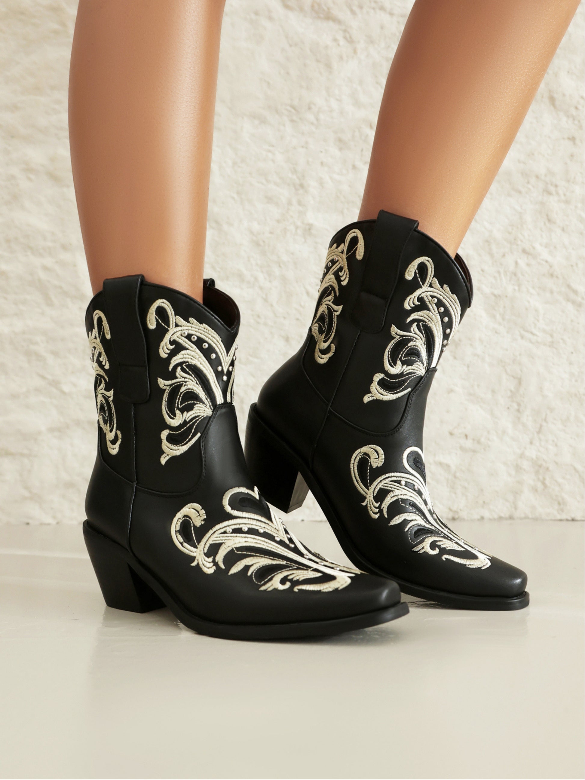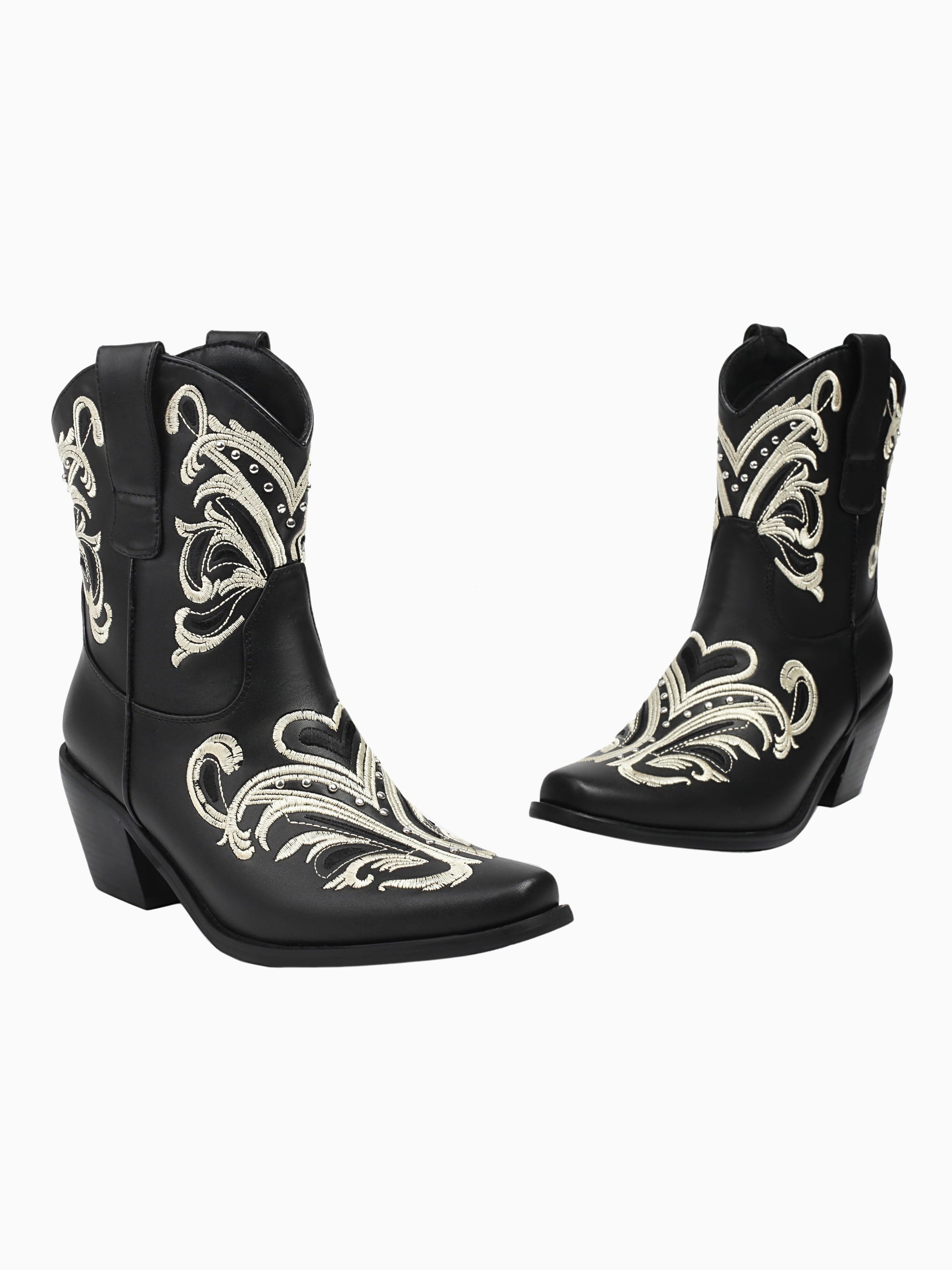 The bold black cowgirl boots feature an intricate embroidered design that creates a captivating, elegant look, blending modern sophistication with the classic Western silhouette.