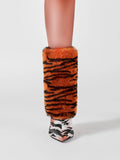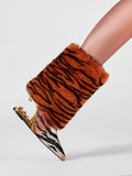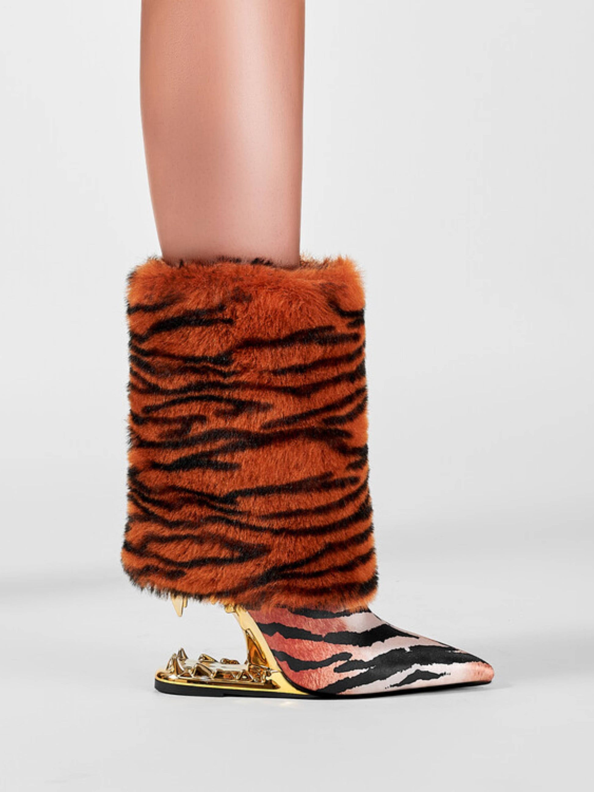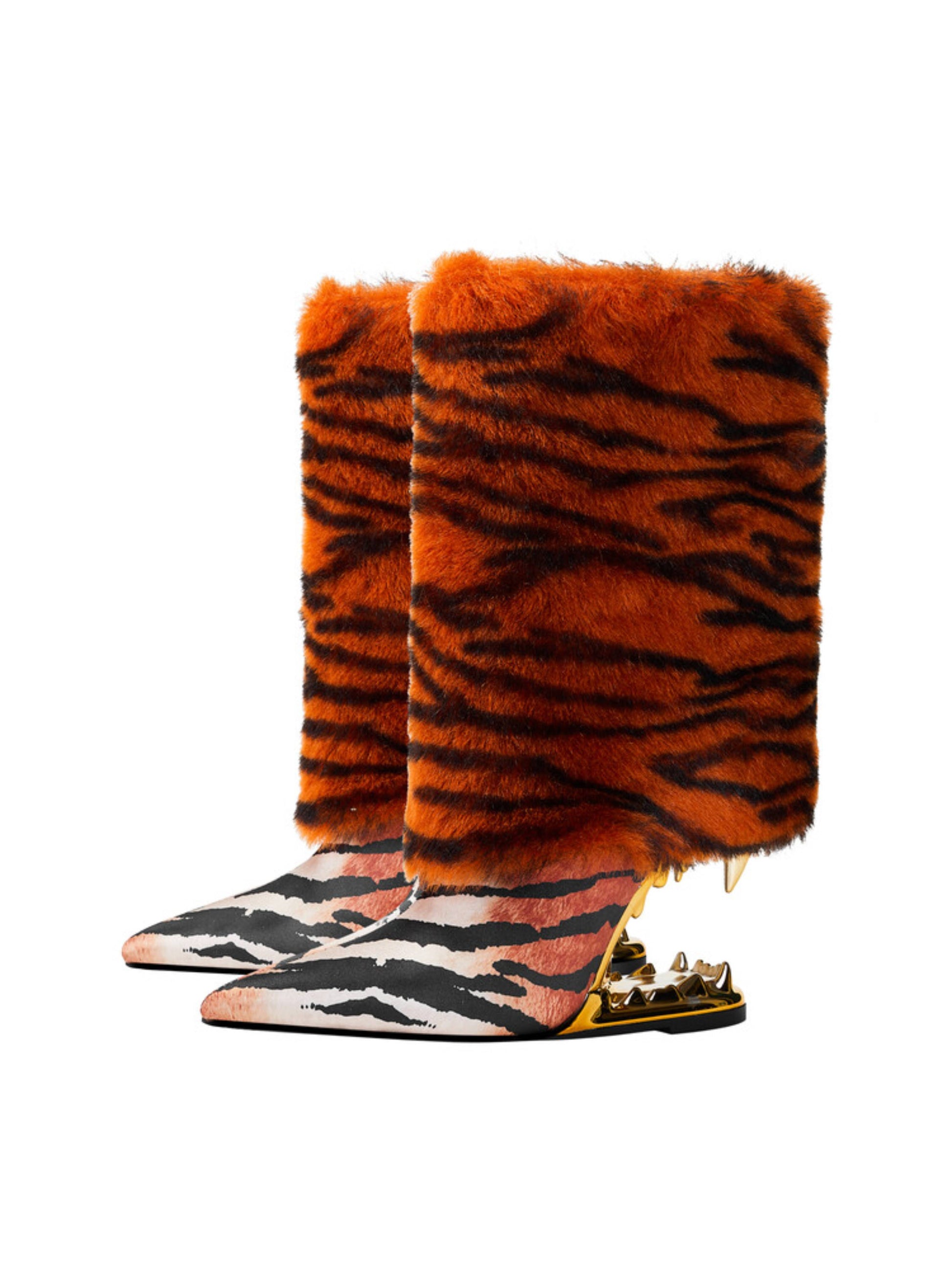 Fashion Furry Brown Tiger Pattern Wedge Teeth High Heel Mid Calf Boots