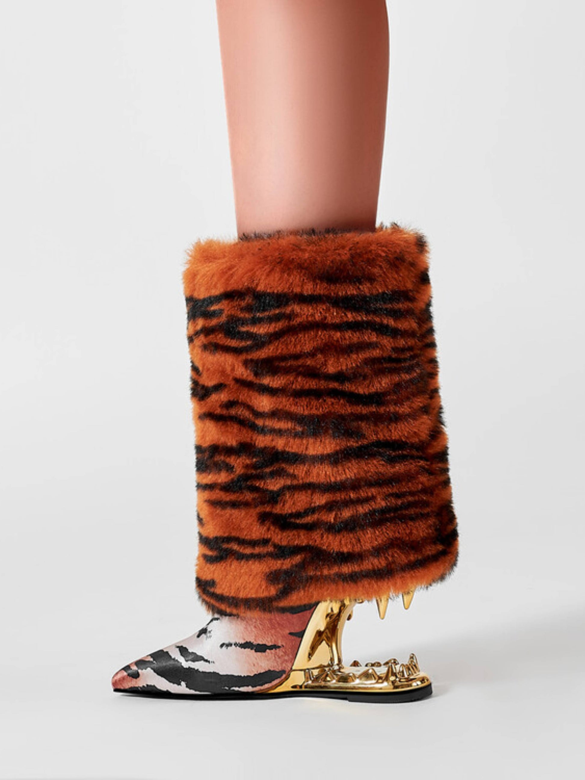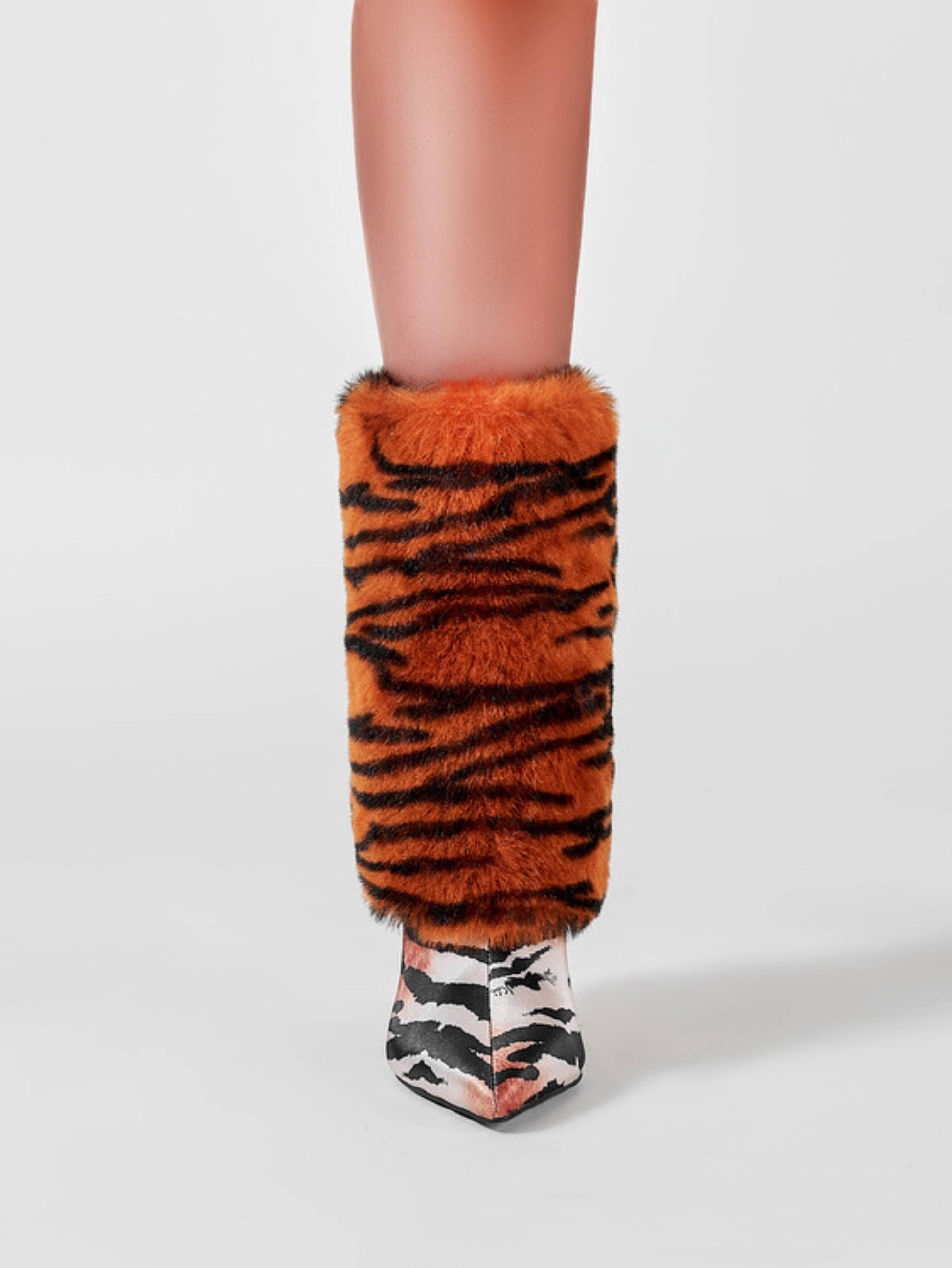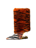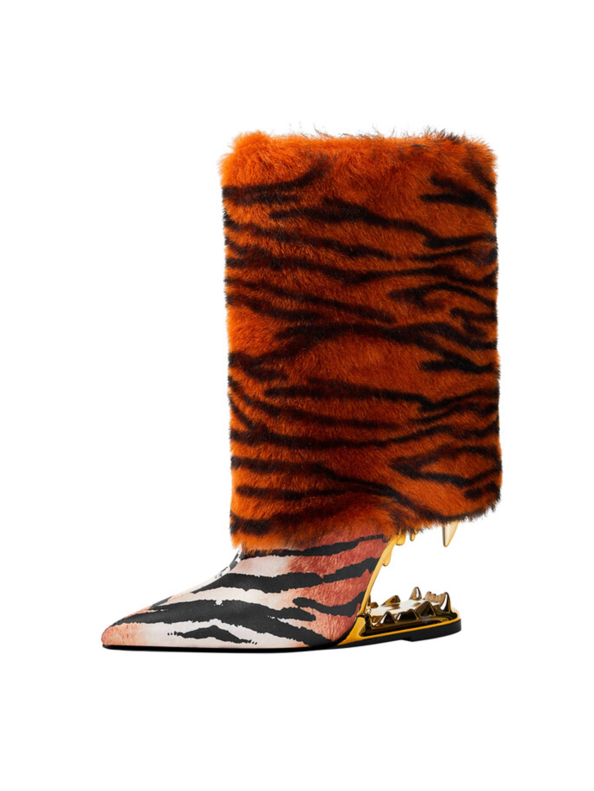 Unleash your wild side with these fashion-forward furry brown tiger pattern wedge boots. Featuring high heels and mid-calf length, these statement boots combine animal print style with comfortable wedge support for bold, eye-catching looks.