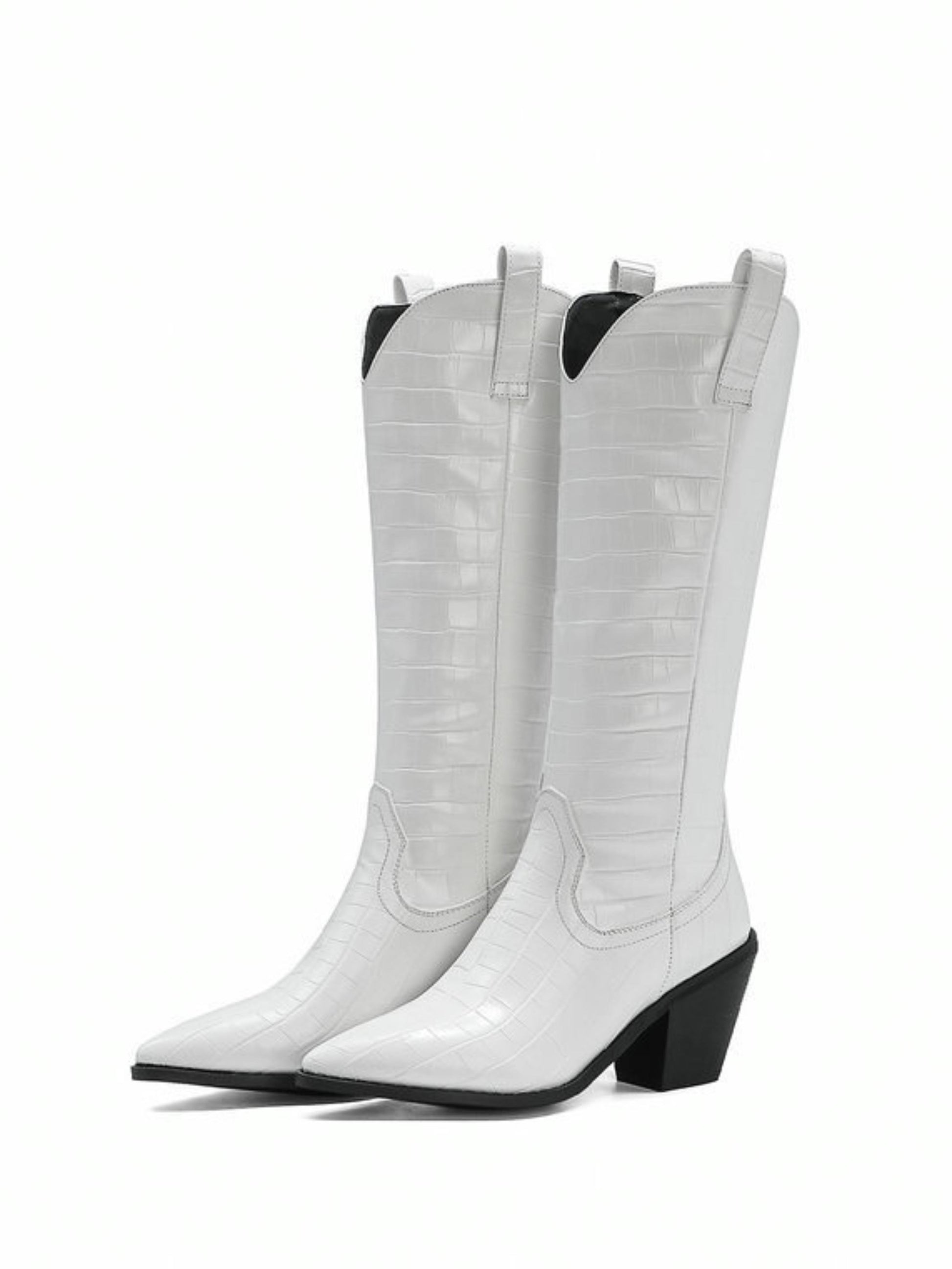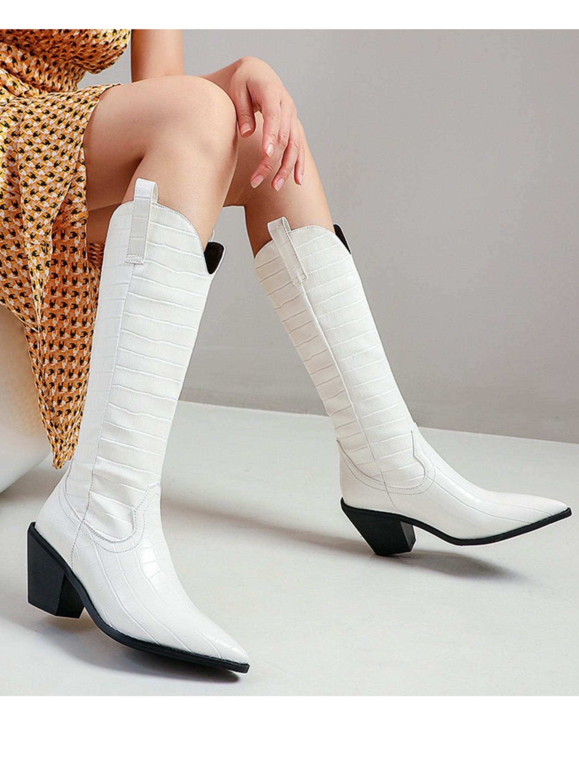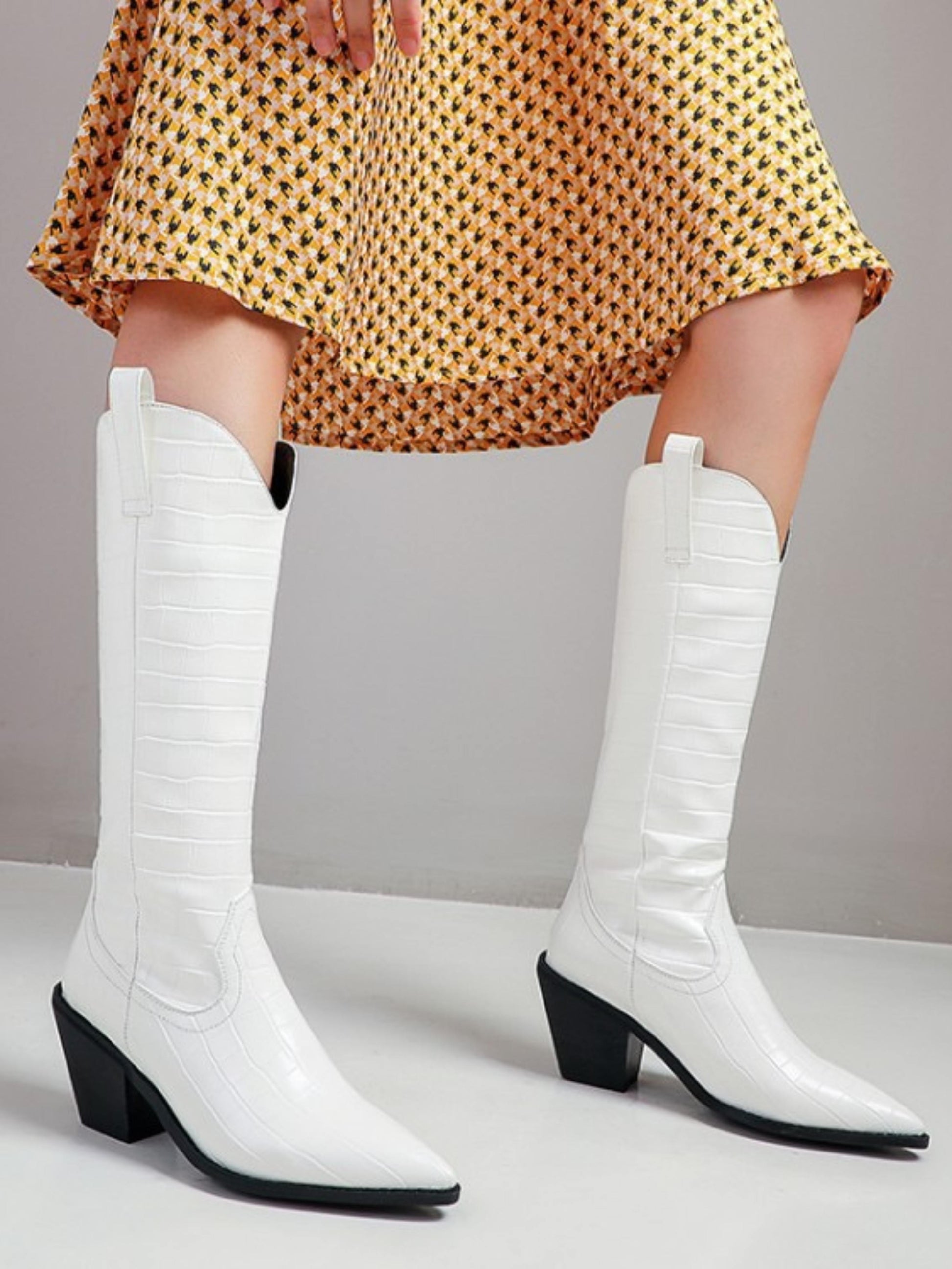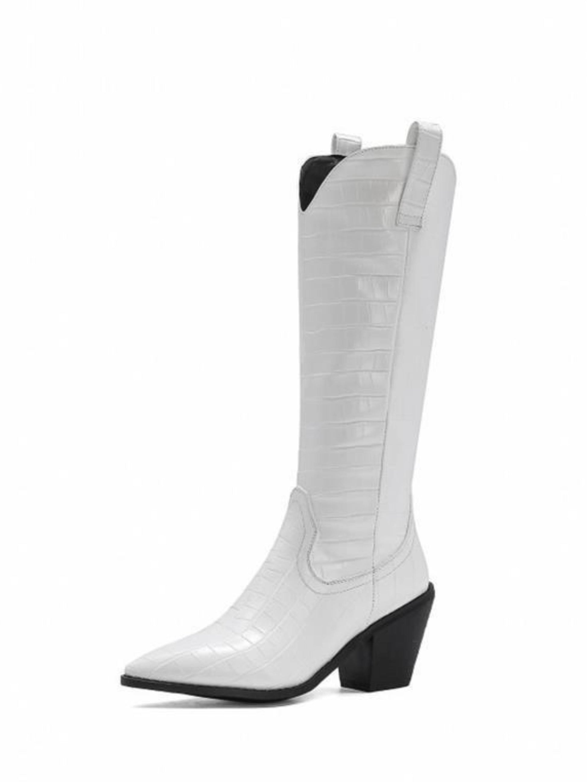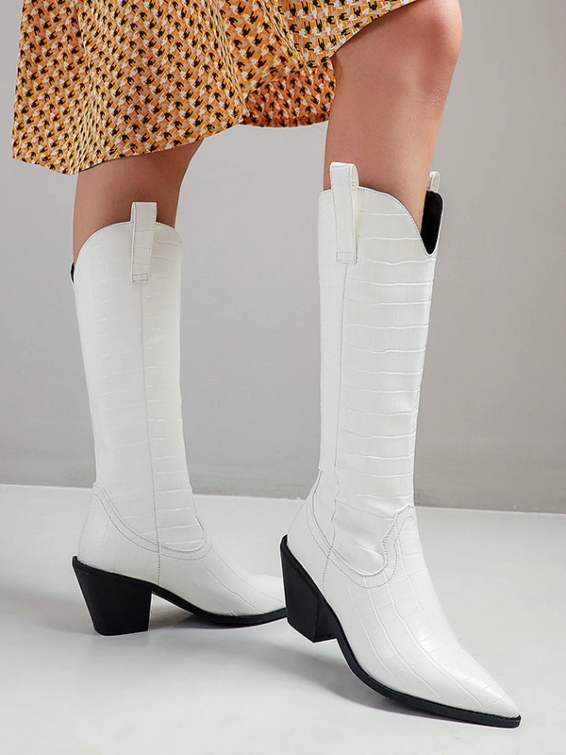 These striking white mid-calf cowboy boots feature an exquisite lizard pattern texture that adds sophisticated dimension to their sleek silhouette. The heel, approximately 3 inches tall, creates an elegant line that elongates the leg.