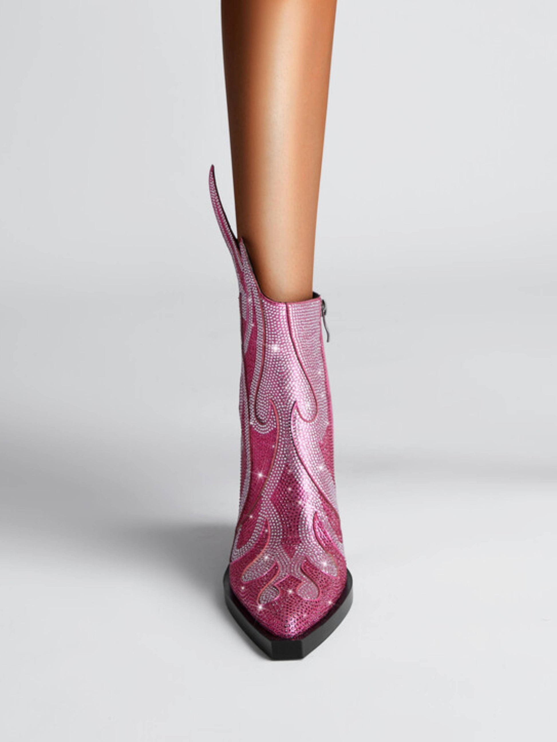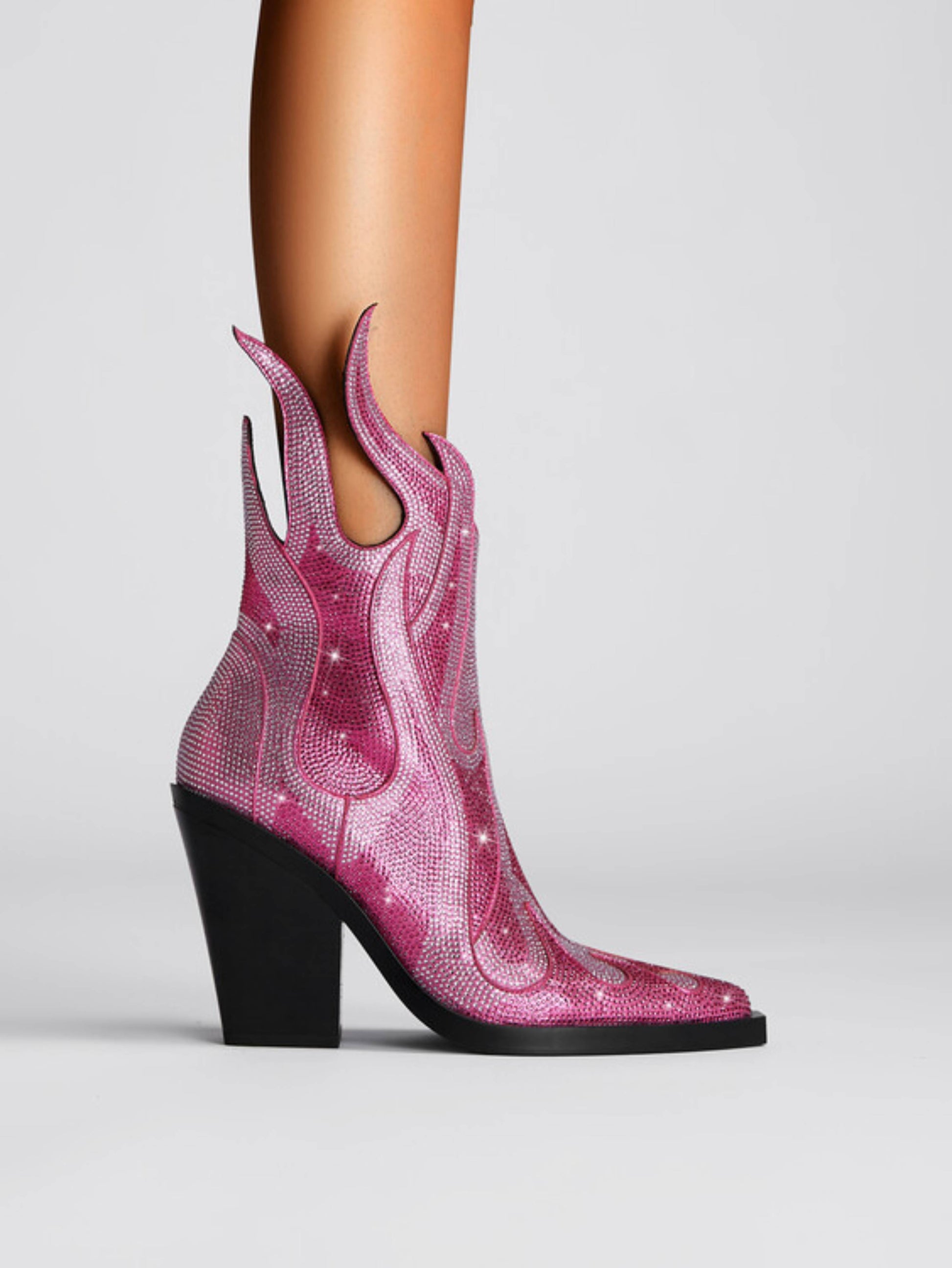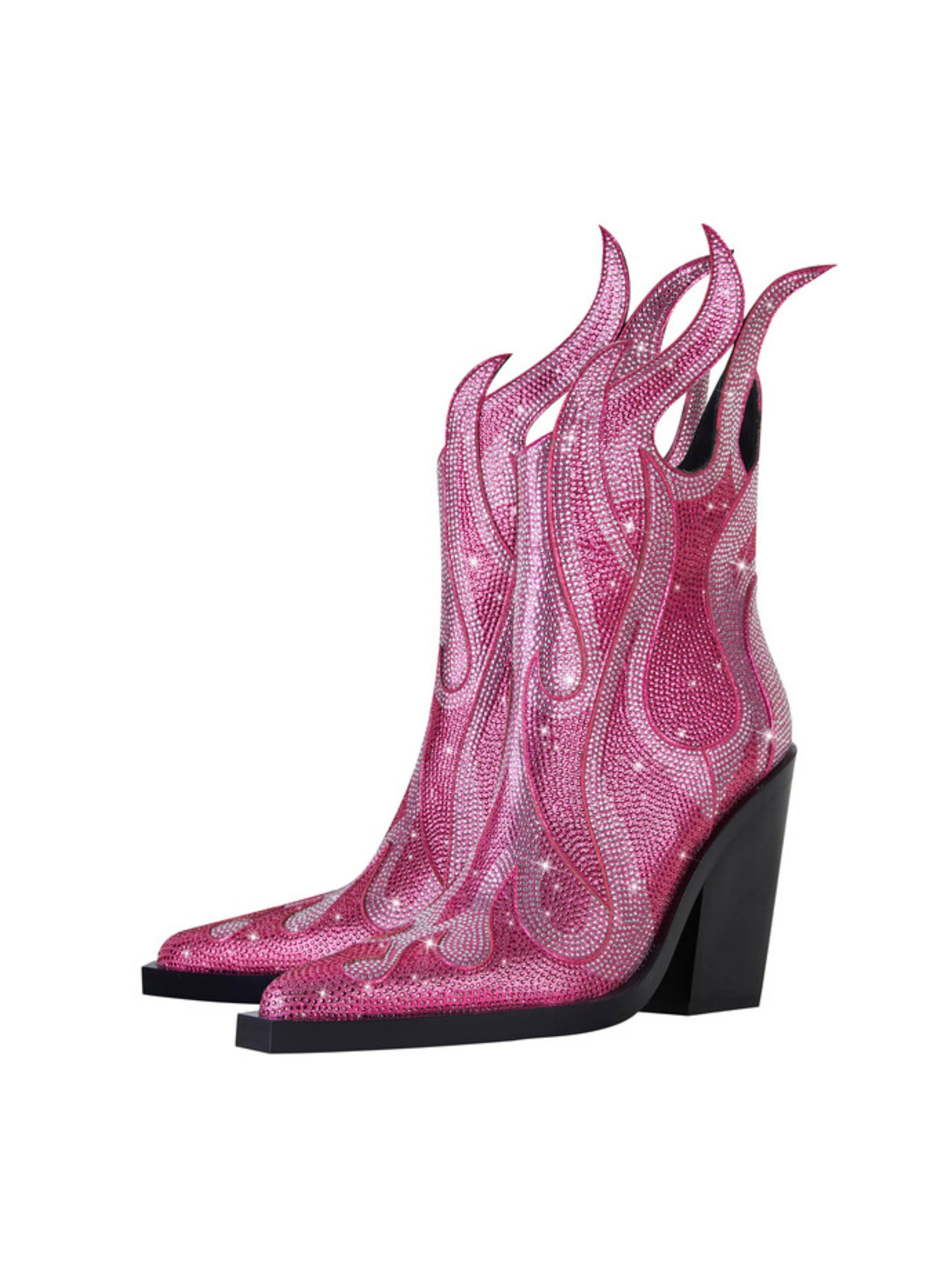 Trendy pink cowgirl boots featuring dazzling rhinestone flame shape details, stylish western heels, and fashionable design. These statement boots blend feminine pink color with sparkling fire embellishments, ideal for fashion rhinestone cowboy boots and bold pink embellished western footwear enthusiasts.
