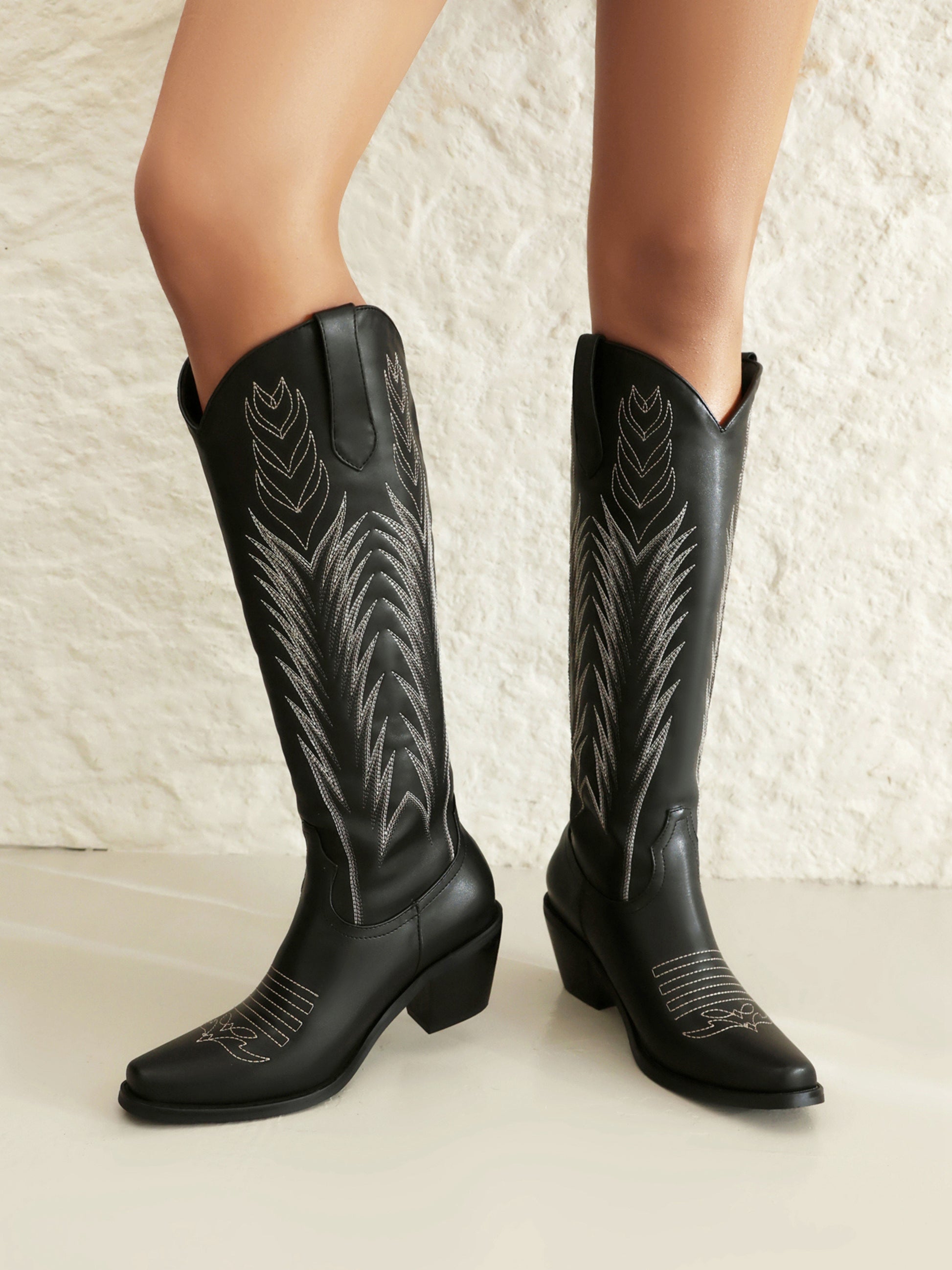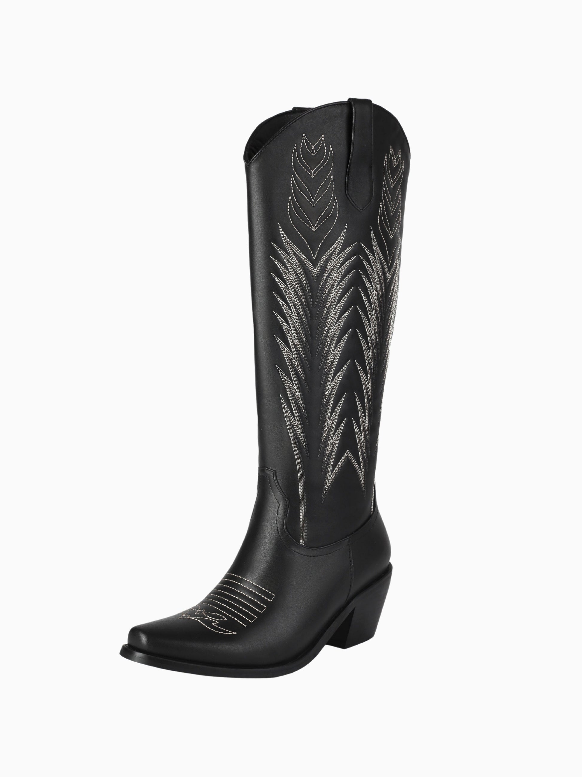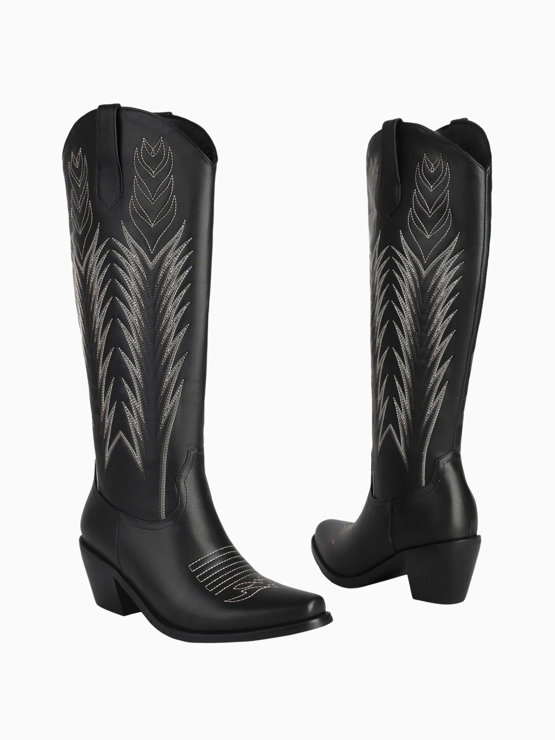 Classic Western cowboy boots featuring elegant silver feather embroidery patterns and traditional stitching perfect for modern cowgirls.