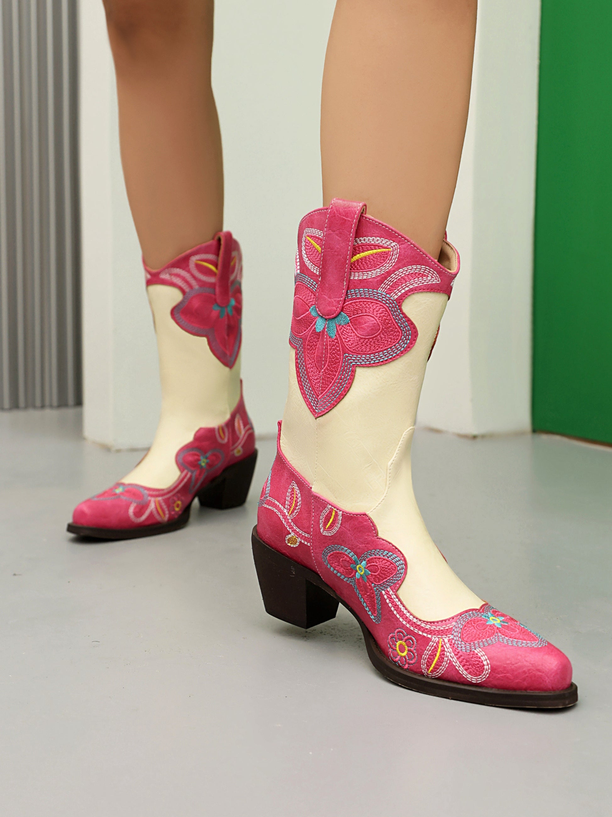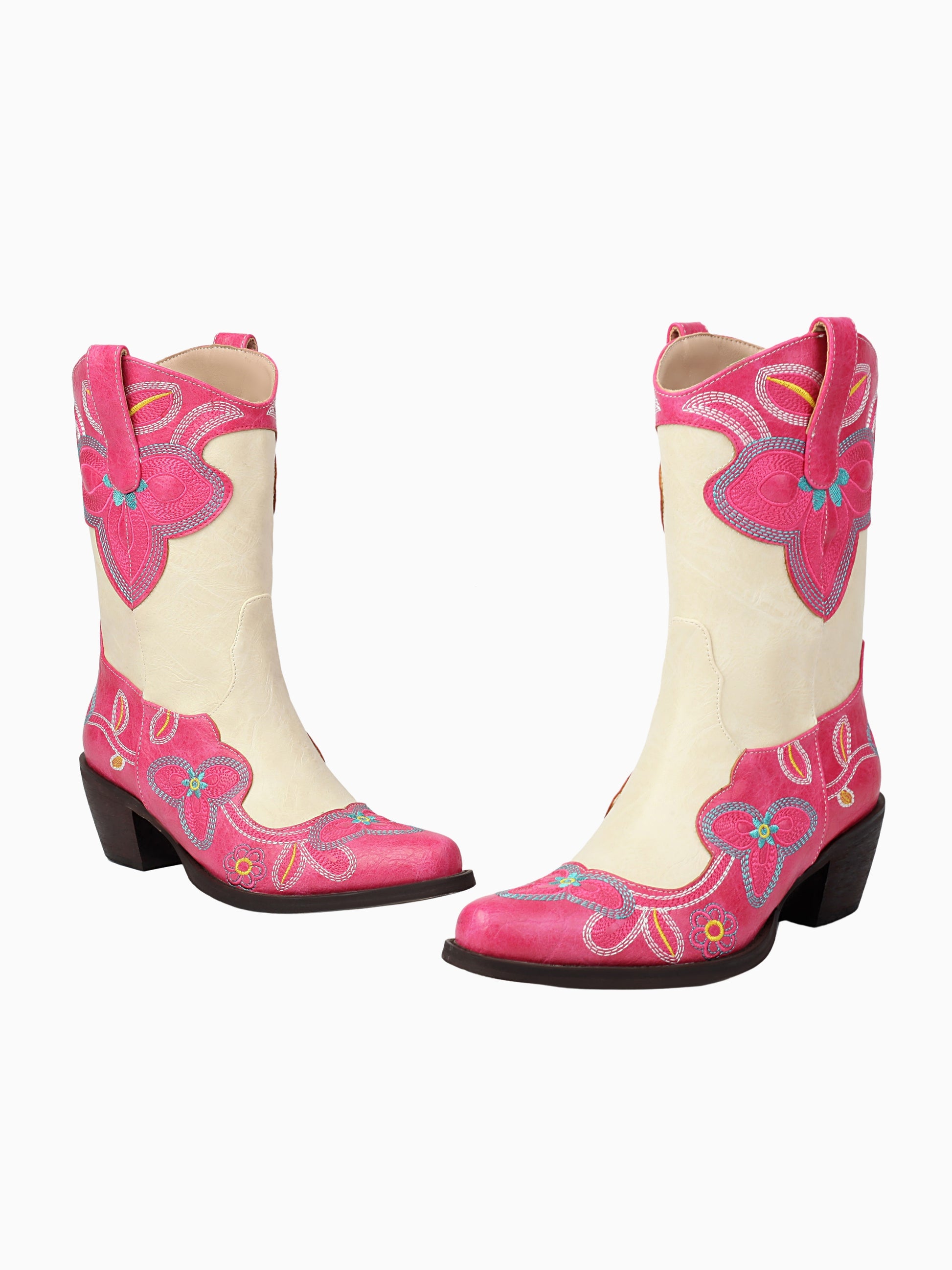 Charming two-tone cowgirl boots featuring vibrant pink floral embroidery on cream base, accented with turquoise stitching and stacked heel.
