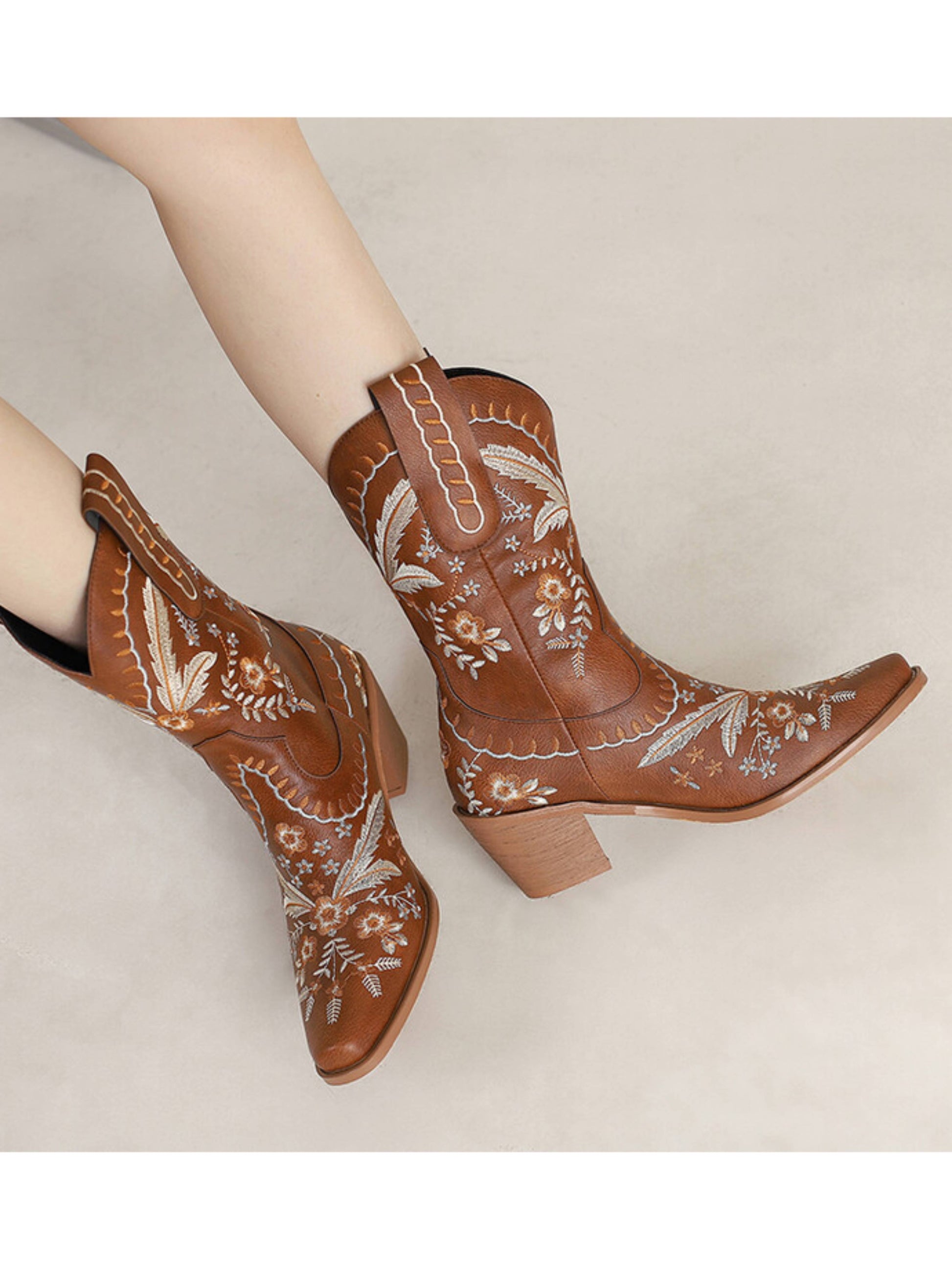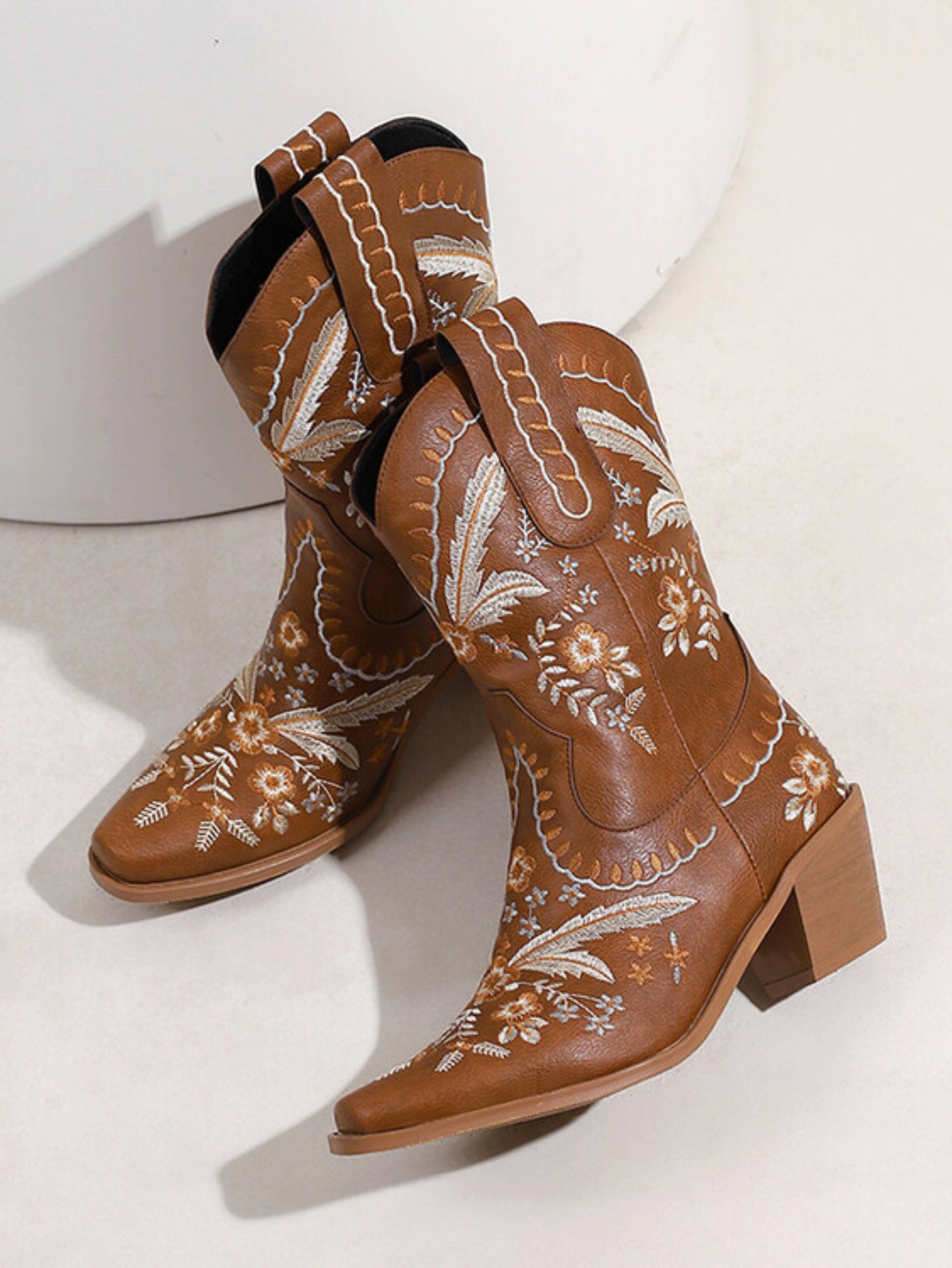Ladies' Brown Western Heel Embroidered Floral Cowgirl Boots feature a comfortable block mid-heel and snip toe for modern cowgirl style.