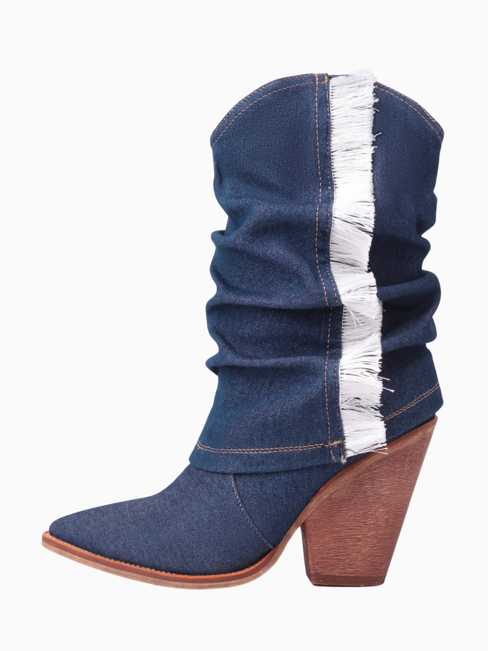 Crafted with premium denim, these stunning cowgirl boots feature elegant white fringe detailing and a slouchy silhouette. The chunky heel adds modern flair, while contrast stitching complements the classic Western design. Perfect for both country charm and urban style.