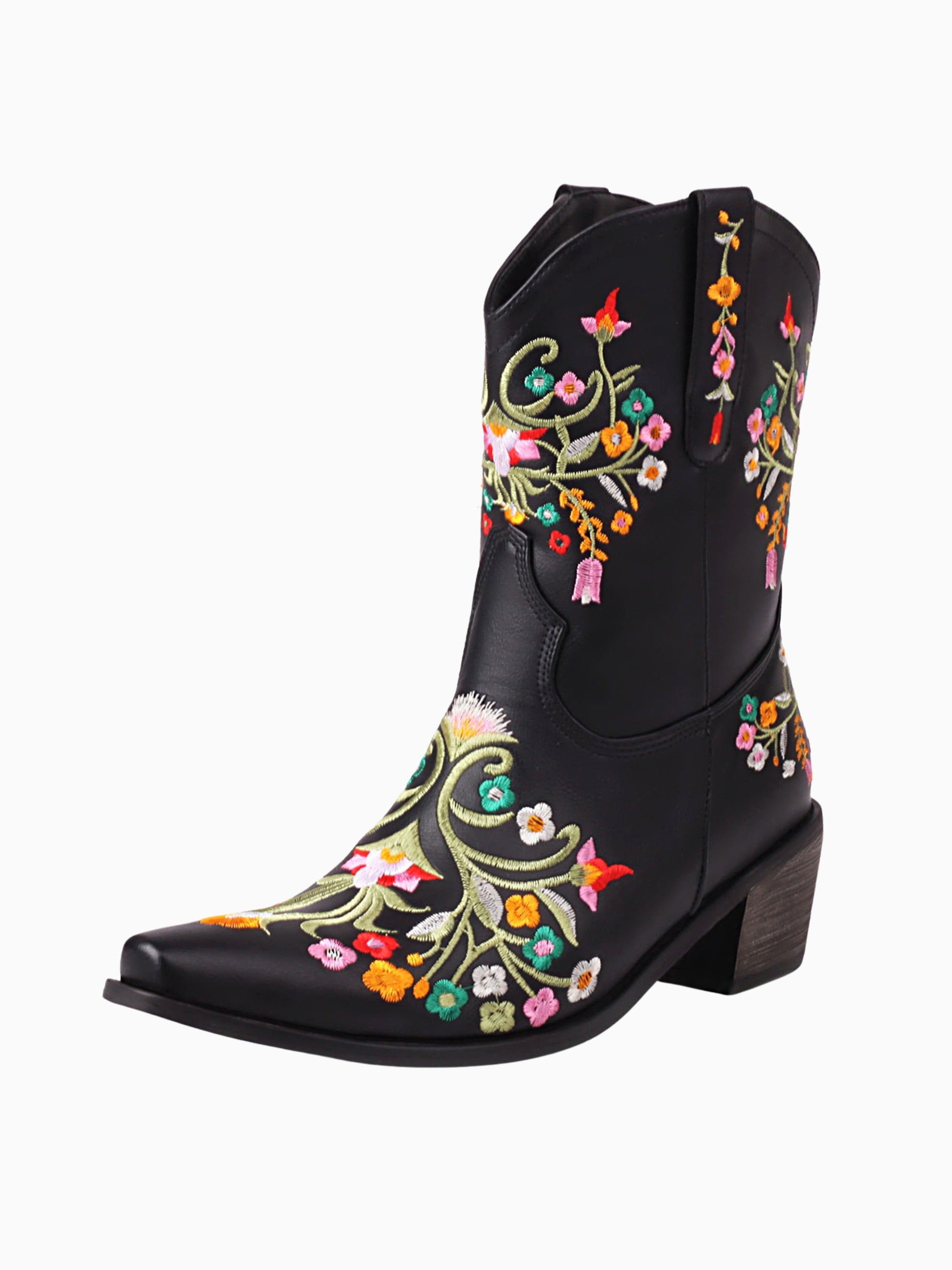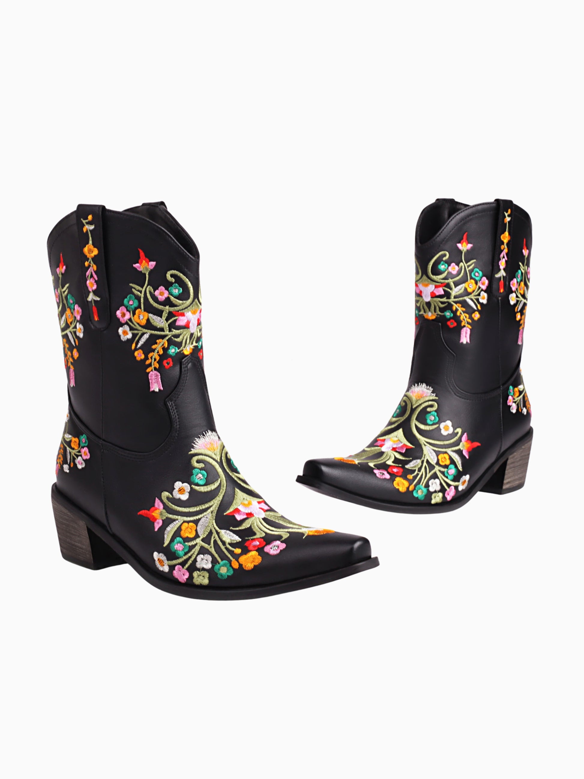 Stunning black cowgirl boots adorned with vibrant floral embroidery featuring colorful blooms and swirling vines, perfect for making a statement.
