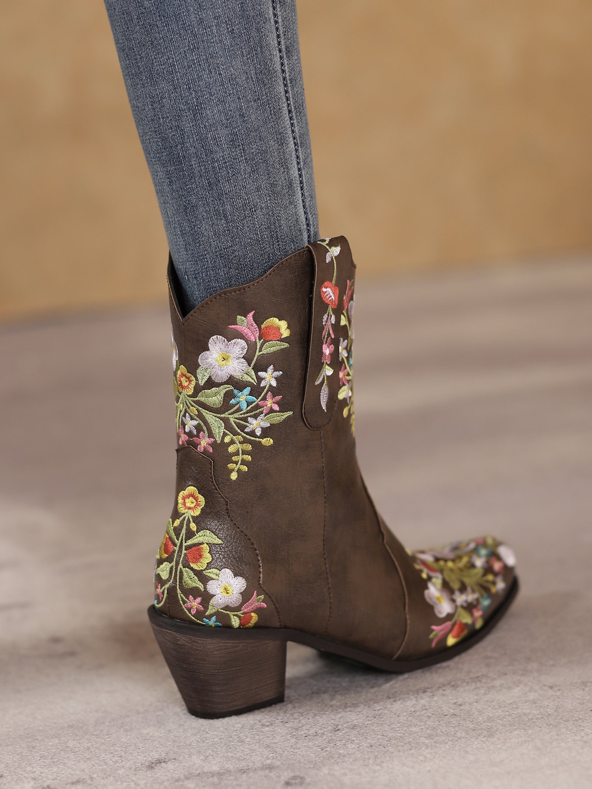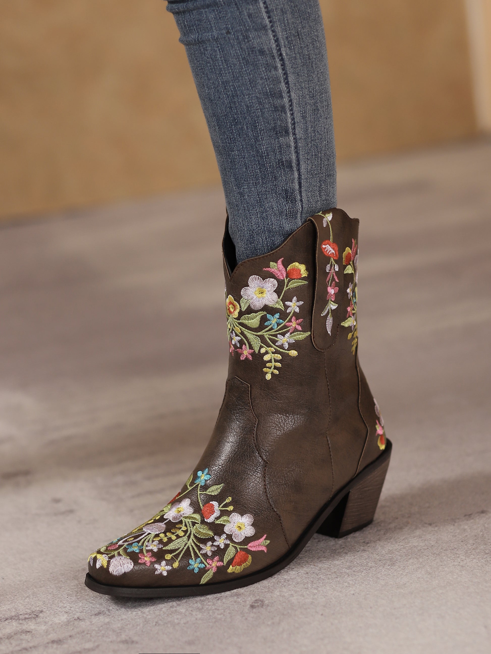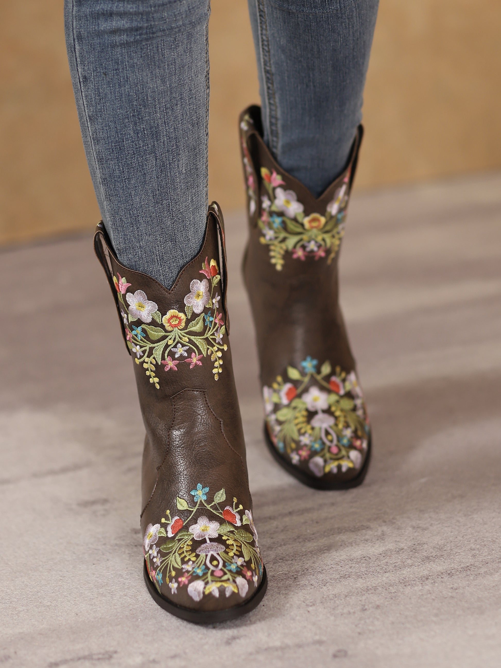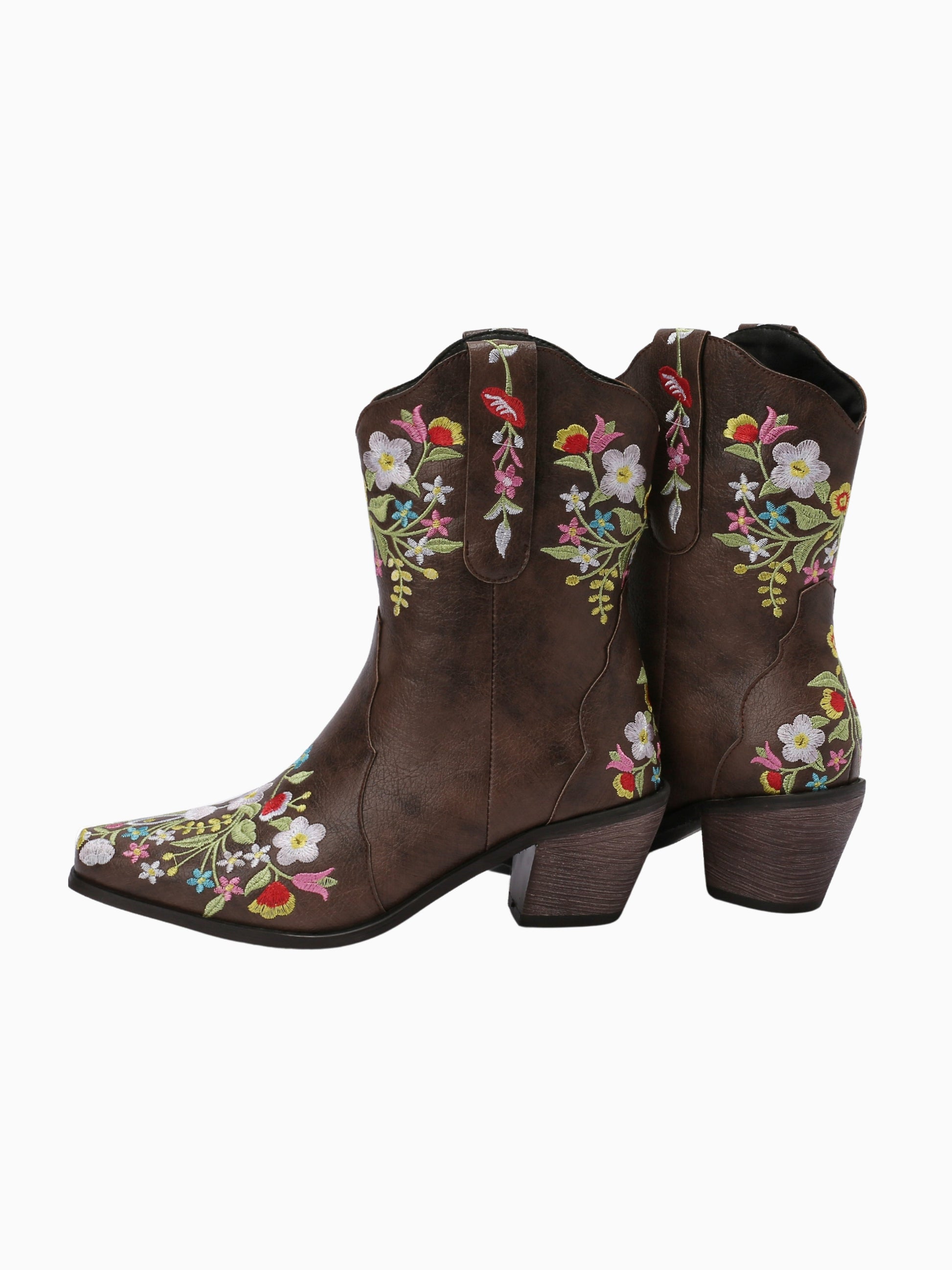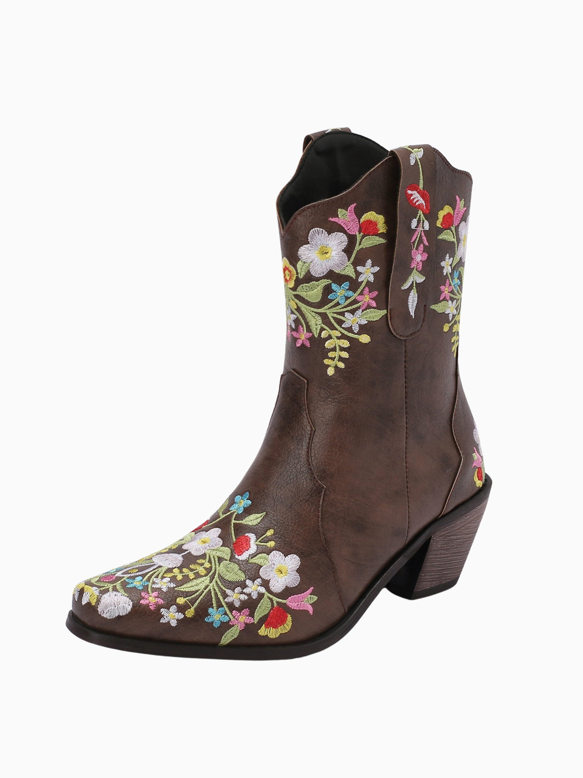 Enchanting ankle-height Western boots blending vintage charm with contemporary flair, showcasing a whimsical garden of colorfully embroidered flowers on rich dark brown material.