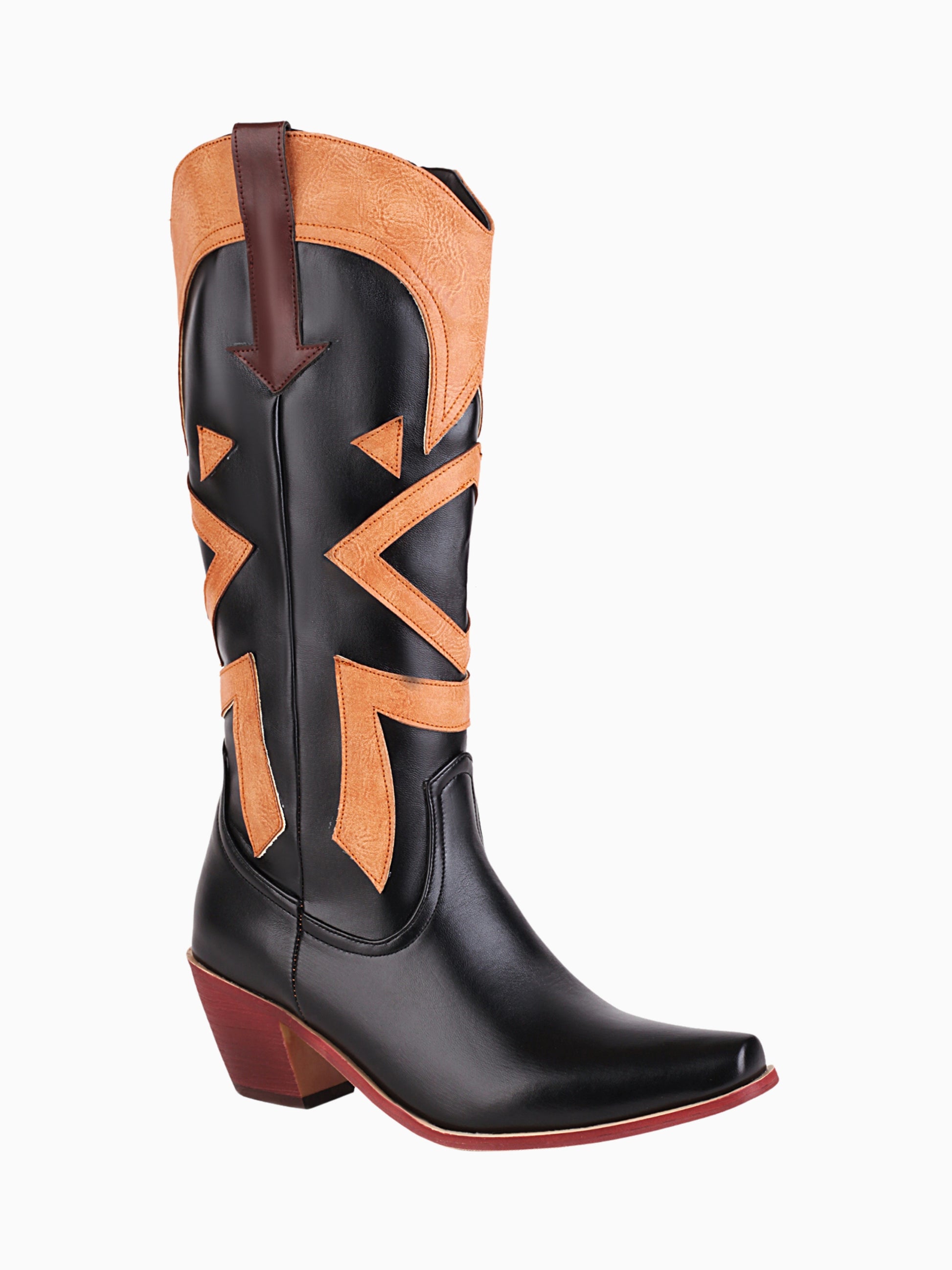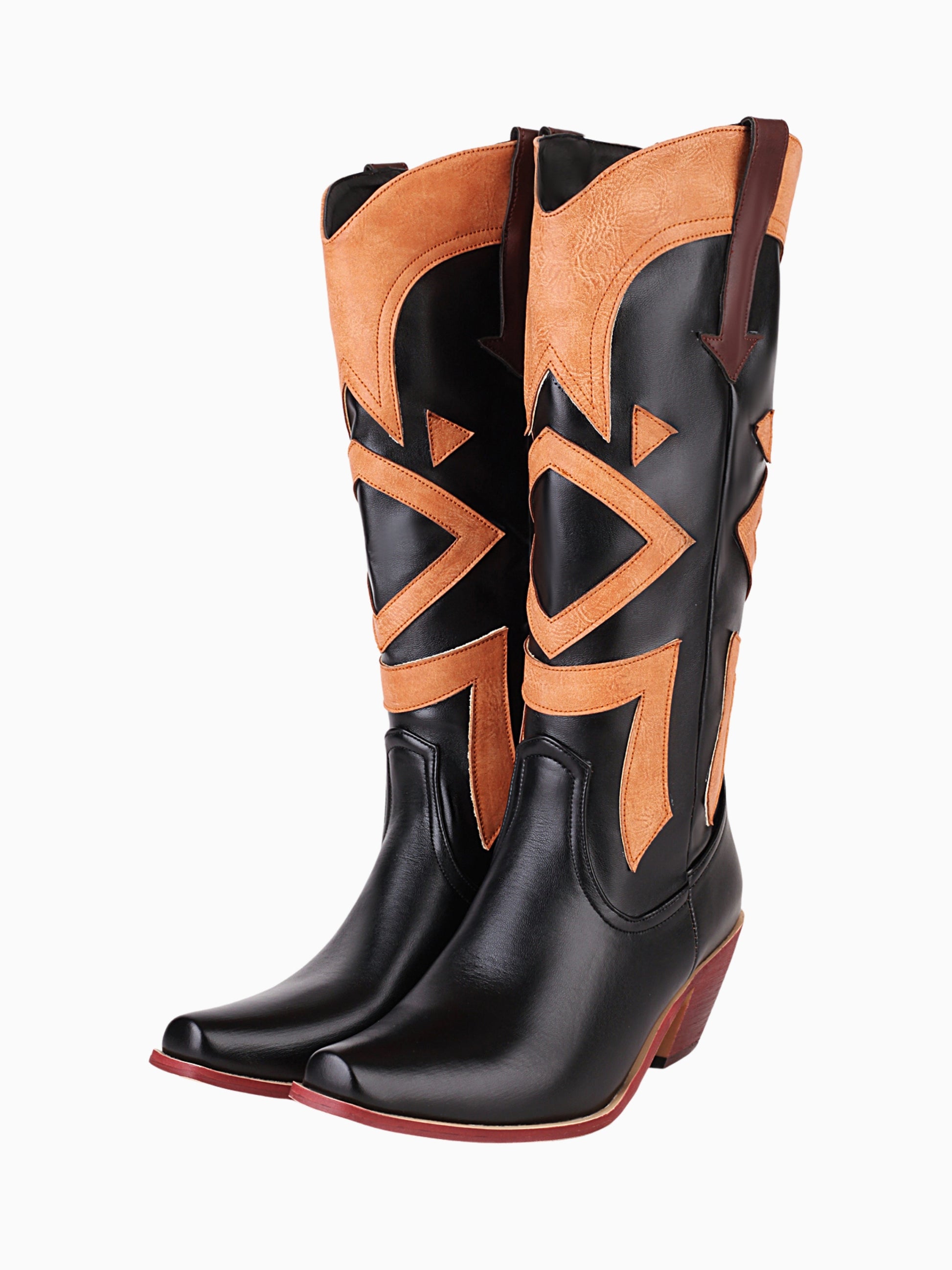 Striking geometric patchwork adorns these bold cowgirl boots in black and tan. The distinctive pattern design pairs with a block heel for statement-making western style.