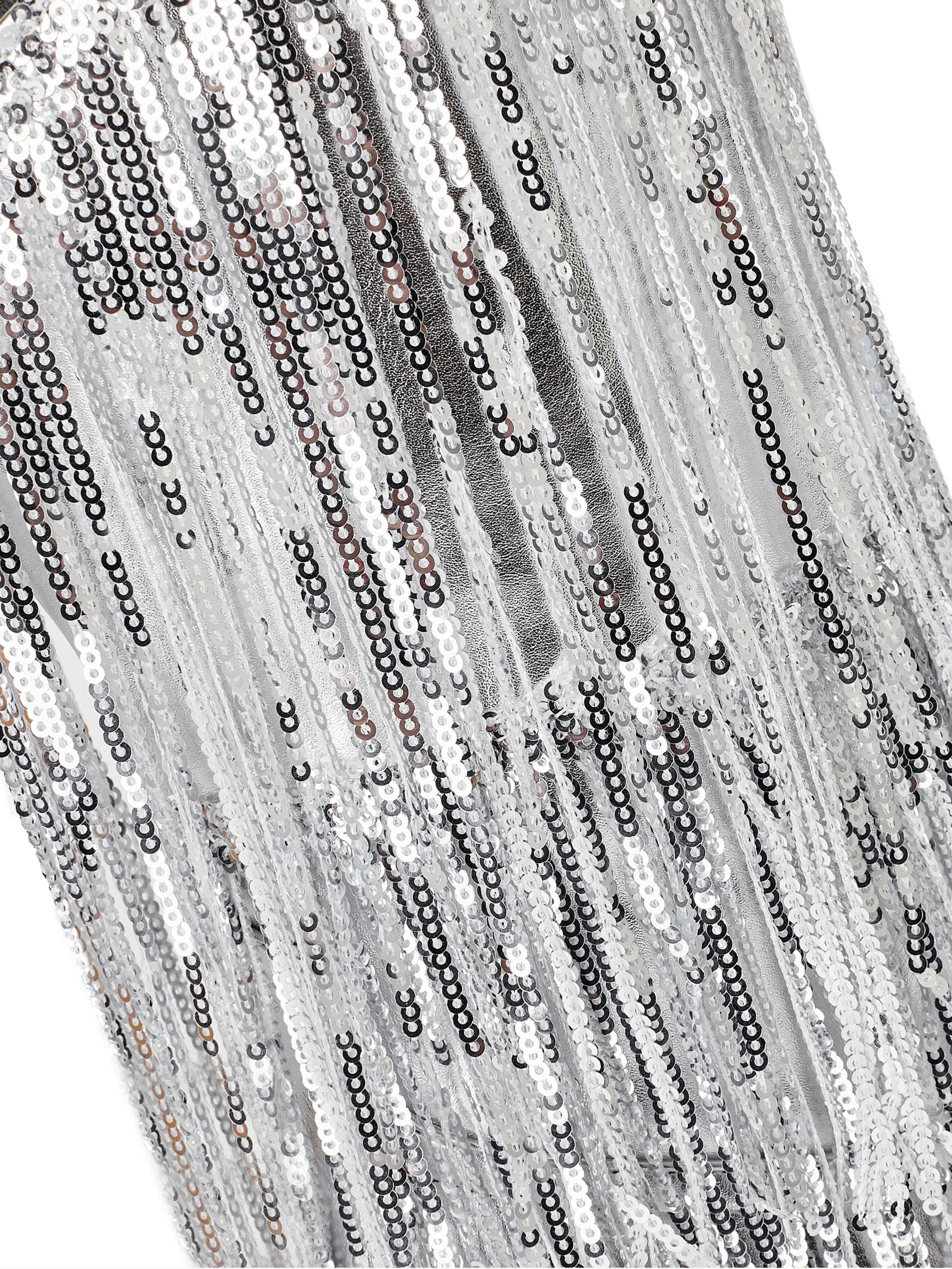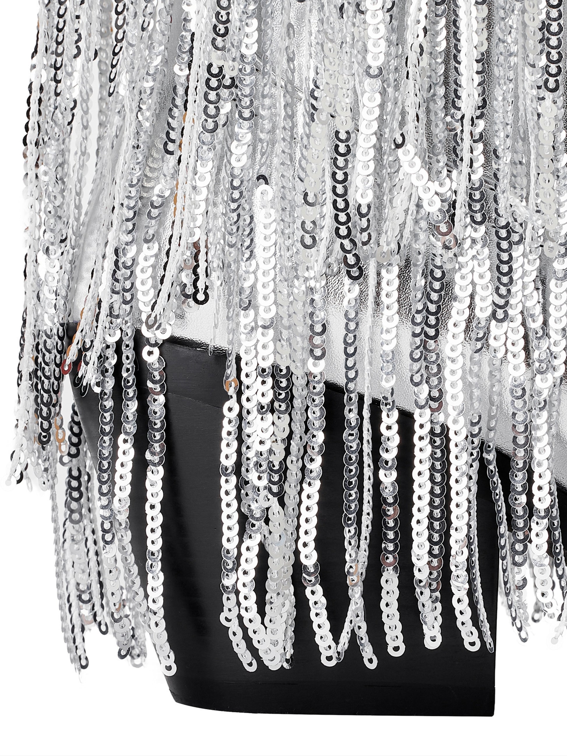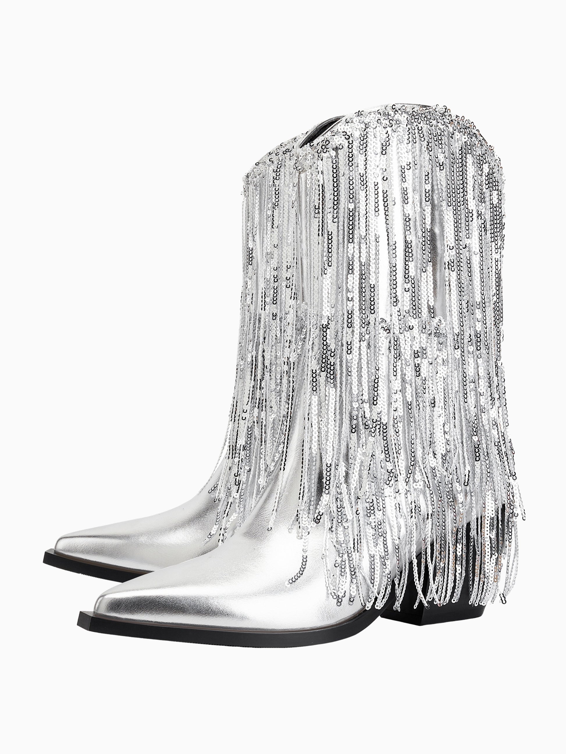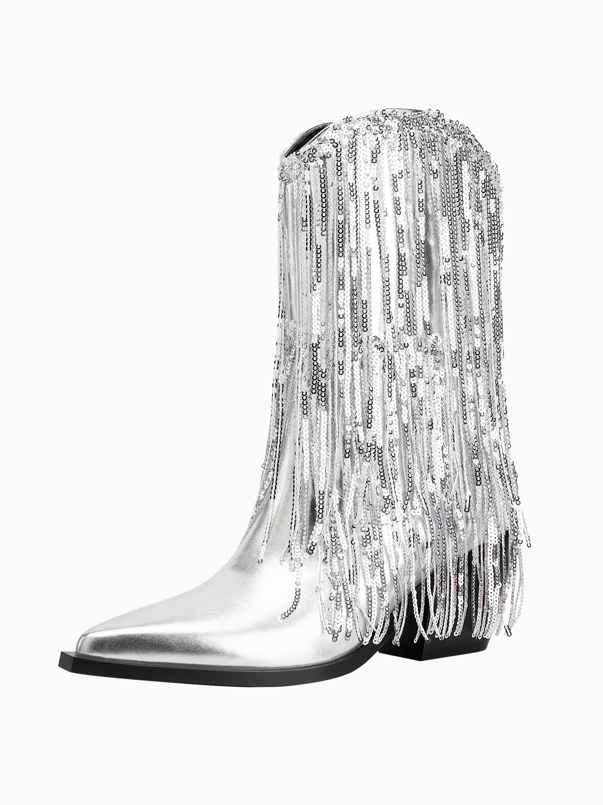 Glamorous fringe cowgirl booties in metallic silver feature shimmering sequin fringe cascade, pointed toe and western heel for dazzling style.
