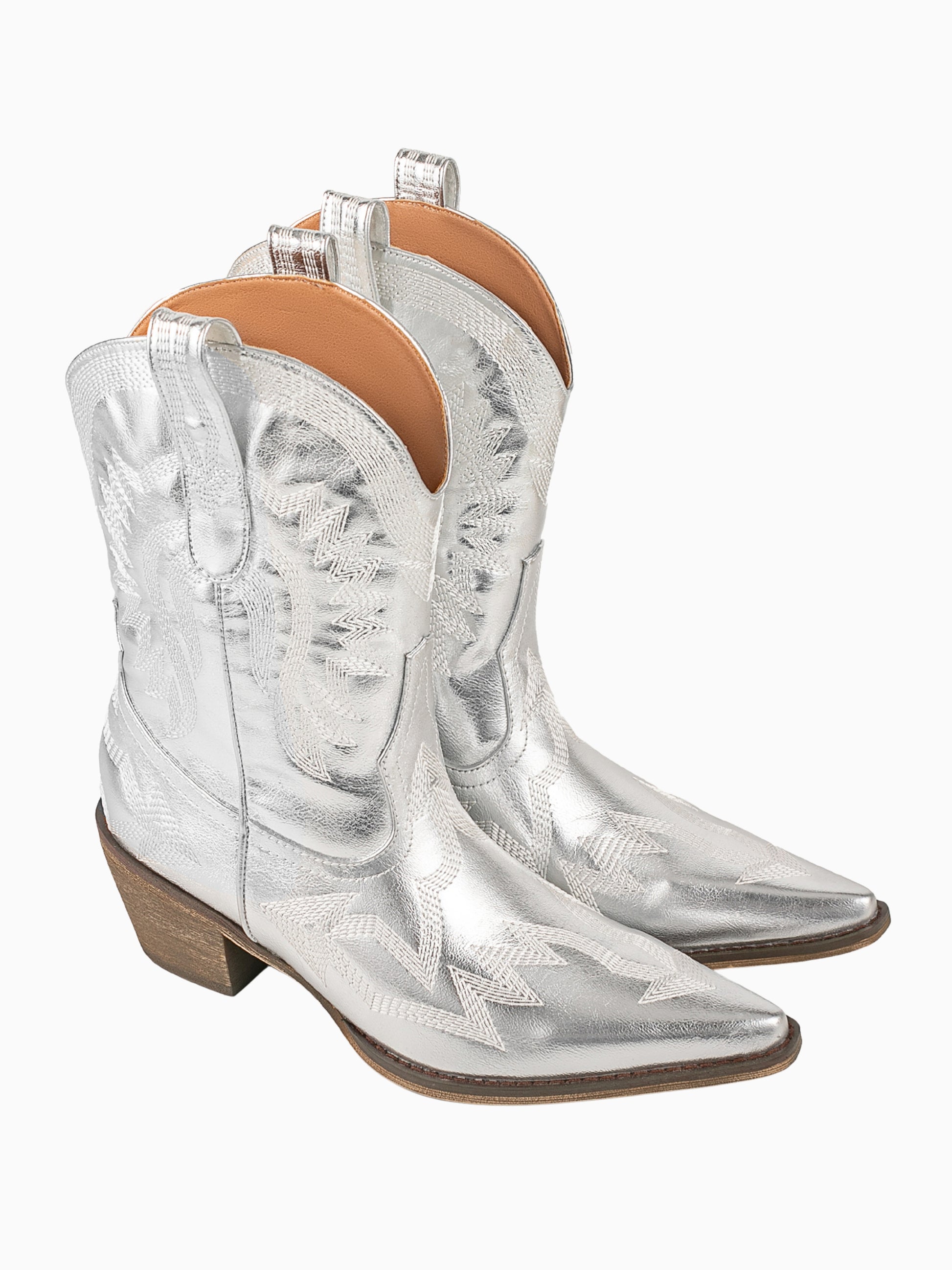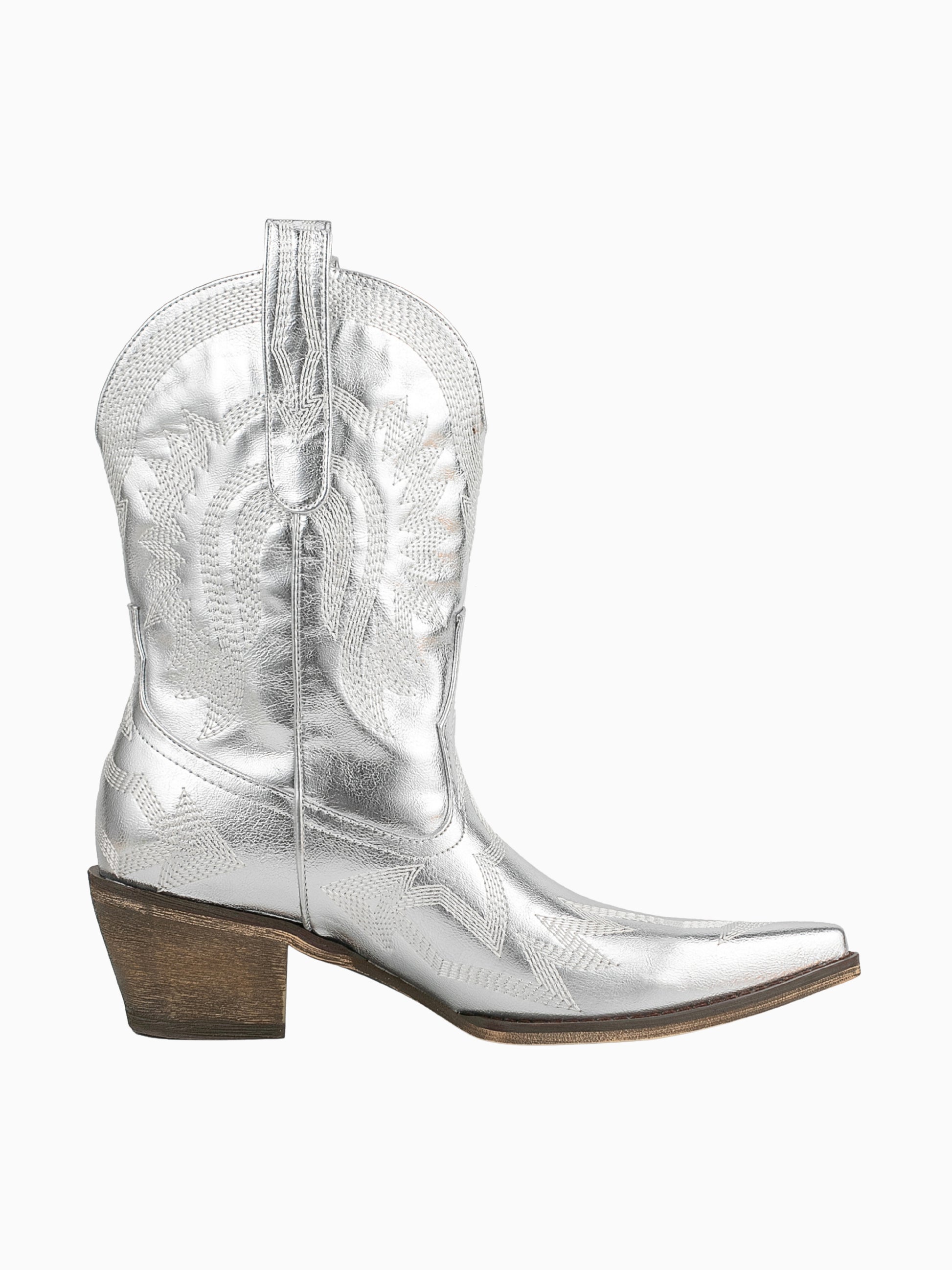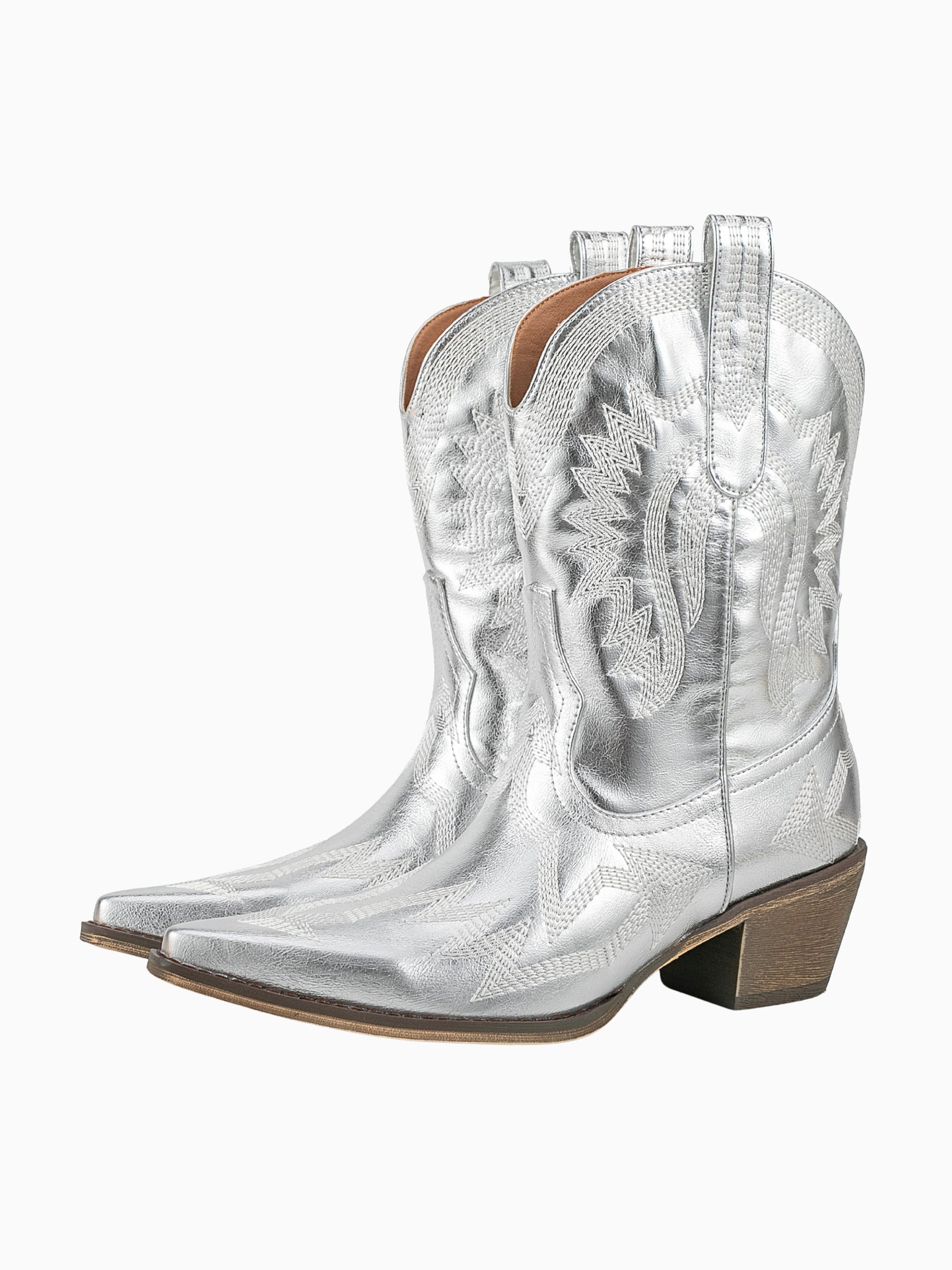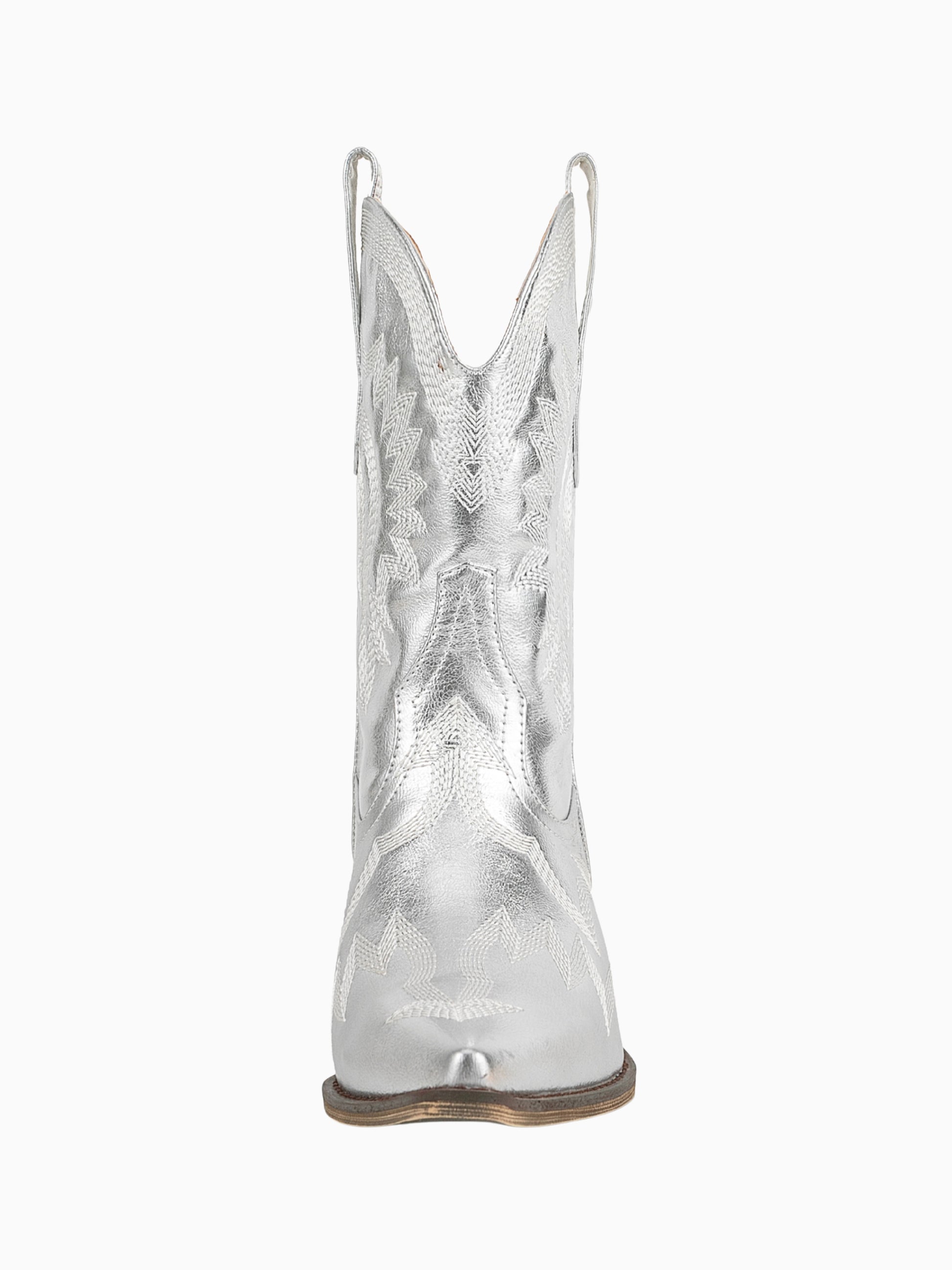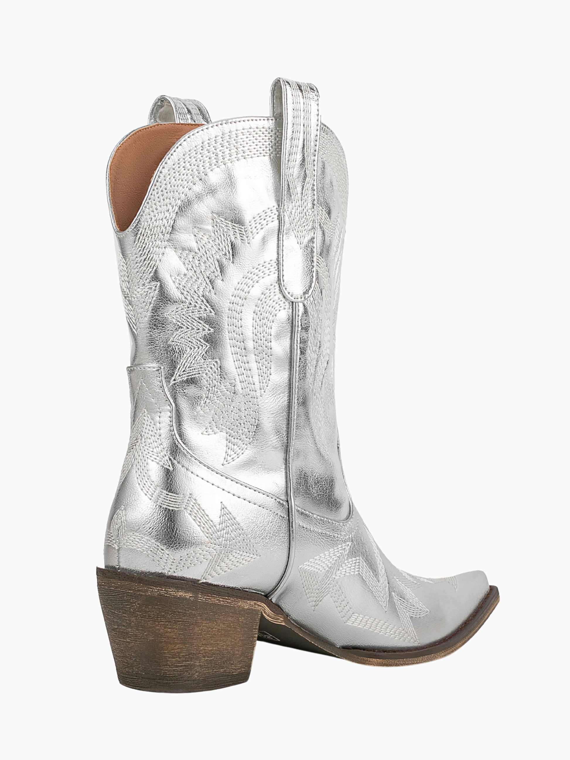 Eye-catching silver Western boots with intricate embroidery patterns, standout metallic finish, and stacked heel - perfect for the fashion-forward cowgirl.