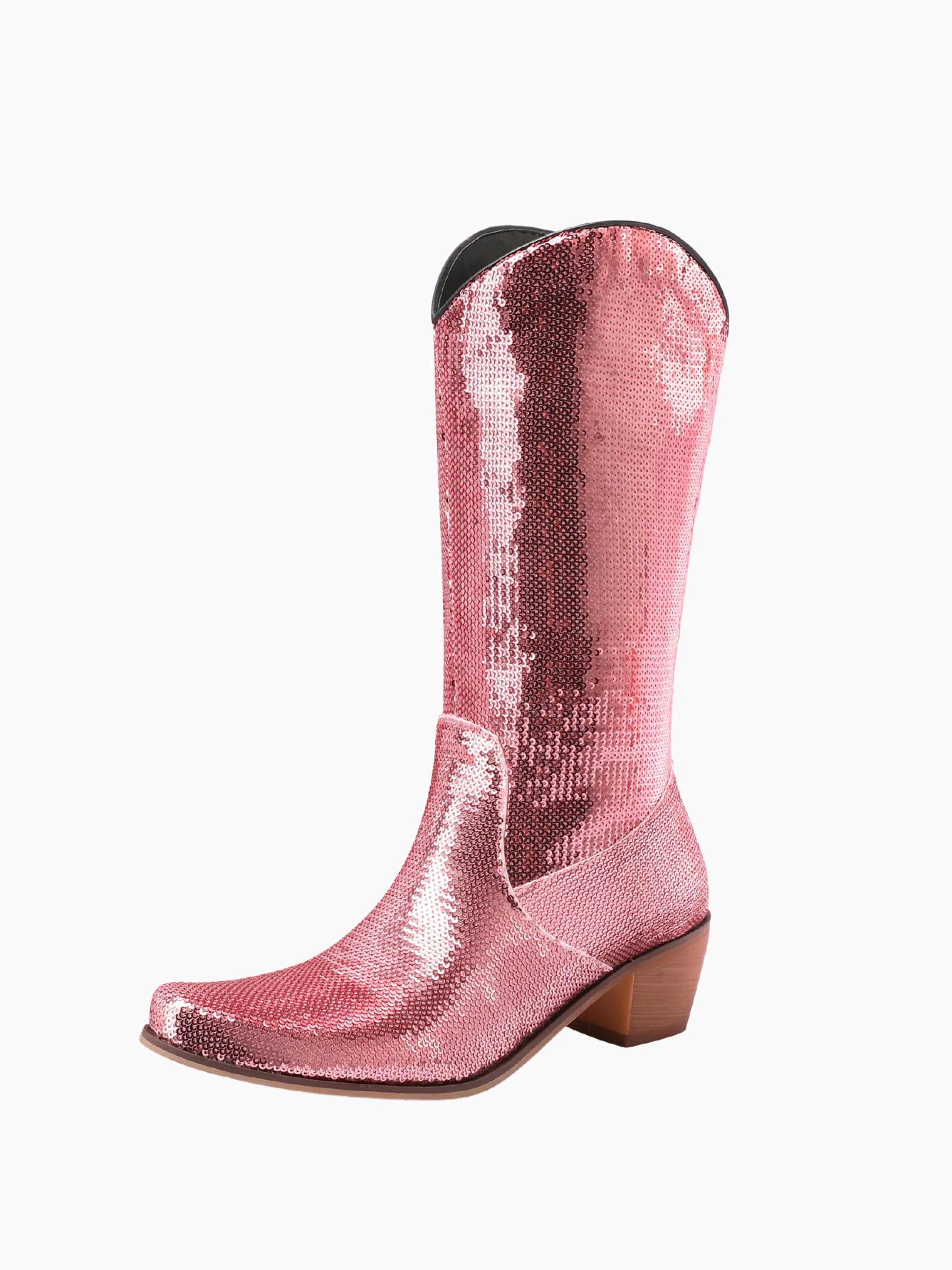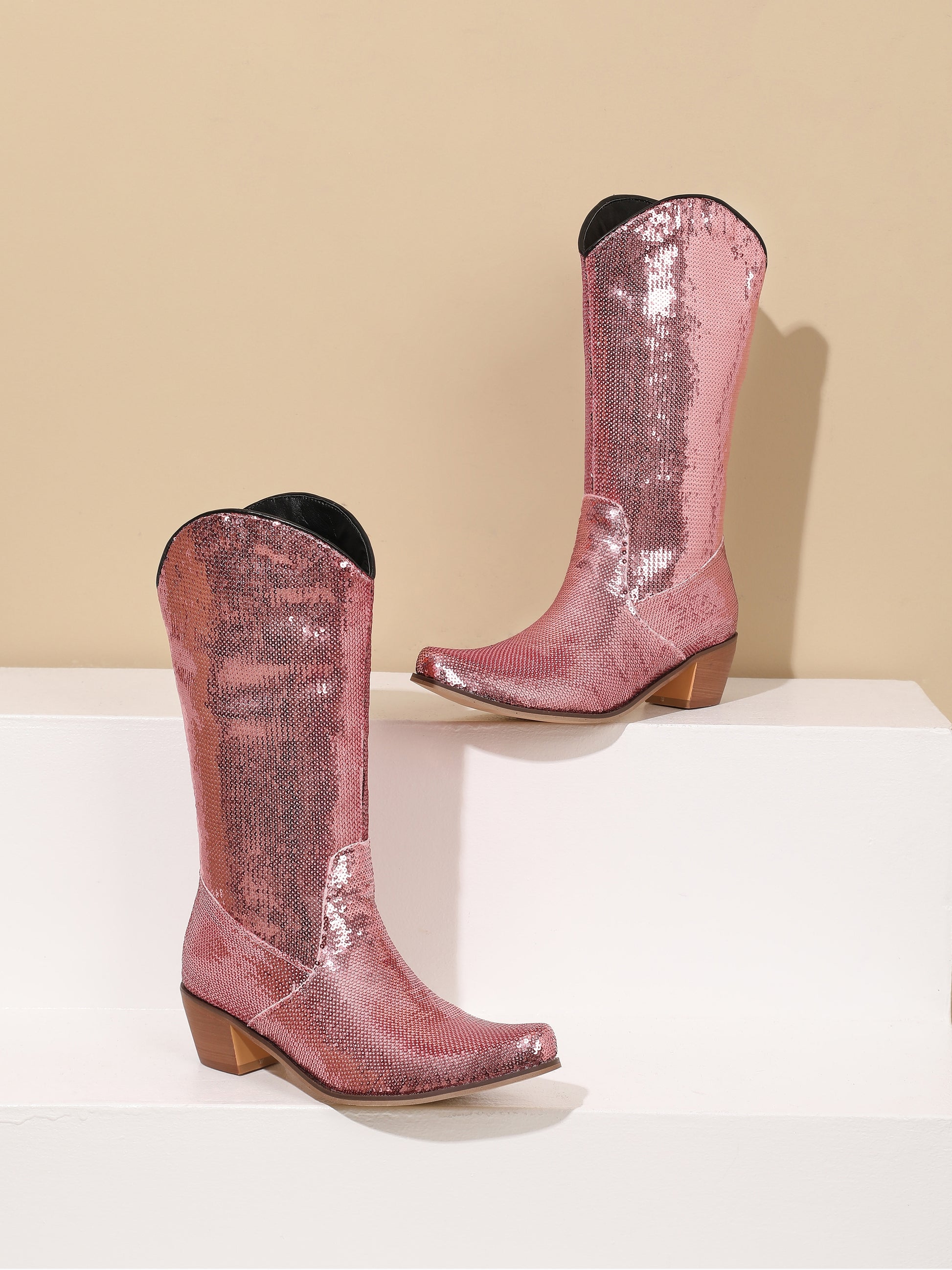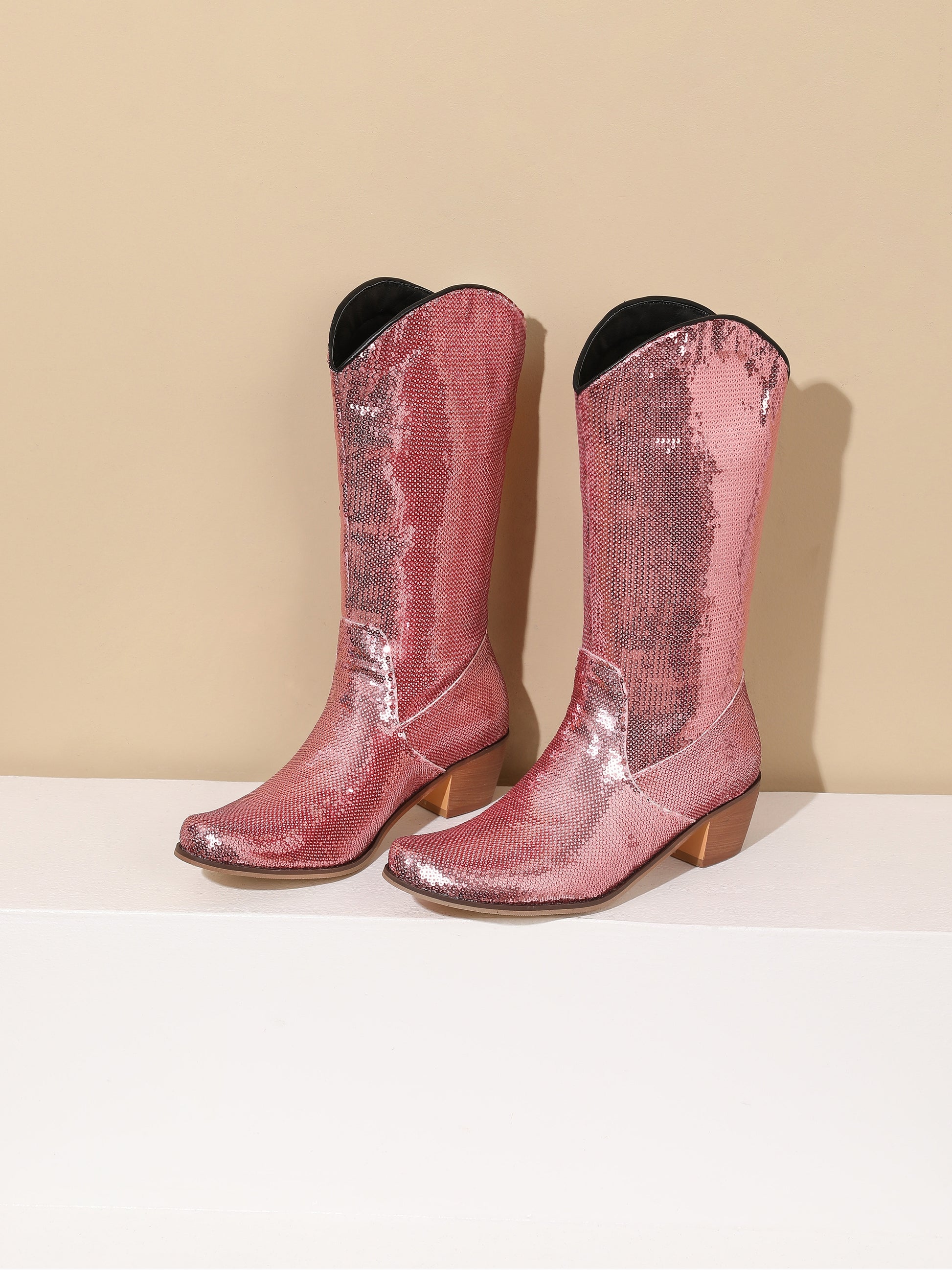 Pink Sequined Square-Toe Mid-Calf Glam Cowgirl Boots