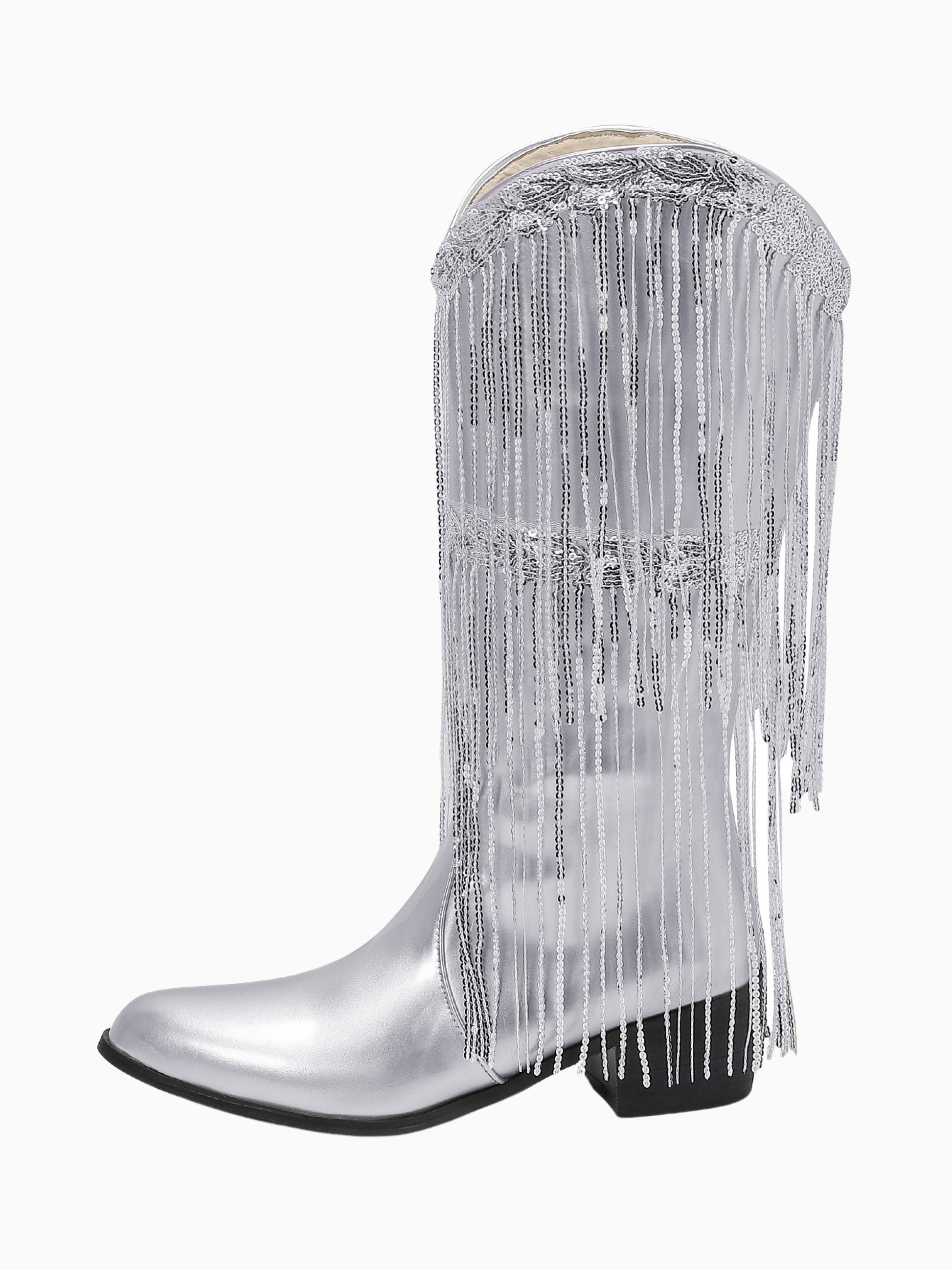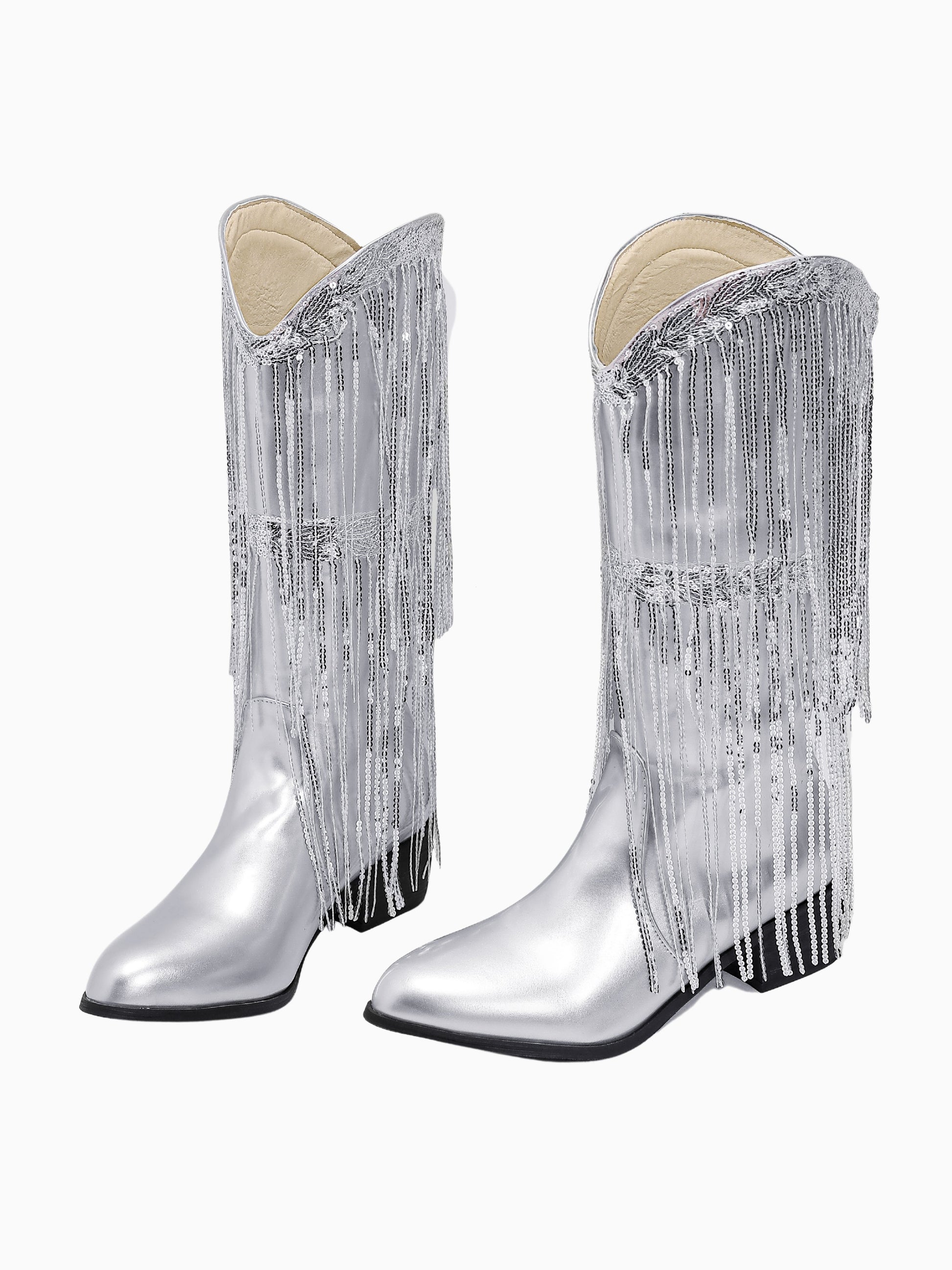 Statement-making mid-calf silver cowgirl boots adorned with glittering tassel fringe details. The classic western silhouette and shimmering embellishments create a show-stopping look perfect for special events.