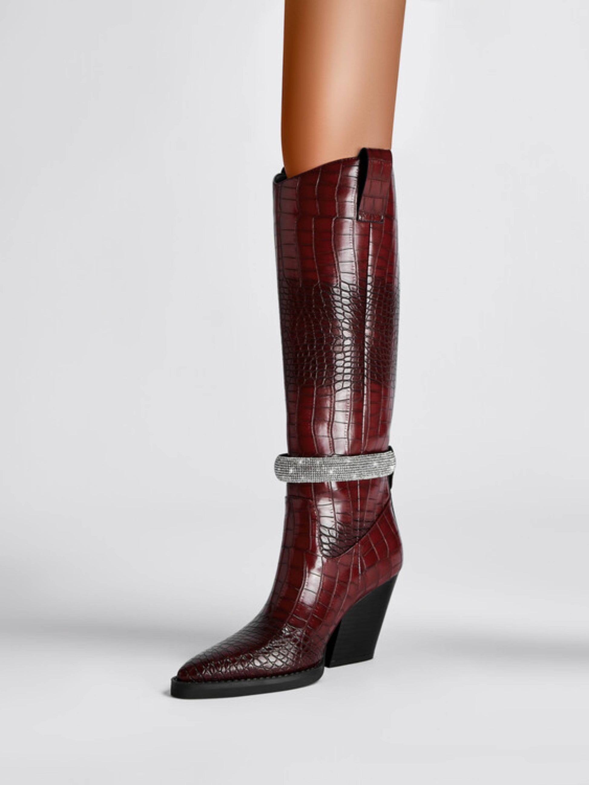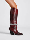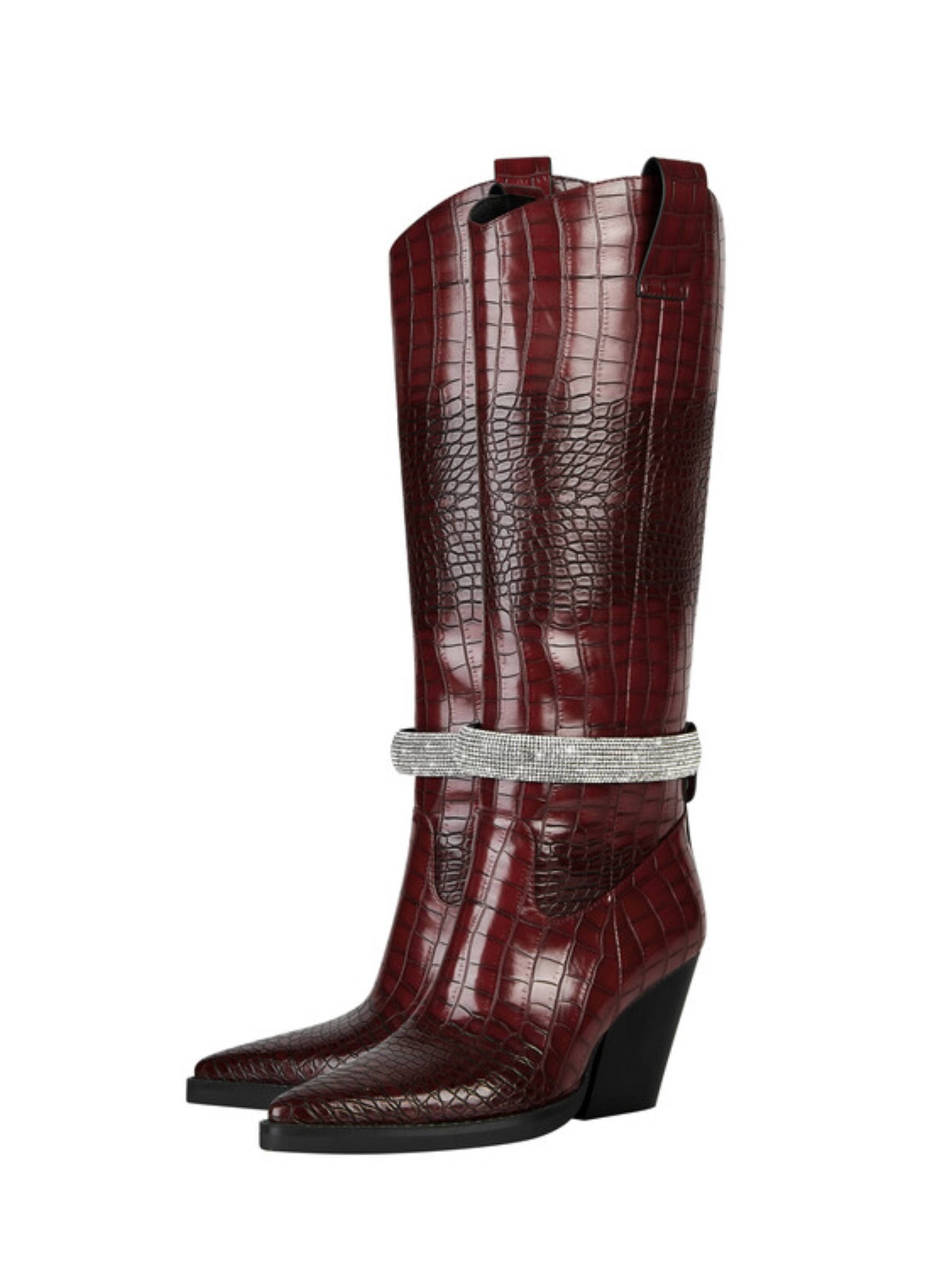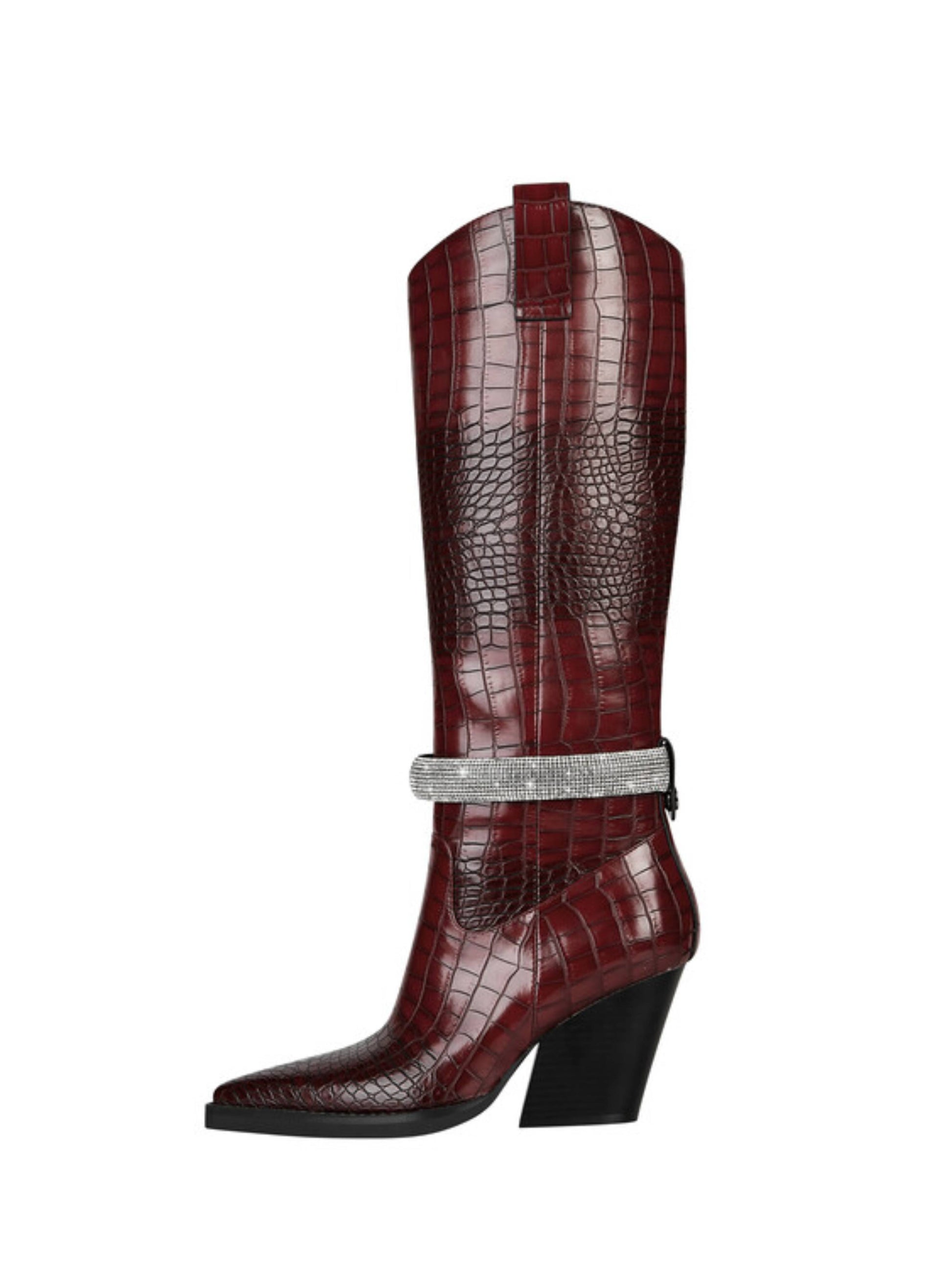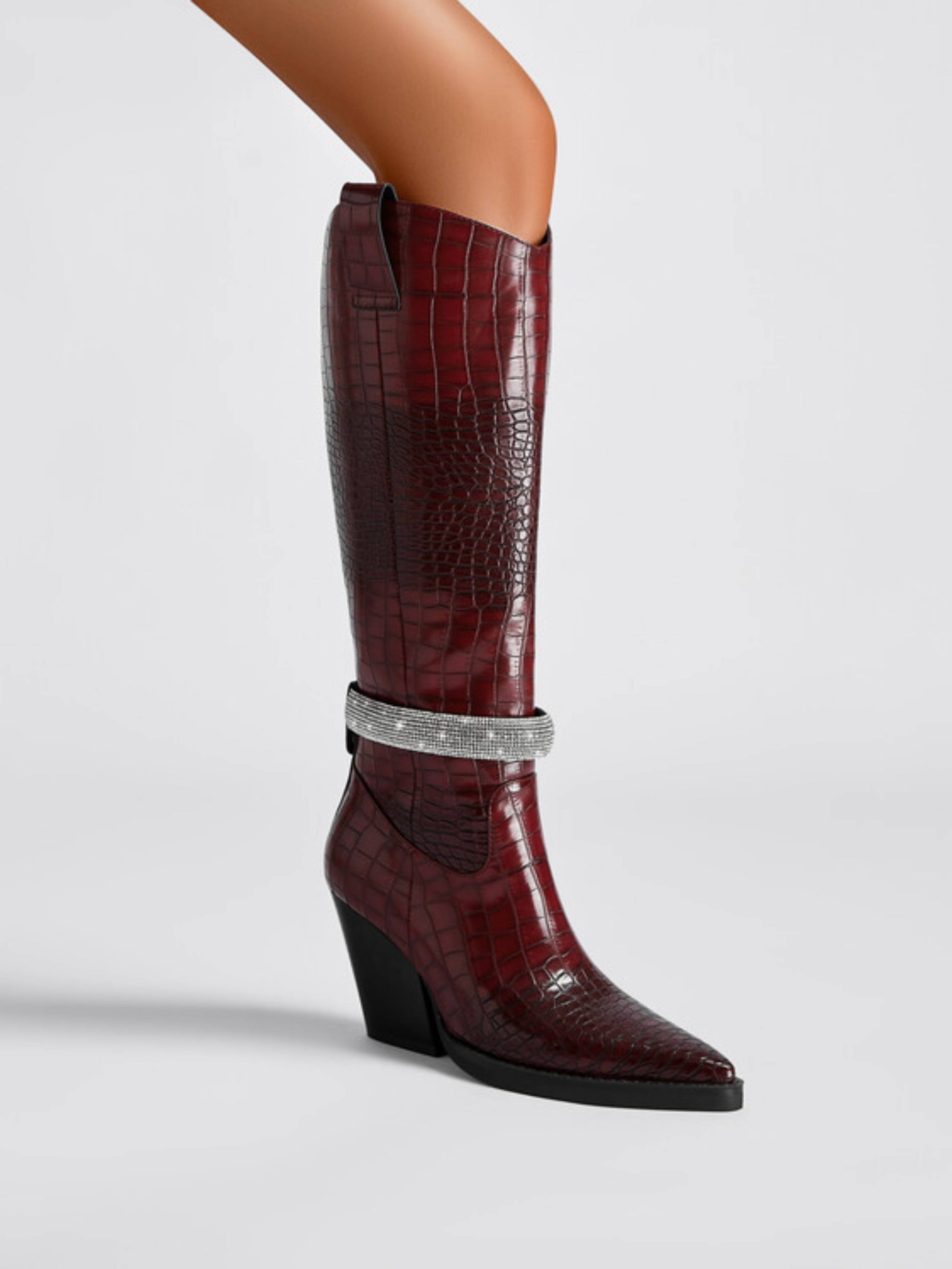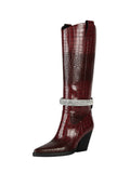 Sparkly Strap Dark Burgundy Embossed Knee High Cowgirl Boots