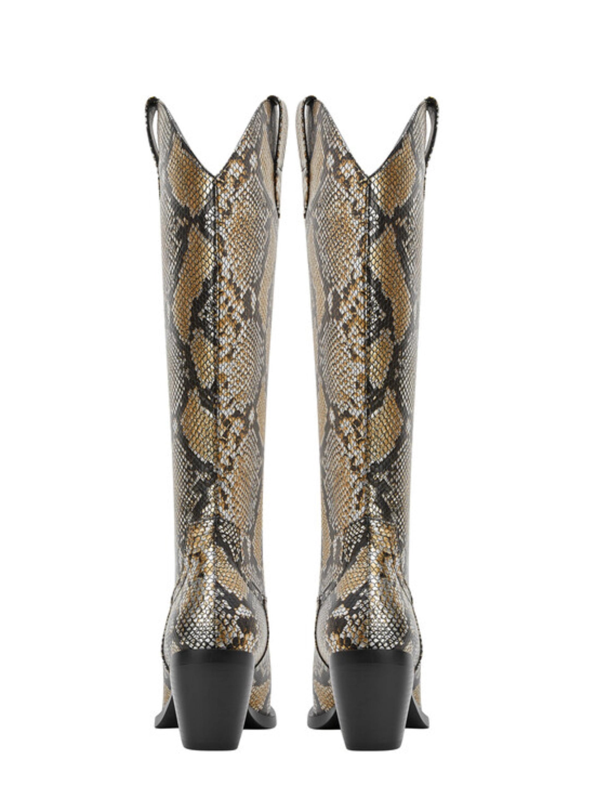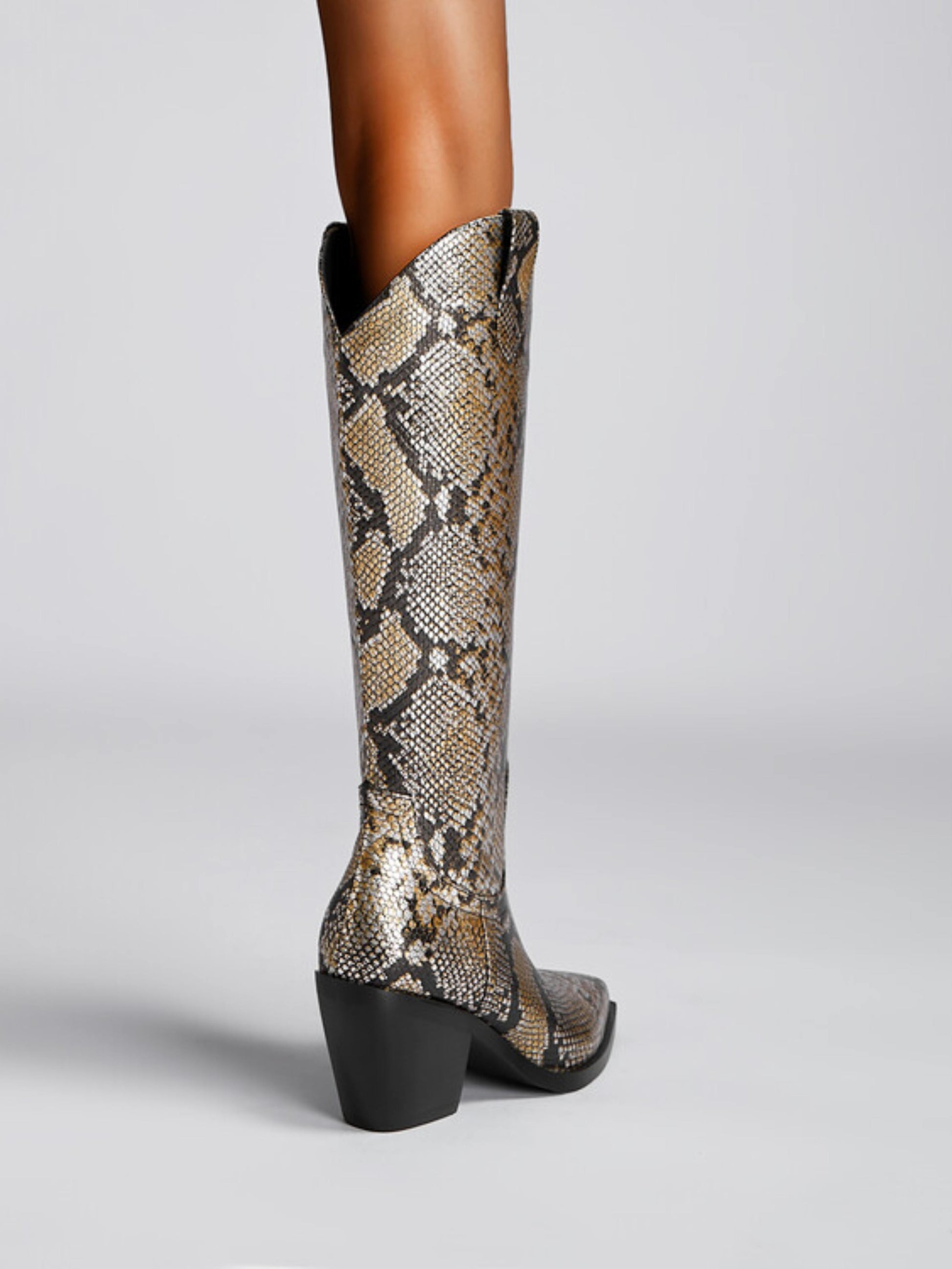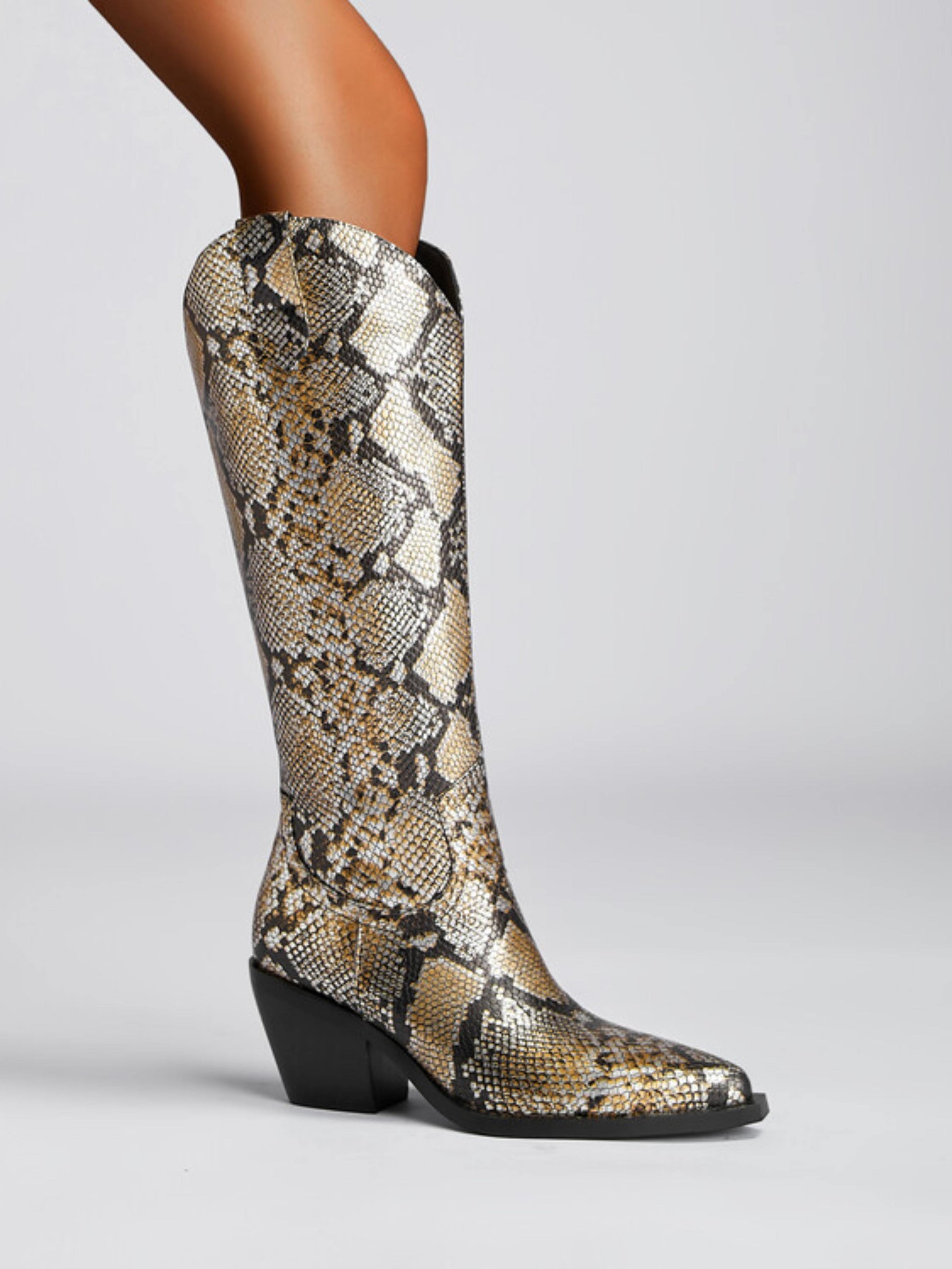These stunning gold python print knee high western boots offer luxurious style for women. Featuring exotic snake pattern design, these tall cowboy boots combine fashion-forward appeal with authentic western charm.