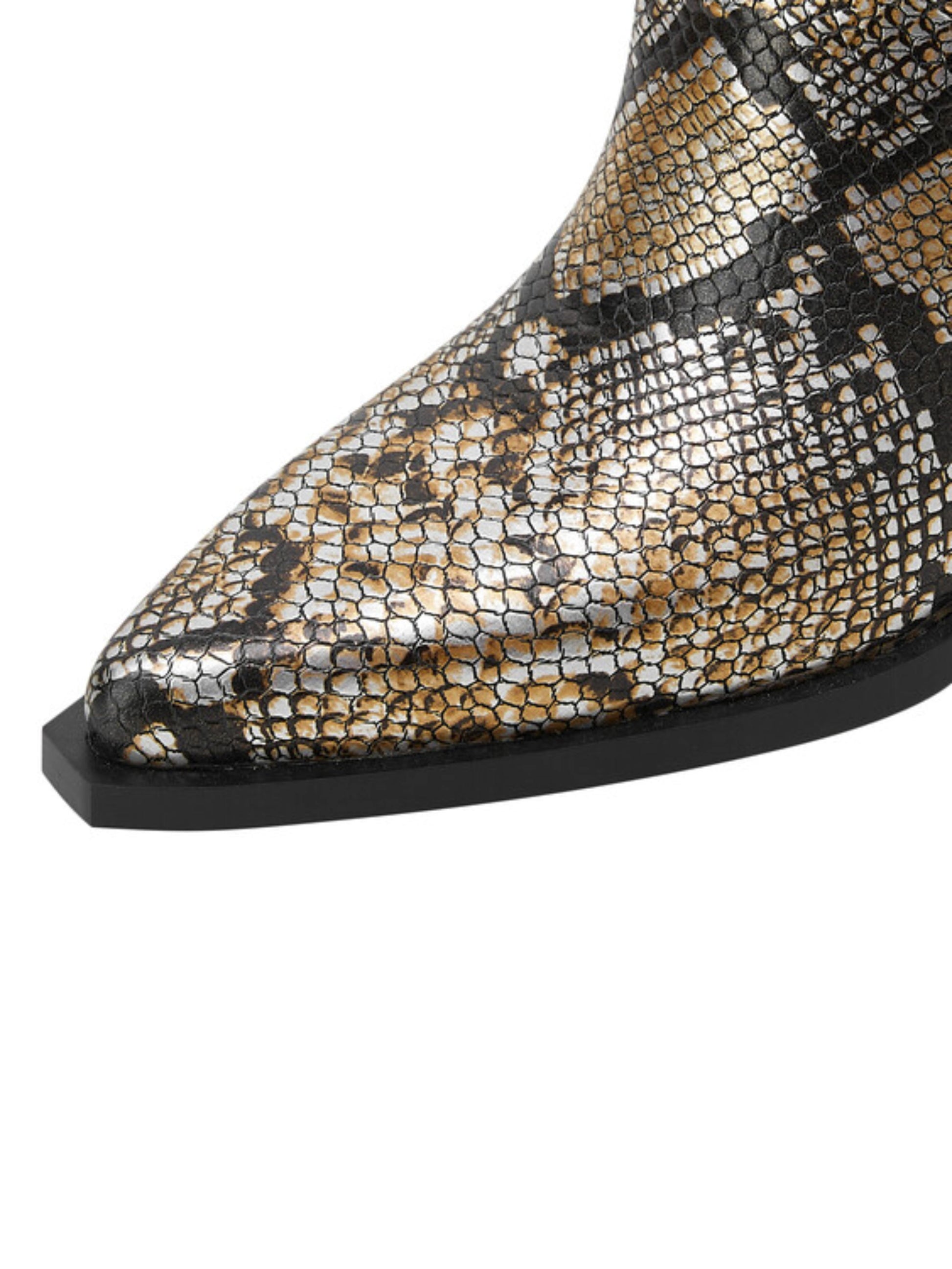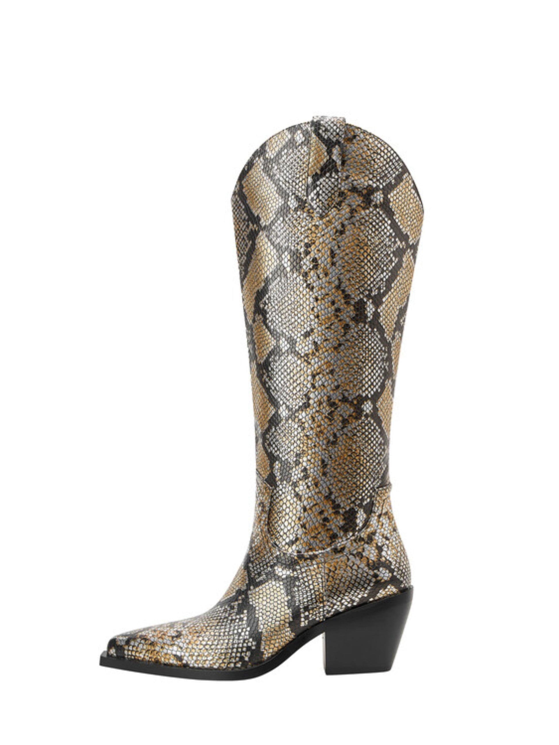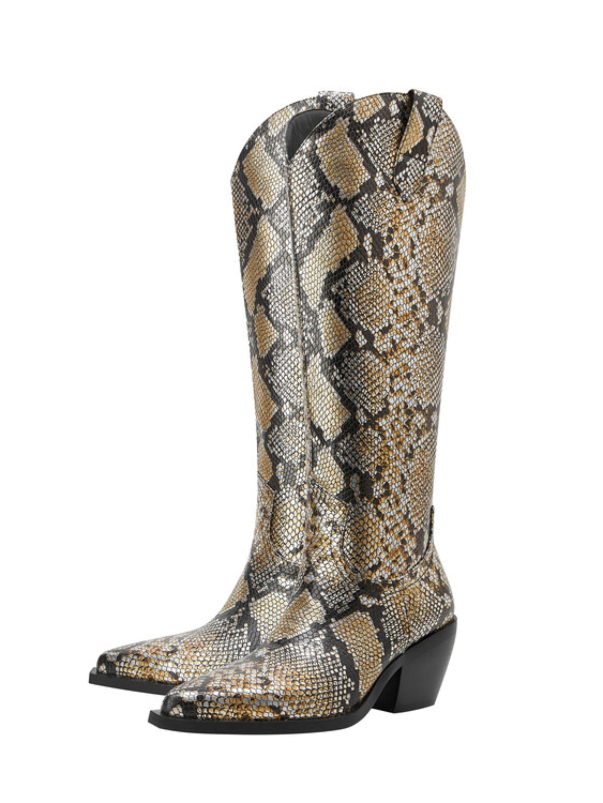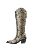 These stunning gold python print knee high western boots offer luxurious style for women. Featuring exotic snake pattern design, these tall cowboy boots combine fashion-forward appeal with authentic western charm.