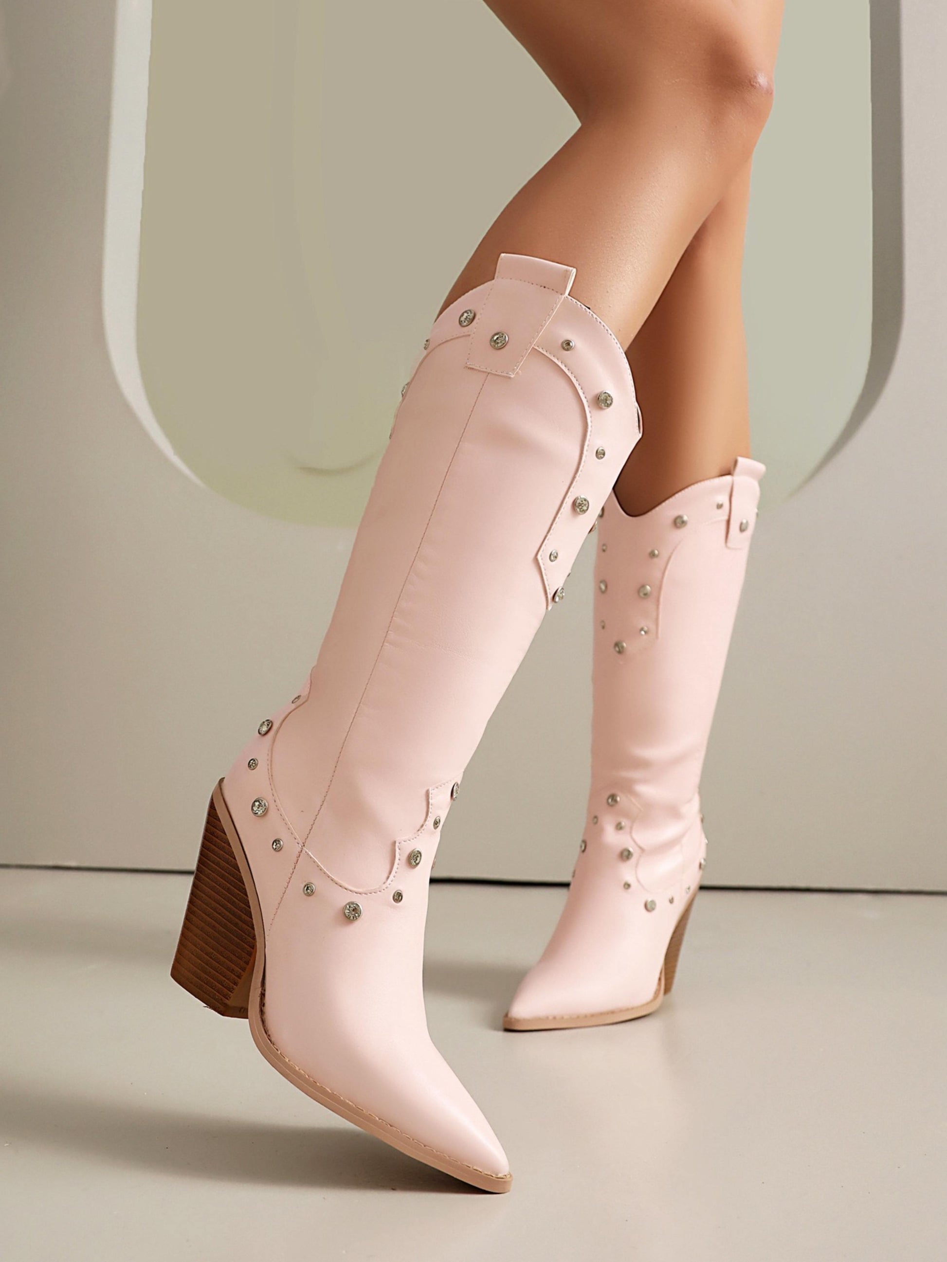 Light Pink Mid-Calf Studded High Heel Cowgirl Boots feature a western style, rhinestone studds, mid-calf length, and comfortable block high-heel design.
