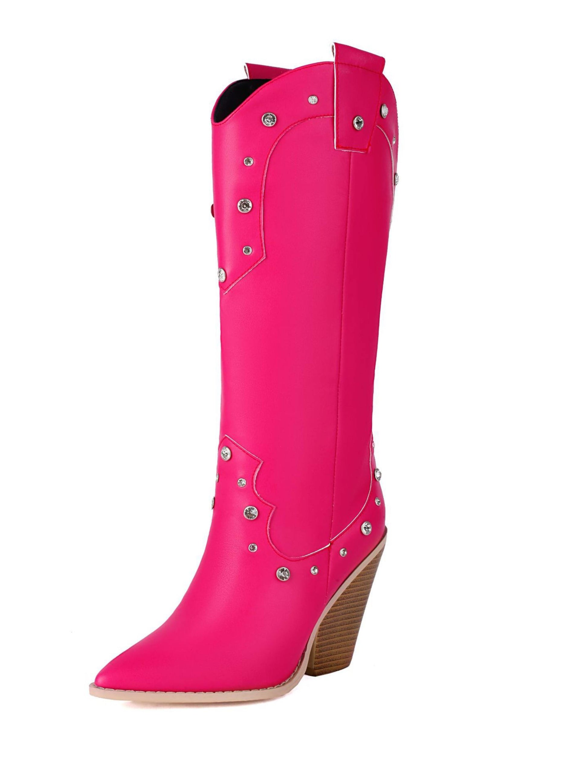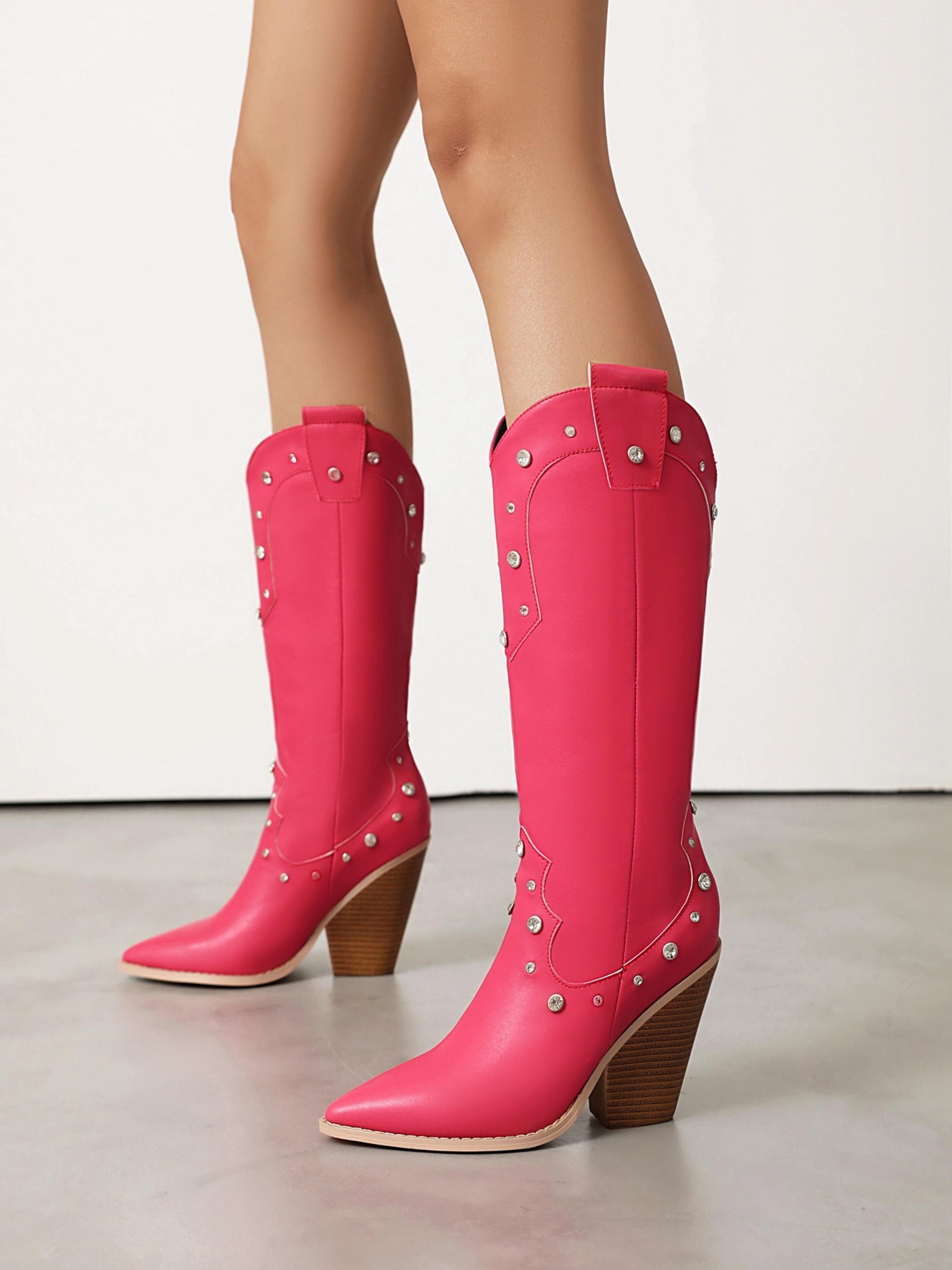 Rhinestone Studded Hot Pink Cowgirl Boots with Heel feature a western style, rhinestone studds, mid-calf length, and comfortable block high-heel design.