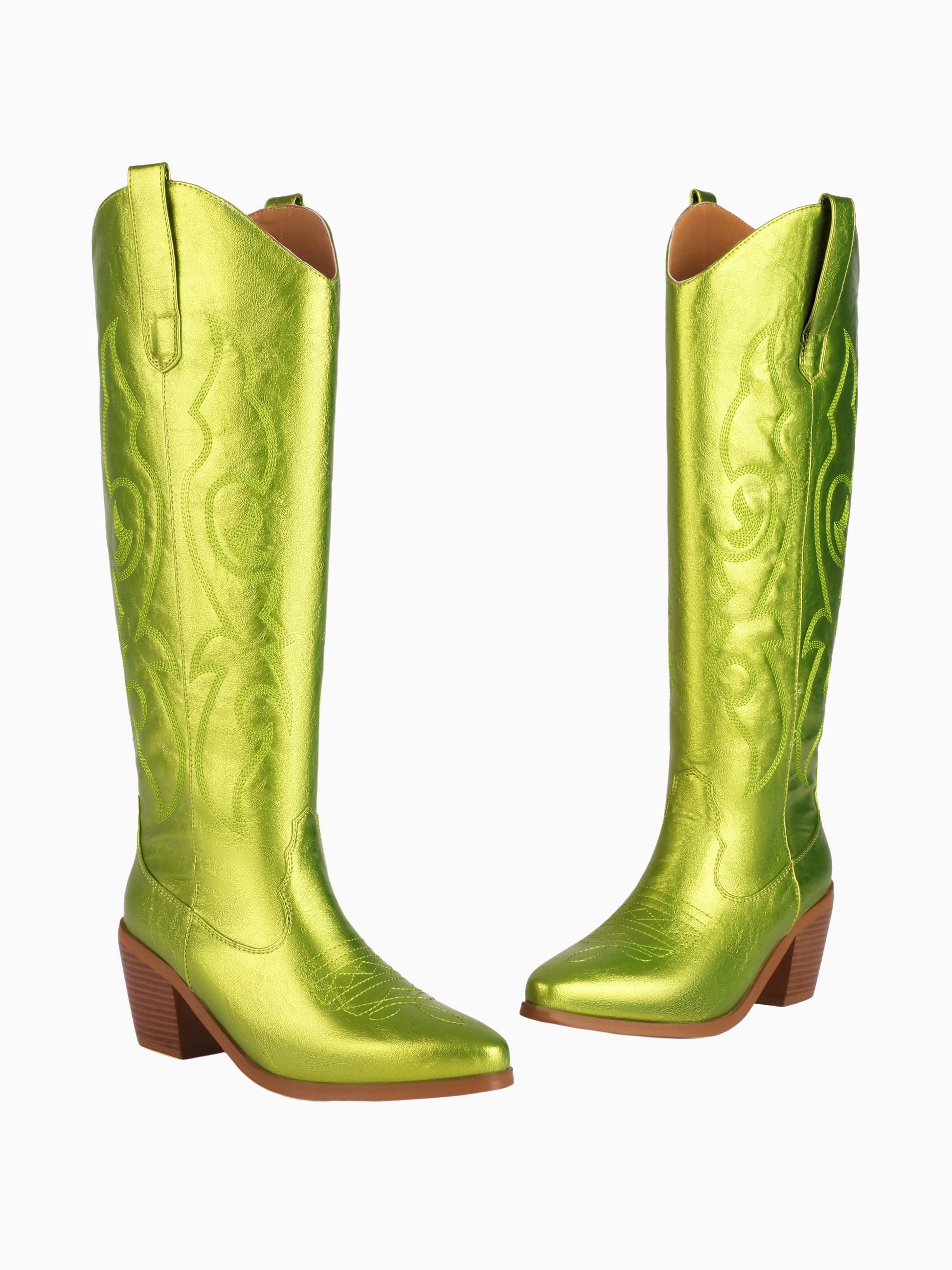 Elevate your Western style with these metallic lime-green cowgirl boots. Featuring classic embroidered details, comfortable stacked heel and knee-high design, perfect for making a bold fashion statement at any occasion.