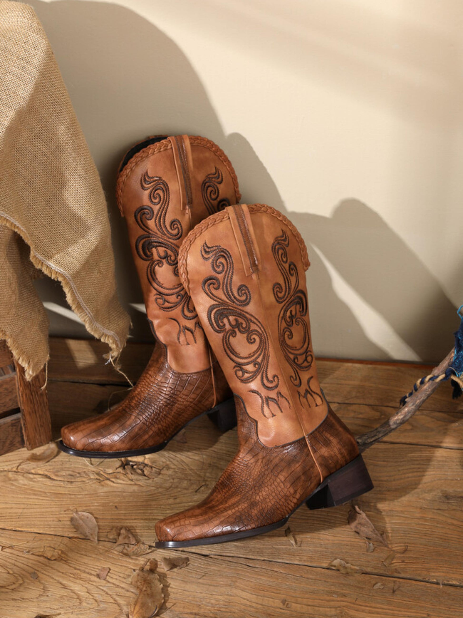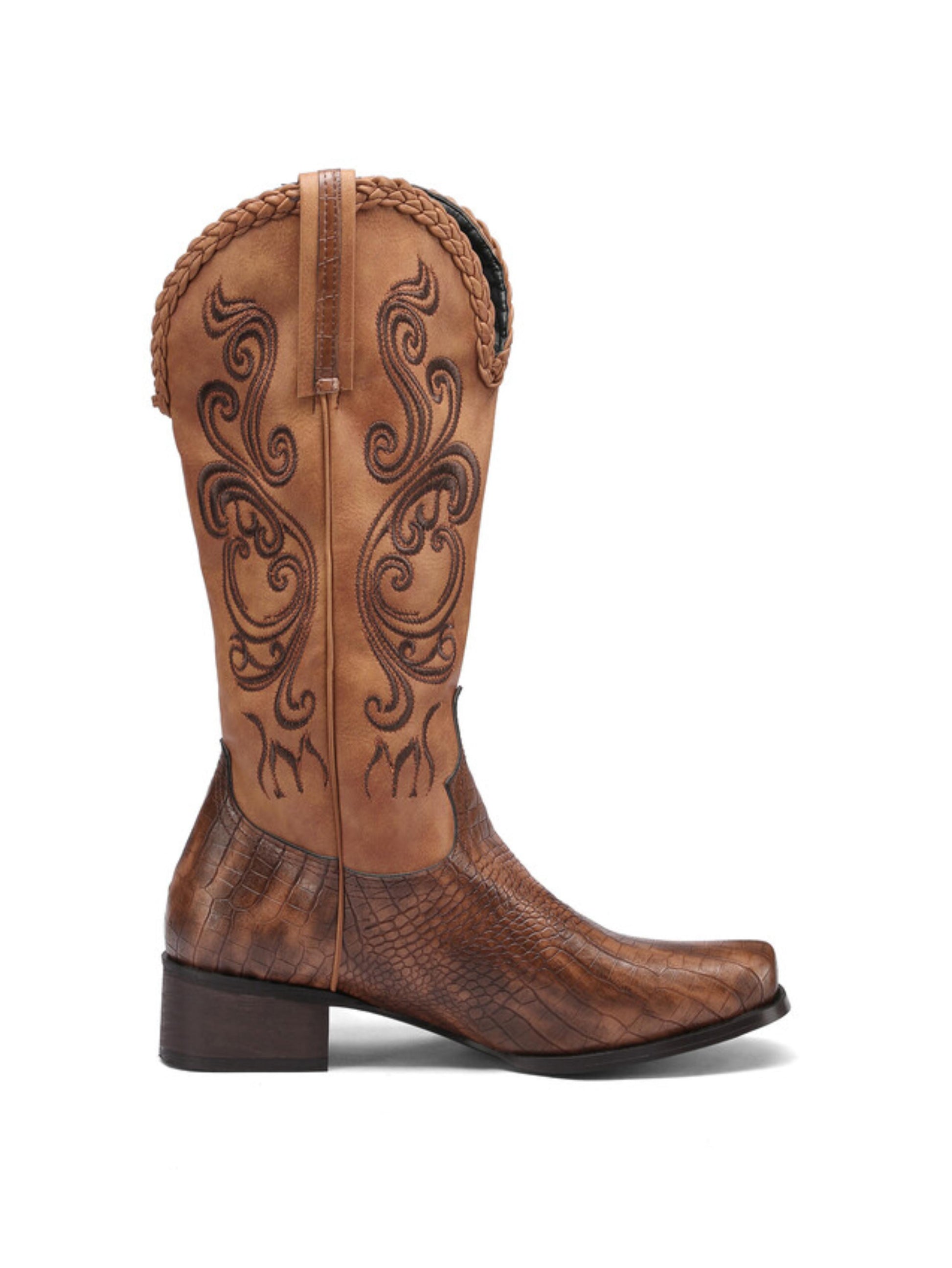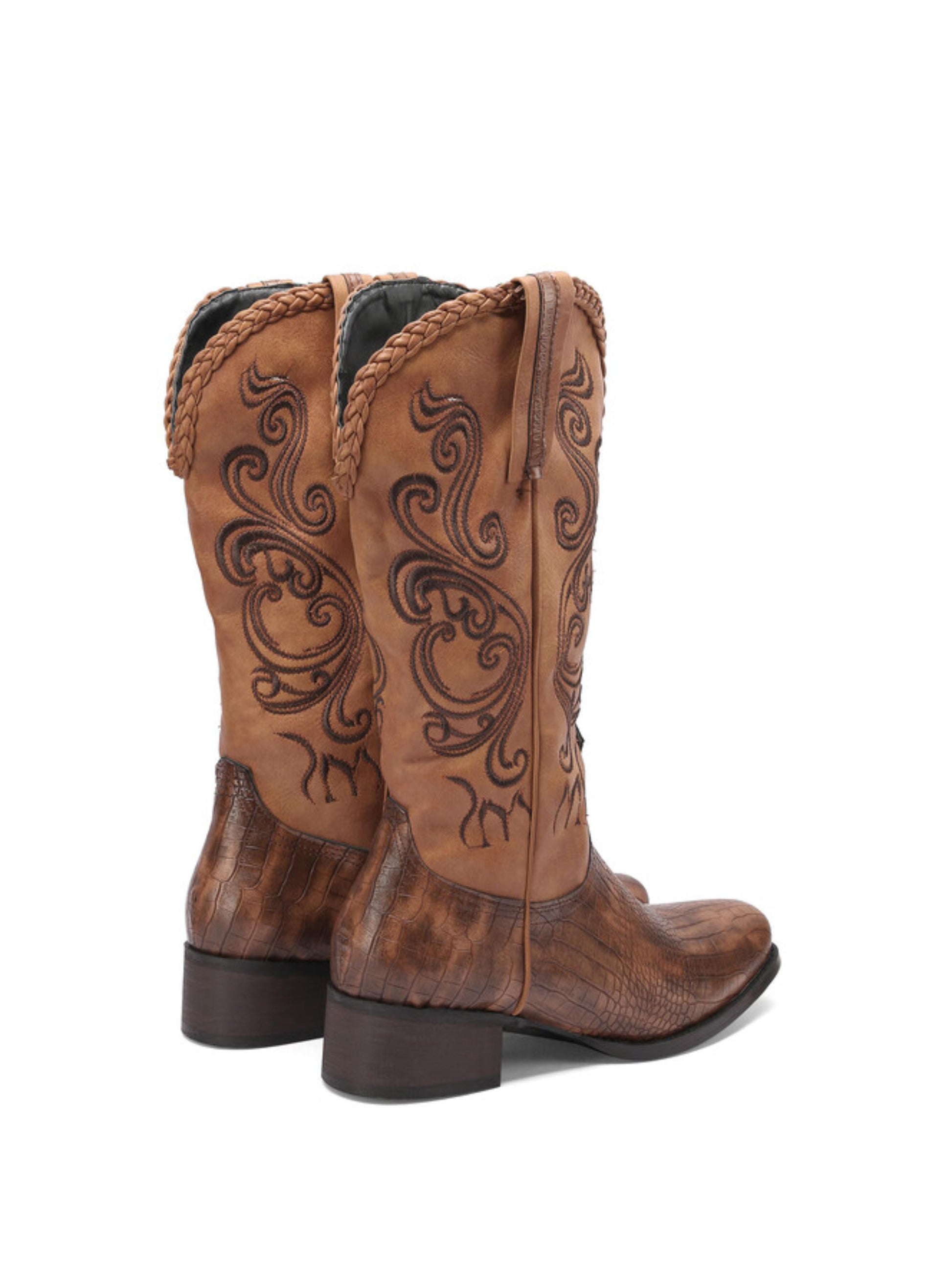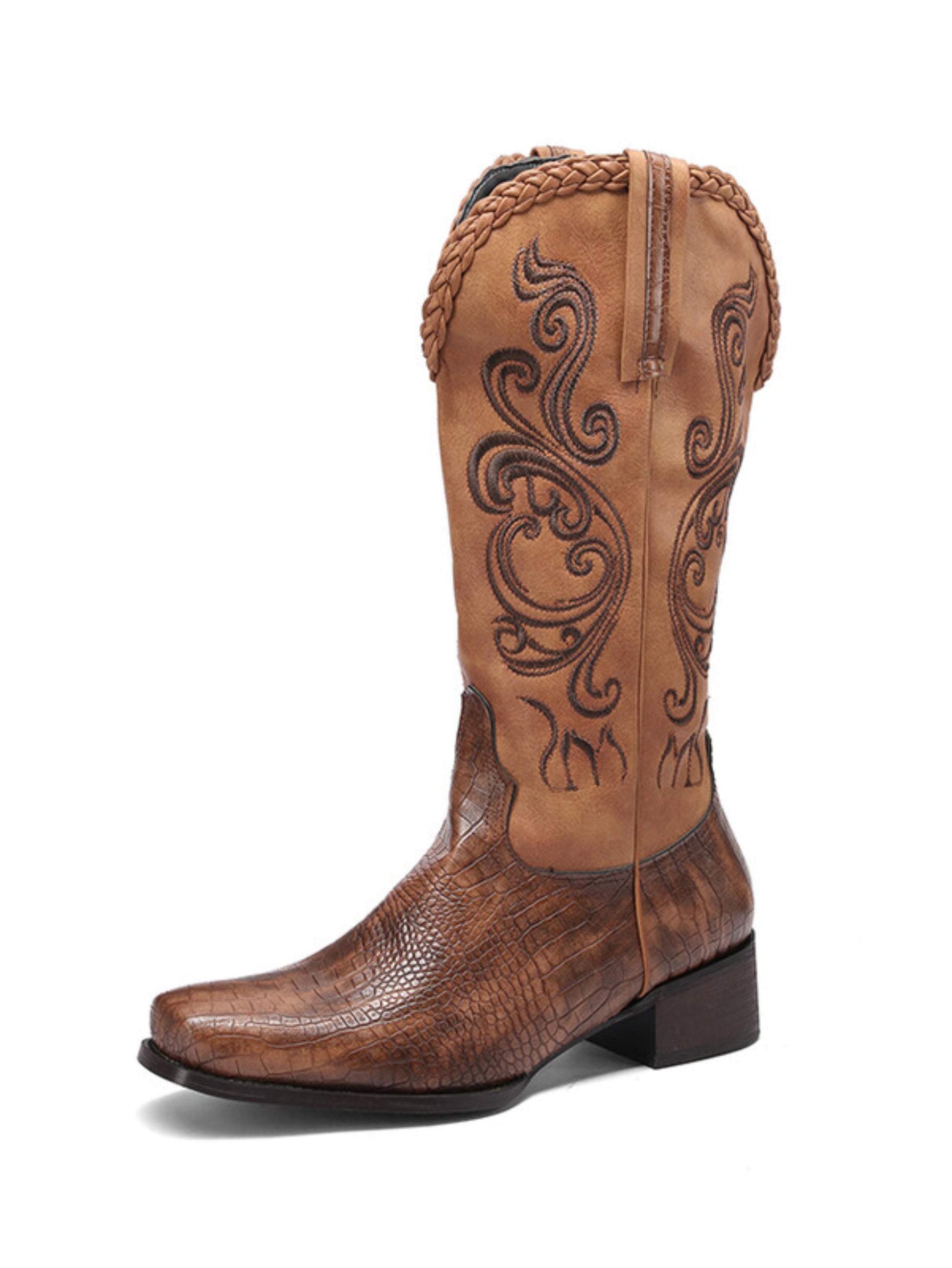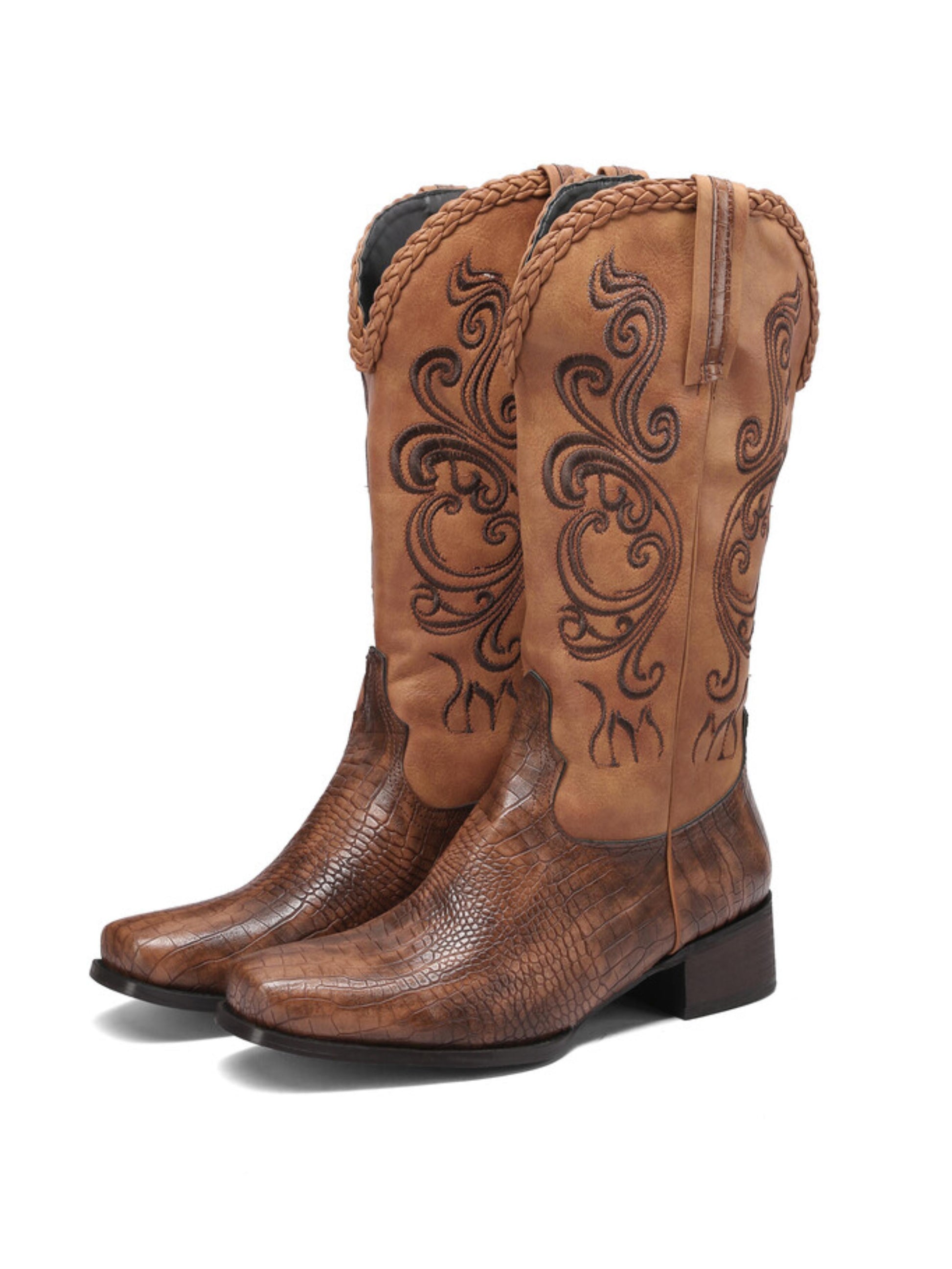 Brown cowgirl boots featuring lizard pattern embossed faux leather, square toe design, decorative embroidery, and mid calf height. Exotic textured western boots perfect for country fashion, rodeos, and statement wear, combining authentic cowgirl styling with luxurious embossed finish and intricate embroidered details.