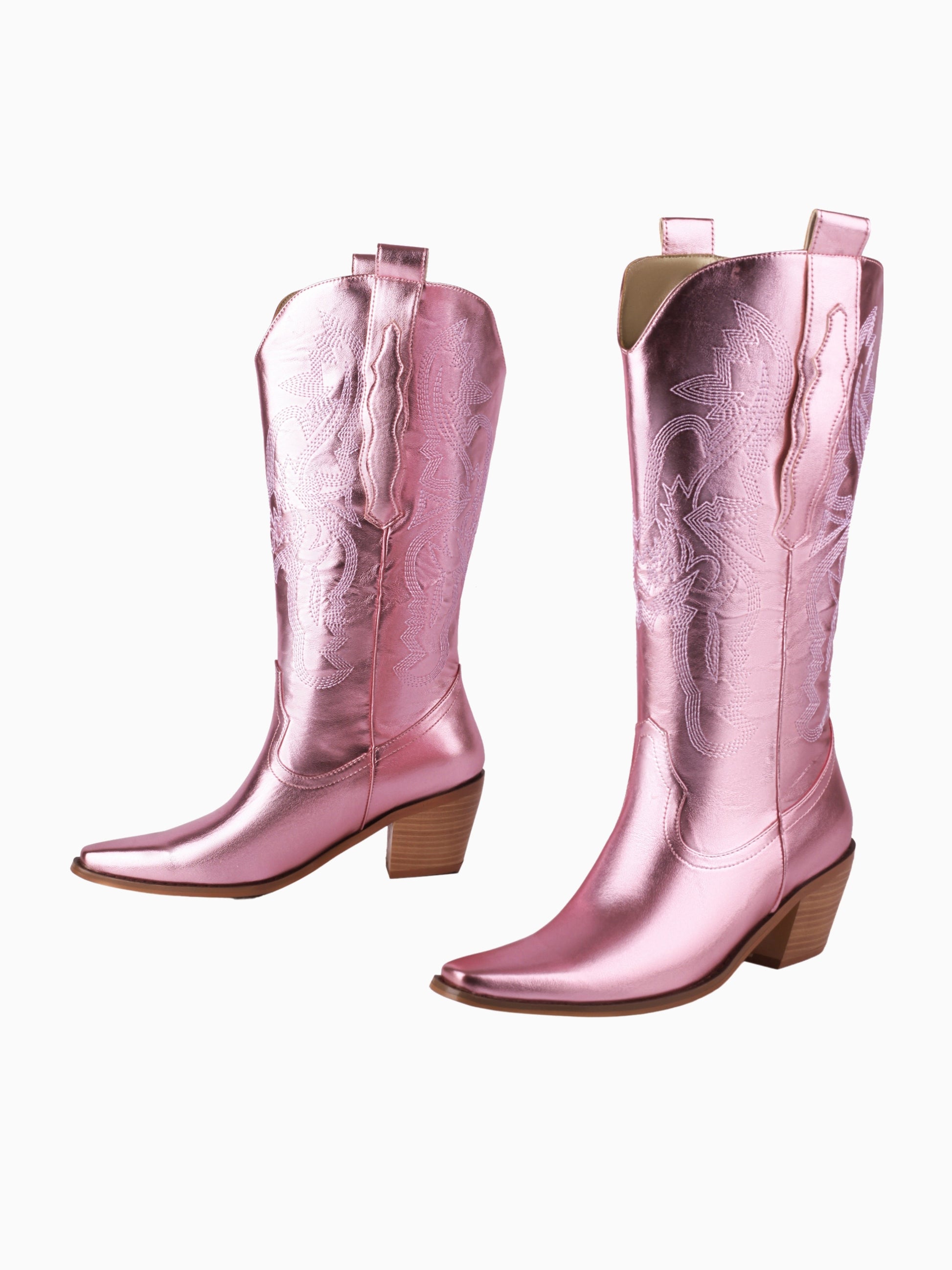Metallic pink Western boots with intricate embroidered patterns, stacked heels, and pointed toes are perfect for making a bold fashion statement.
